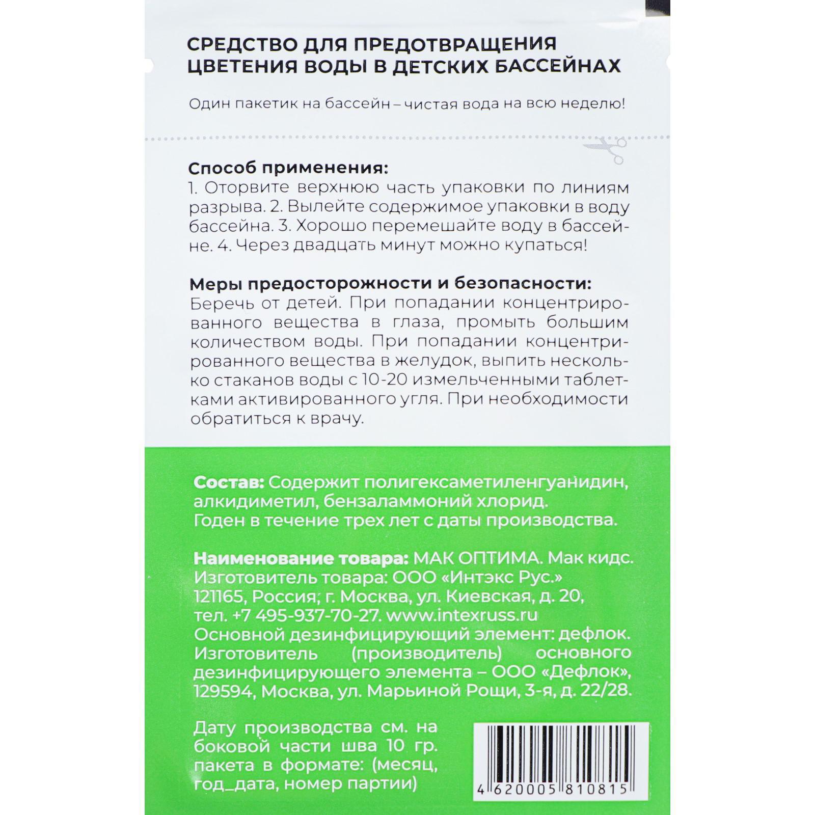 Средство против цветения воды в детских бассейнах мак оптима. Комплексный препарат МАК KIDS предназначен специально для использования в детских бассейнах объемом от 400 до 600 литров. Средство против водорослей совершенно безопасно для детей, не вызывает раздражений и не содержит хлор. Препарат эффективен против грибков и налета в воде и на стенках бассейна. Для его использования вам не потребуется специального обучения, достаточно всего прочитать инструкцию. Не требует установленного в бассейне фильтрационного оборудования. Комплект включает в себя 5 пакетов по 25 грамм. Один пакетик этого средства без хлора эффективен в течении одной недели. Применяется для: Дезинфекции воды бассейна, уничтожение бактерий и предотвращение их возникновения. Предотвращения биообрастания, образования налёта и "зелёных стенок" в бассейне. Осветления воды. Способ применения: Оторвите верхнюю часть упаковки по линиям разрыва. Вылейте содержимое упаковки в воду бассейна. Хорошо перемешайте воду в бассейне. Через 20 минут можно купаться. Характеристики: В комплекте: 5 пакетиков по 25 грамм. Состав: полигексаметиленгуанидин, алкидиметил, бензаламмоний хлорид. Производитель: MAK (Россия). Срок годности: 3 года. Внимание! Беречь от детей. При попадании концентрированного вещества в глаза промыть большим количеством воды. При попадании концентрированного вещества в желудок выпить несколько стаканов воды с 10-20 измельченными таблетками активированного угля. При необходимости обратиться к врачу. Вид средства: Прочие Форма выпуска: Картридж  развернуть описание ▼