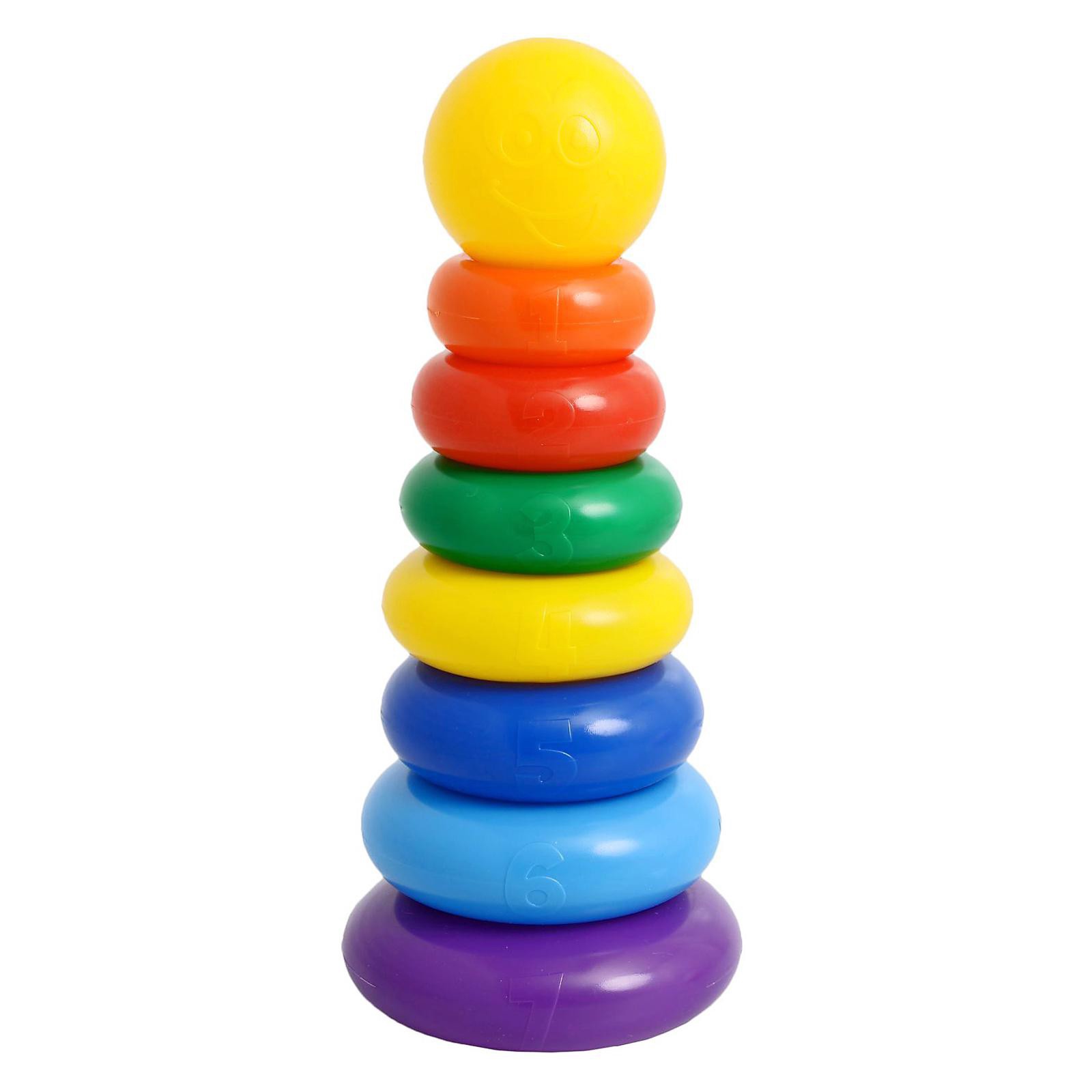 Пирамидка детская, 7 колец, с шаром. Пирамидка — одна из первых развивающих игрушек малыша, которая состоит из основы-стержня, круглых колец и наконечника в виде шара со смайликом. Неоспоримая польза Каждое кольцо разного цвета и пронумеровано. Собирая пирамидку, ребёнок освоит основные цвета радуги и получит базовые навыки счёта. Игры с красочной пирамидкой разовьют у крохи мелкую моторику, координацию движений, воображение, логическое и образное мышление, навыки конструирования. Он научится различать предметы по величине, сравнивать их и делать выводы. Также юный конструктор познакомится с такими понятиями, как «больше», «меньше», «круг», «конус», «плоский», «объёмный». Полная безопасность Товар разработан и произведён в России из российских материалов и соответствует всем ГОСТам, имеет множество преимуществ. Особенности: Сделан из особого гипоаллергенного полиэтилена, который не выделяет вредных летучих веществ, в том числе и при нагревании. Безопасный и прочный материал практически невозможно сломать, он выдерживает большие нагрузки. Если наступить на любую деталь, она просто деформируется, а не сломается, что исключает любую возможность пораниться. Полиэтилен и красители в составе пирамидки — сырьё, не подвергшееся переработке, а значит, совершенно безопасное для нежной детской кожи. Качество, подтверждённое сертификатами Строгий контроль на всех этапах, начиная от производства, заканчивая упаковкой товара, исключает брак и делает пирамидку действительно качественной. Стыки деталей обрабатываются вручную, а затем проходят дополнительную проверку на отсутствие острых частей. Имеет сертификат соответствия ЕАС. Примечание: игрушка содержит мелкие элементы, поэтому предназначена для деток от 1 года. Играть под присмотром взрослых. Размеры Шар: d=8,1 см.Кольцо 1: d=7,6 см, h=2,7 см.Кольцо 2: d=8,5 см, h=2,7 см.Кольцо 3: d=9,5 см, h=2,7 см.Кольцо 4: d=10,5 см, h=2,7 см.Кольцо 5: d=11 см, h=2,7 см.Кольцо 6: d=12,3 см, h=2,7 см.Кольцо 7: d=13,8 см, h=2,7 см.Цвет:Разноцветный|Для кого:Унисекс|Высота, см:33|Возраст:От 1 года|Количество элементов:8|Материал:Пластик|Развитие навыков:Воображение|Развитие навыков:Логика|Развитие навыков:Моторика|Развитие навыков:Фигуры, цвета|Вид пирамидки:Классическая|Страна:Россия  развернуть описание ▼