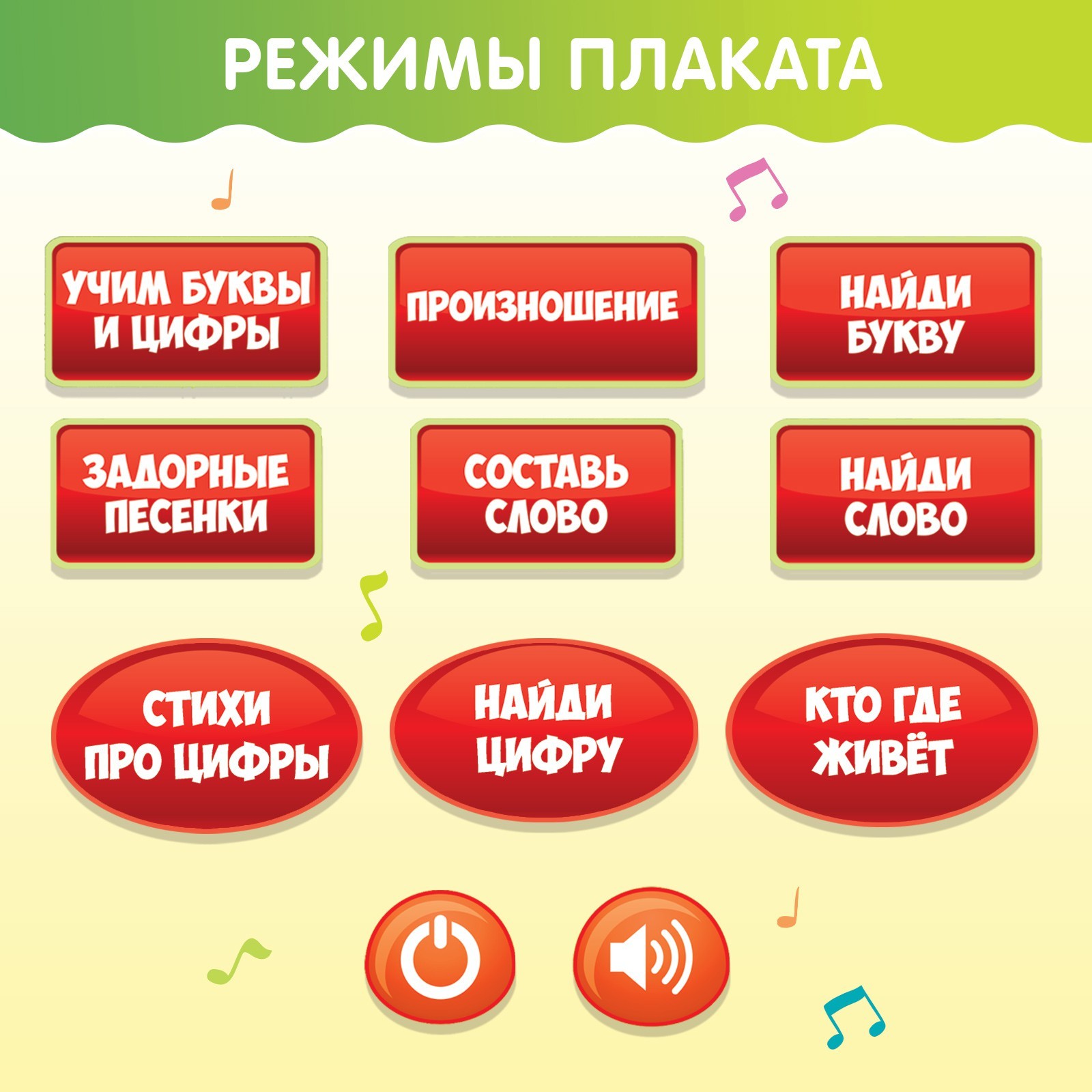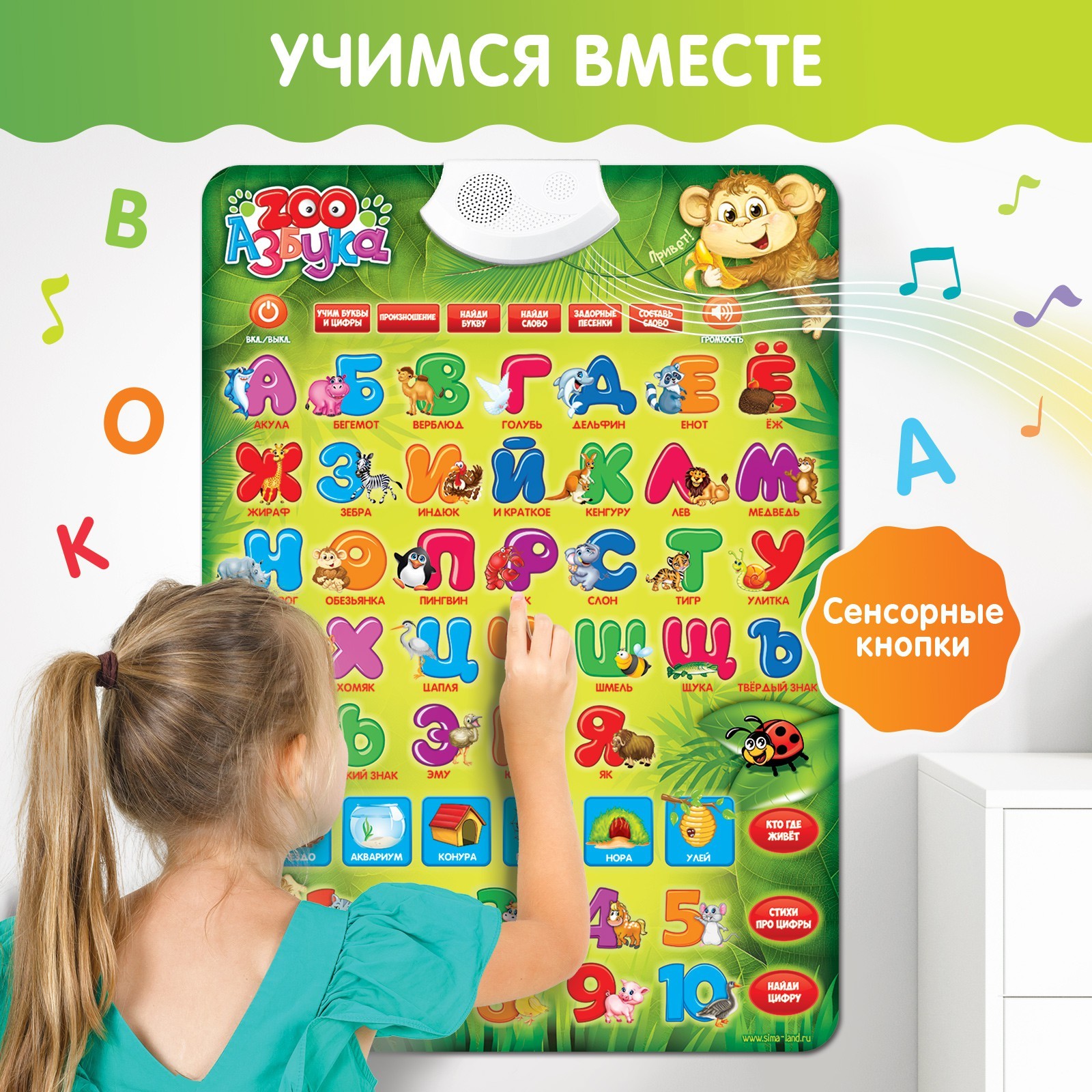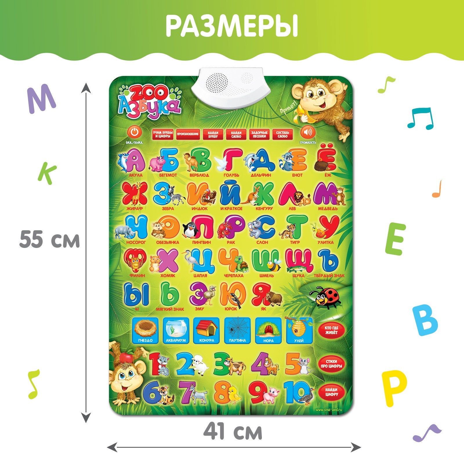 Обучающий электронный плакат «zoo азбука», работает от батареек. Добро пожаловать в мир знаний вместе с обучающим электронным плакатом «ZOO Азбука»! Начинать учить деток азбуке лучше с раннего возраста. Но чтобы процесс познания заинтересовал малыша по-настоящему, занятие это должно быть не только познавательным, но и увлекательным, весёлым и интересным. В этом случае простого листочка с буковками будет недостаточно. Окунуть карапуза с головой в мир знаний поможет обучающий электронный плакат «ZOO Азбука». Яркий, с множеством полезных функций, такой «учитель» действительно завоюет внимание крохи, покажет, расскажет и научит многому. У плаката есть обучающие, музыкальные и игровые кнопки, кнопки включения/выключения и регулировки громкости, 10 кнопок с цифрами, 33 с буквами русского алфавита, а также кнопки с интересными заданиями. «ZOO Азбука» умеет: воспроизводить названия букв и цифр;произносить слова по слогам;проигрывать задорные песенки;рассказывать стихи.Также обучающий плакат будет давать ребёнку различные задания, по которым он должен найти правильный ответ. Вместе с этой увлекательной игрушкой чадо изучит цифры, алфавит, разовьёт память, воображение, логику, визуальное и слуховое восприятие, моторику рук, весело и с пользой проведёт время. Обучающий электронный плакат «ZOO Азбука» станет родителям хорошим помощником, а для крохи — источником знаний, учителем и другом! Тип питания:От батареек|Для кого:Унисекс|Возраст:От 3 лет|Количество батареек:3|Материал:Пластик|Звук:Да|Работает от батареек:Да|Дополнительные функции:Звуковые эффекты|Типоразмер батареек:AAA (LR03)|Тема обучения:Окружающий мир|Тема обучения:Буквы, слова, русский язык|Тема обучения:Музыка|Тема обучения:Цифры, счёт, математика|Тема обучения:Развитие логики/мышления|Батарейки в комплекте:Нет|Страна:Китай  развернуть описание ▼