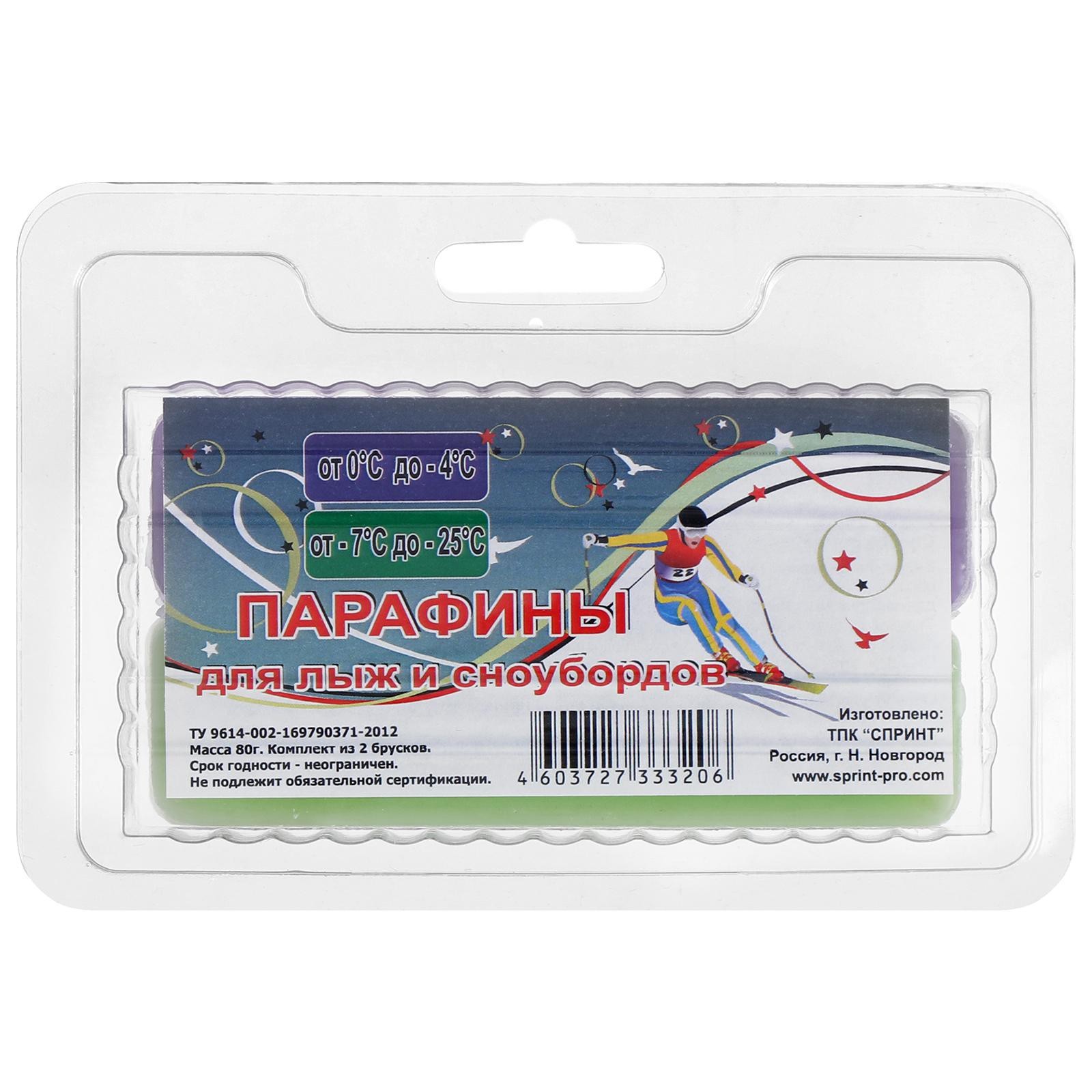 Парафины для лыж, 2 шт., ф-з, от 0 до -25°c, 80 г. Парафин позволяет улучшить скоростные характеристики. По цвету бруска можно определить, для каких погодных условий он предназначен. Парафины подходят для сноубордов, а также пластиковых и деревянных лыж. На упаковке указаны и выделены цветом соответствующие температурные режимы. Жёлтый парафин подходит для мокрого снега и в качестве грунта для новых лыж. Остальные — для старого и нового снега. Температурный режим: От -25°C до 0°C  развернуть описание ▼