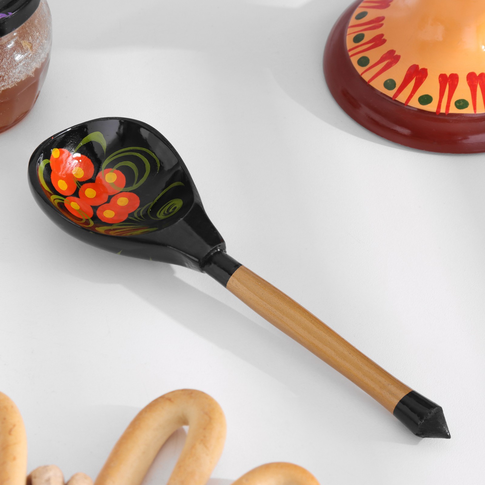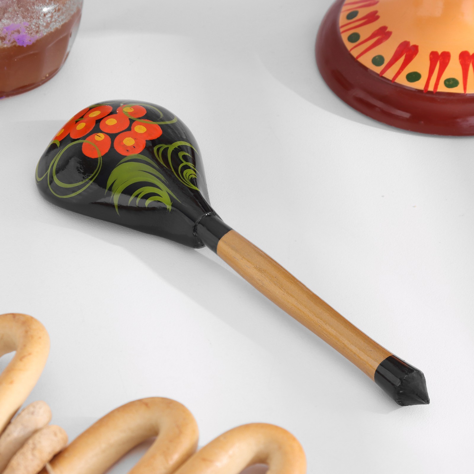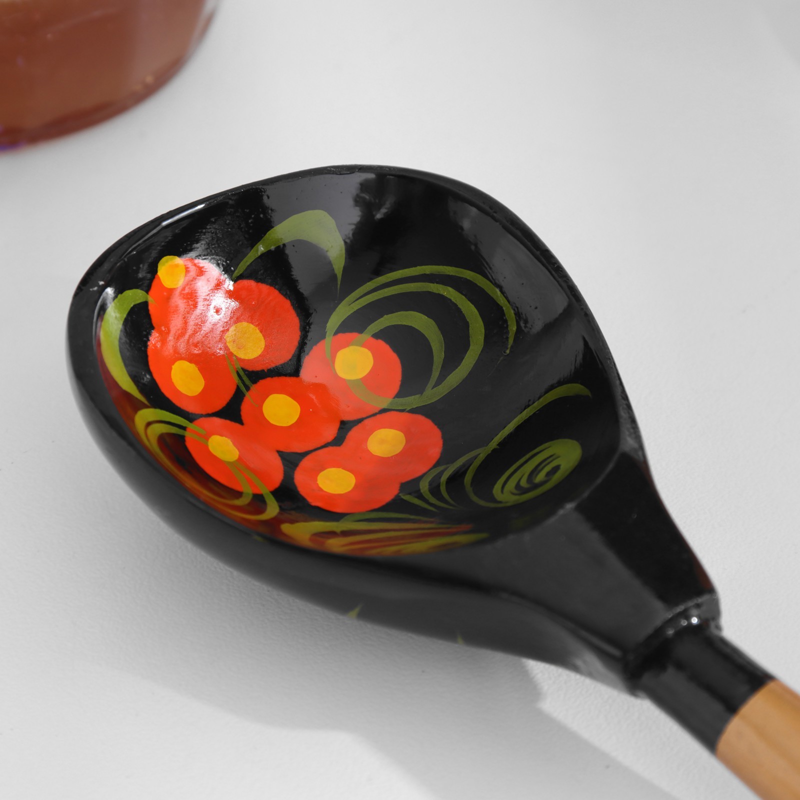 Ложка деревянная «чернушка», полубаская, хохлома. Хохлома — один из старейших русских народных промыслов. Любима она и сегодня за свои неповторимые узоры и гармоничное цветовое сочетание. Основные краски, применяемые в хохломской росписи, относятся к тёплой гамме спектра: красный, чёрный, золотой. Сочетание этих цветов, пришедших из иконописи, очень символично: Красный (красивый) — цвет власти; Золотой — цвет поиска, благополучия, божественного начала; Чёрный — цвет занавеси перед вечной жизнью, цвет духовного очищения. Традиционные элементы Хохломы — ягоды рябины и земляники, цветы и листья, птицы, рыбы и звери. Расписывают изделия вручную, без предварительной разметки, благодаря этому каждое изделие уникально, и рисунок каждый раз отличается от предыдущего. Цвет: Чёрный Цвет: Красный Цвет: Золотистый Цвет: Разноцветный Возраст: От 1 года tnved: 4419900000 Материал ручки: Дерево Вид дерева: Берёза Материал: Дерево Из натурального дерева: Да Тип нанесения рисунка: Ручная роспись Ручная работа: Да Назначение: Сувенирные Назначение: Столовые Вид: Ложки Температурное ограничение: Нет Можно мыть в посудомоечной машине: Нет Можно использовать в СВЧ-печи: Нет Цвет ручки: Золотистый Вид музыкального инструмента: Ложки Матовая поверхность: Нет Внешний вид: С фигурной ручкой  развернуть описание ▼