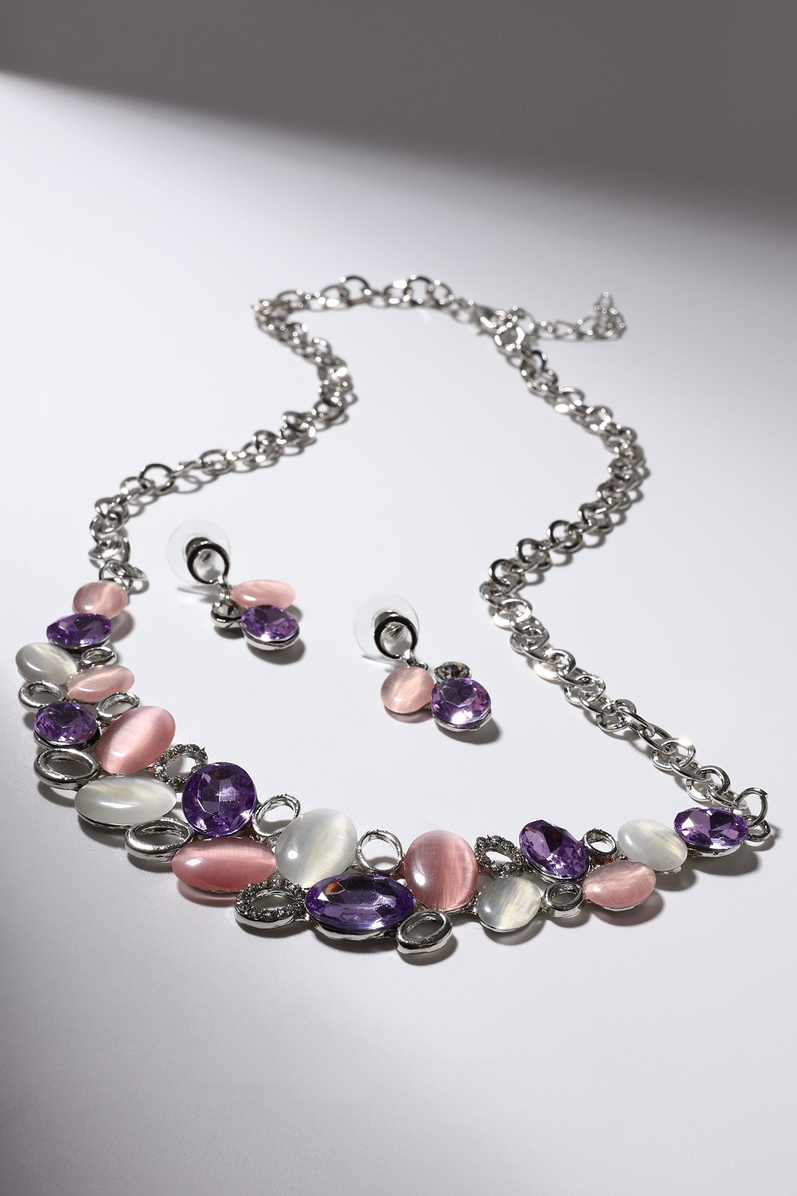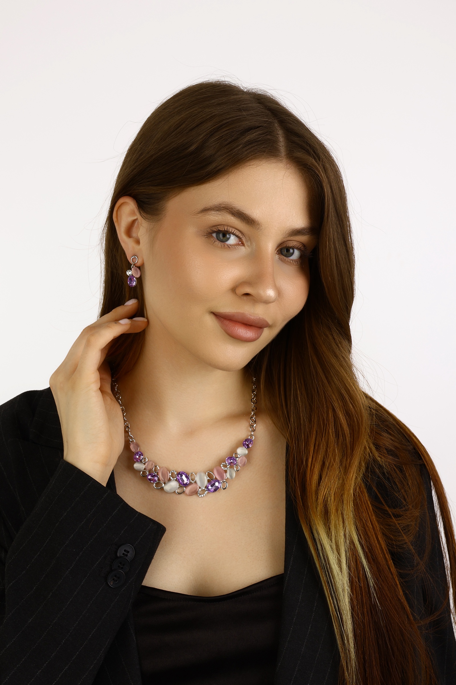 Храните изделия отдельно друг от друга в сухом месте не пропускающем солнечные лучиСнимайте украшения перед контактом с водойСнимайте украшение перед использованием парфюма и кремовПосле каждой носки протирайте аксессуары салфеткой из микрофибрыНабор:Да|Цвет:Розовый|Для кого:Для женщины|Длина, см:40|Коллекция:Кошачий глаз|В наборе, шт.:2|Тематика праздника:Новый год|Тематика праздника:День рождения|Тематика праздника:Выпускной в школе|Тематика праздника:8 Марта|Тематика праздника:Последний звонок|Цвет фурнитуры:Серебряный|Вставка/Подвеска:Камень искусственный|Вставка/Подвеска:Стразы|Вставка/Подвеска:Стекло|Состав набора:Серьги + Колье|Материал основы:Металл|Тематика:Цветы и растения|Страна:Китай