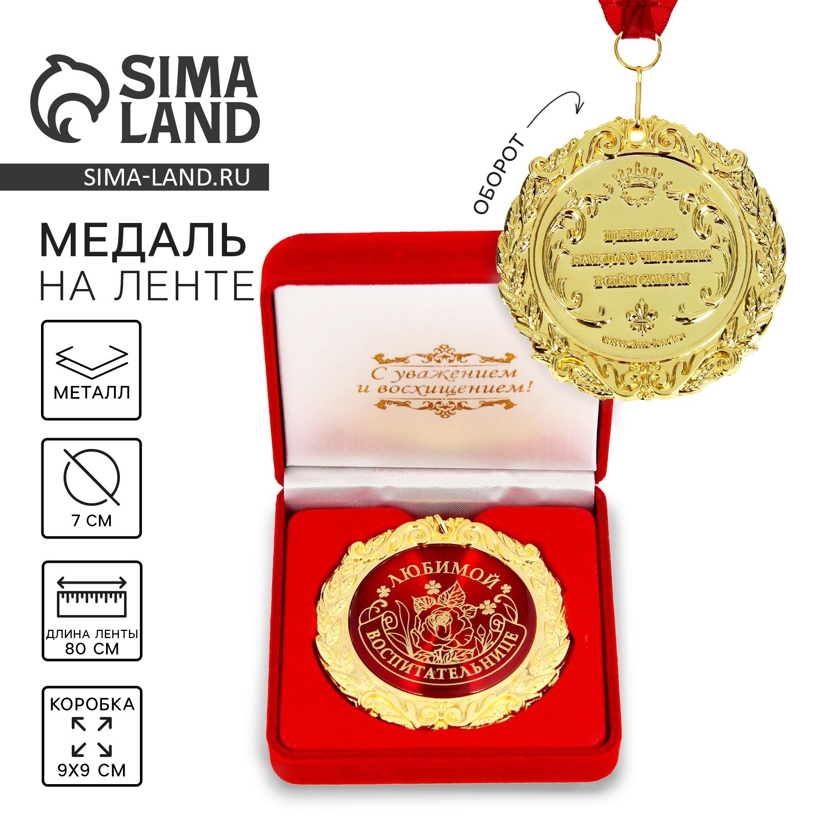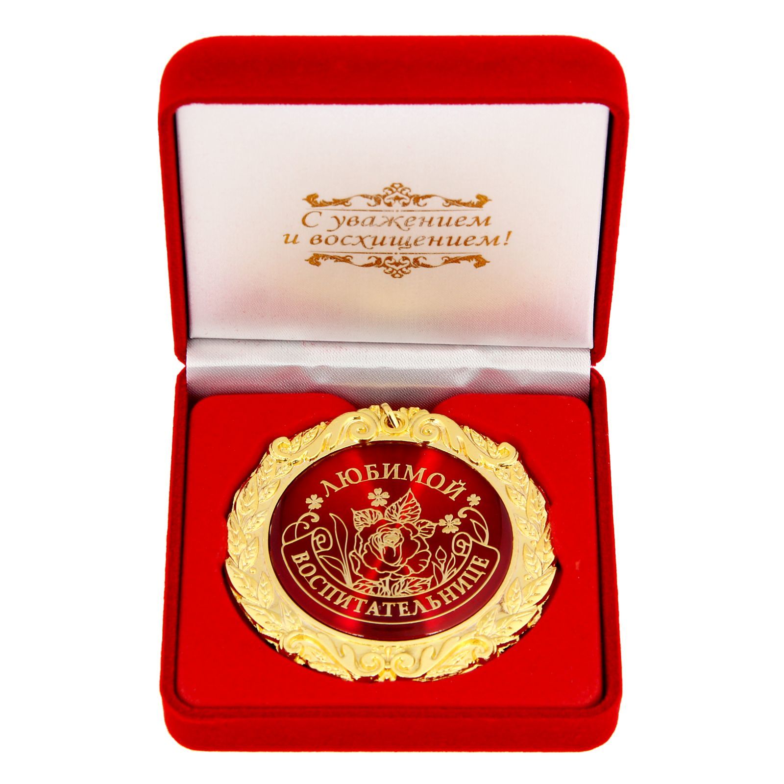 Медаль в бархатной коробке «любимой воспитательнице», d=7 см. Создана формула идеального поздравления: классическая форма и праздничное содержание. Именно такой и является медаль в бархатной коробке «Любимой воспитательнице», d=7 см. Это отличная награда для самых достойных представителей своего времени. Эксклюзивный сувенир станет достойным украшением вечера и поможет создать незабываемую церемонию поздравления. Медаль изготовлена из фигурного металла золотистого цвета, декорирована цветной вставкой с акриловым покрытием, что предотвращает её потускнение. Награда упакована в бархатную подарочную коробку, идет в комплекте с лентой. Порадуйте этой медалью близкого человека в День рождения, 14 февраля или просто так, без повода. Вы подарите море эмоций и радости, ведь так приятно знать, что вас любят и ценят просто за то, что вы есть. Цвет:Красный|Цвет:Золотистый|Для кого:Унисекс|Диаметр, мм:70|Вид упаковки:Коробка бархатная|Тематика праздника:Профессиональные праздники|Тематика праздника:1 Сентября|Адресат:Воспитателю|Материал:Металл|Наличие символики РФ:Нет|Наличие ленты:Да|Страна:Китай  развернуть описание ▼