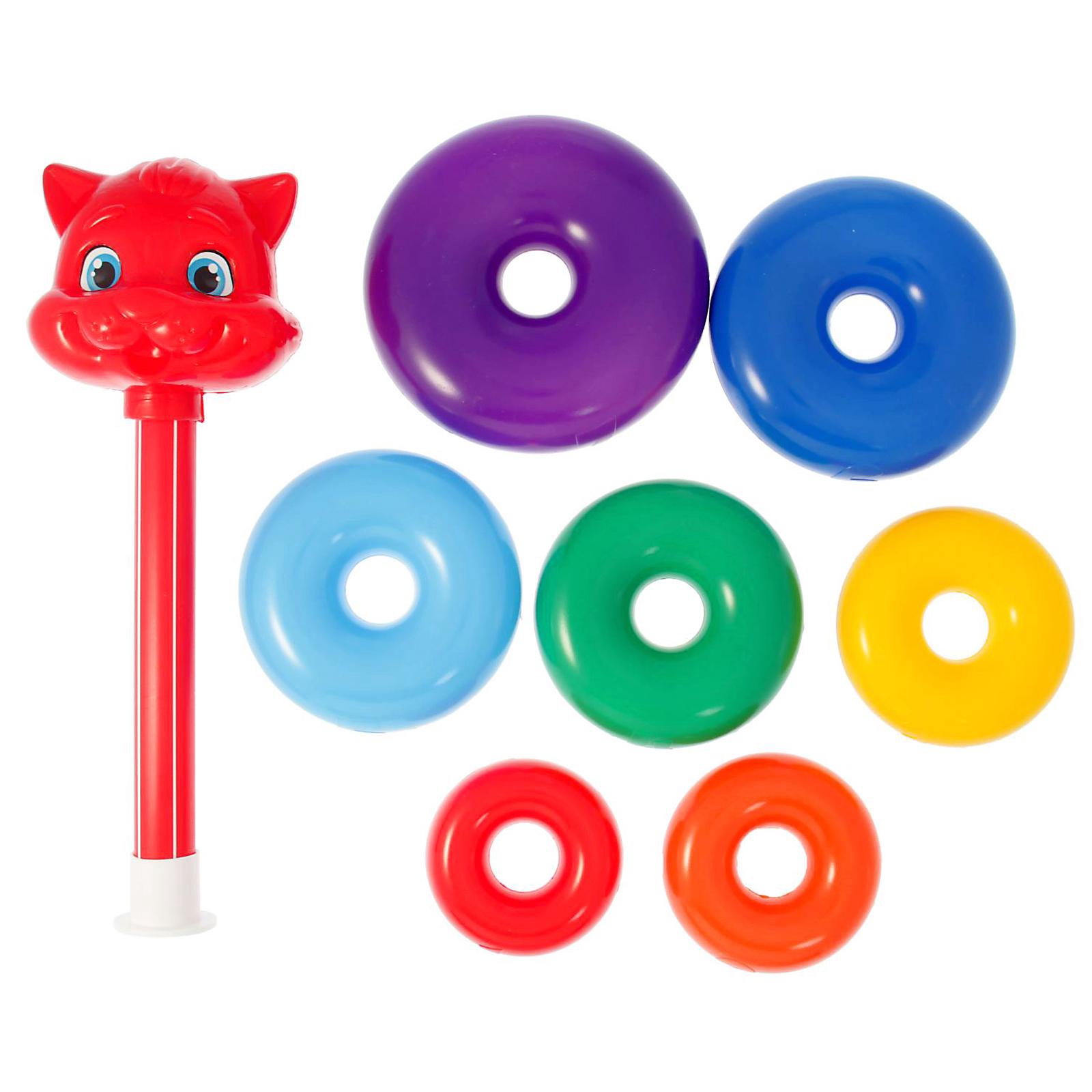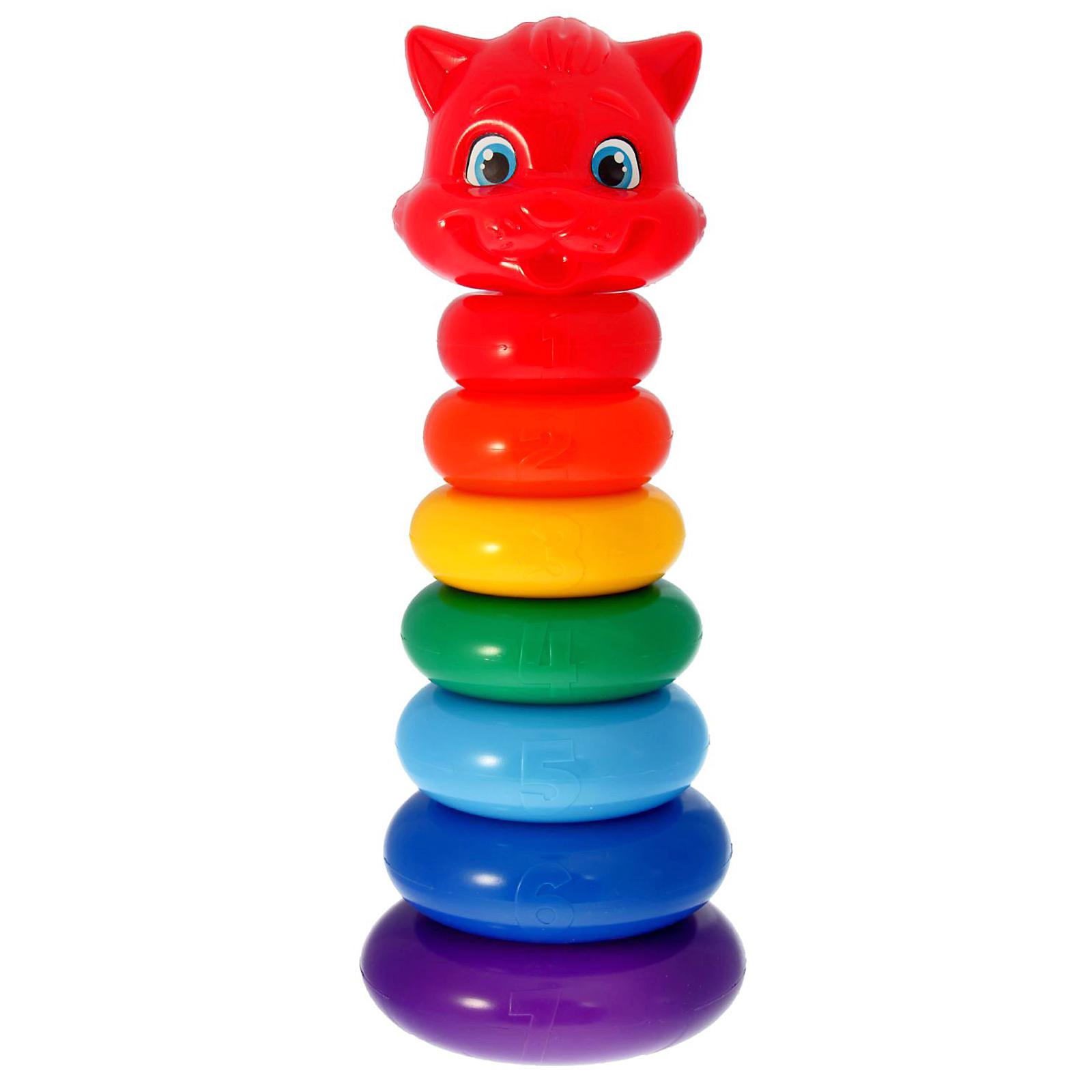 Пирамидка детская «котик», 7 колец. Пирамидка — одна из первых развивающих игрушек малыша, которая состоит из основы-стержня, круглых колец и наконечника в виде шара со смайликом. Неоспоримая польза Каждое кольцо разного цвета и пронумеровано. Собирая пирамидку, ребёнок освоит основные цвета радуги и получит базовые навыки счёта. Игры с красочной пирамидкой разовьют у крохи мелкую моторику, координацию движений, воображение, логическое и образное мышление, навыки конструирования. Он научится различать предметы по величине, сравнивать их и делать выводы. Также юный конструктор познакомится с такими понятиями, как «больше», «меньше», «круг», «конус», «плоский», «объёмный». Полная безопасность Товар разработан и произведён в России из российских материалов и соответствует всем ГОСТам, имеет множество преимуществ. Особенности: Сделан из особого гипоаллергенного полиэтилена, который не выделяет вредных летучих веществ, в том числе и при нагревании. Безопасный и прочный материал практически невозможно сломать, он выдерживает большие нагрузки. Если наступить на любую деталь, она просто деформируется, а не сломается, что исключает любую возможность пораниться. Полиэтилен и красители в составе пирамидки — сырьё, не подвергшееся переработке, а значит, совершенно безопасное для нежной детской кожи. Качество, подтверждённое сертификатами Строгий контроль на всех этапах, начиная от производства, заканчивая упаковкой товара, исключает брак и делает пирамидку действительно качественной. Стыки деталей обрабатываются вручную, а затем проходят дополнительную проверку на отсутствие острых частей. Имеет сертификат соответствия ЕАС. Примечание: игрушка содержит мелкие элементы, поэтому предназначена для деток от 1 года. Играть под присмотром взрослых. Размеры Шар: d=8 см.Кольцо 1: d=7,6 см, h=3,5 см.Кольцо 2: d=8,5 см, h=3,5 см.Кольцо 3: d=9,5 см, h=3,5 см.Кольцо 4: d=10,5 см, h=3,5 см.Кольцо 5: d=11 см, h=3,5 см.Кольцо 6: d=12,3 см, h=3,5 см.Кольцо 7: d=13 см, h=3,5 см.Цвет:Разноцветный|Для кого:Унисекс|Высота, см:35|Возраст:От 1 года|Количество элементов:8|Материал:Пластик|Развитие навыков:Воображение|Развитие навыков:Моторика|Развитие навыков:Логика|Развитие навыков:Фигуры, цвета|Вид пирамидки:Классическая|Страна:Россия  развернуть описание ▼