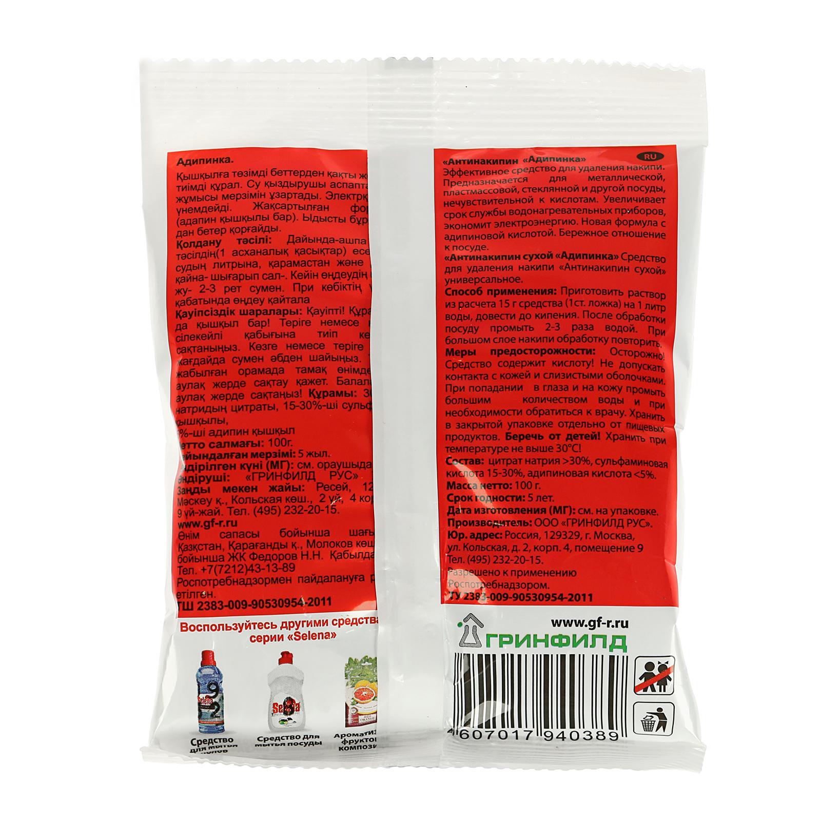 Антинакипин selena "адипинка", для удаления накипи, 100 г. Средство для удаления накипи «Антинакипин Адипинка» эффективно очищает нежелательное загрязнение, увеличивая срок службы водонагревательных приборов. Его особенности: Значительно сокращает потребление электроэнергии за счёт увеличения теплоотдачи нагревательных элементов. Не оказывает вредного воздействия на металлические, пластмассовые и резиновые детали бытовой техники, кроме поверхностей, чувствительных к кислотам. Способ применения: приготовить раствор из расчёта 15 г средства (1 столовая ложка) на 1 литр воды, довести до кипения. После обработки посуду промыть 2—3 раза водой. При большом слое накипи обработку повторить. Вес, г/Объём, мл: 100 Назначение: Для кухонной техники  развернуть описание ▼