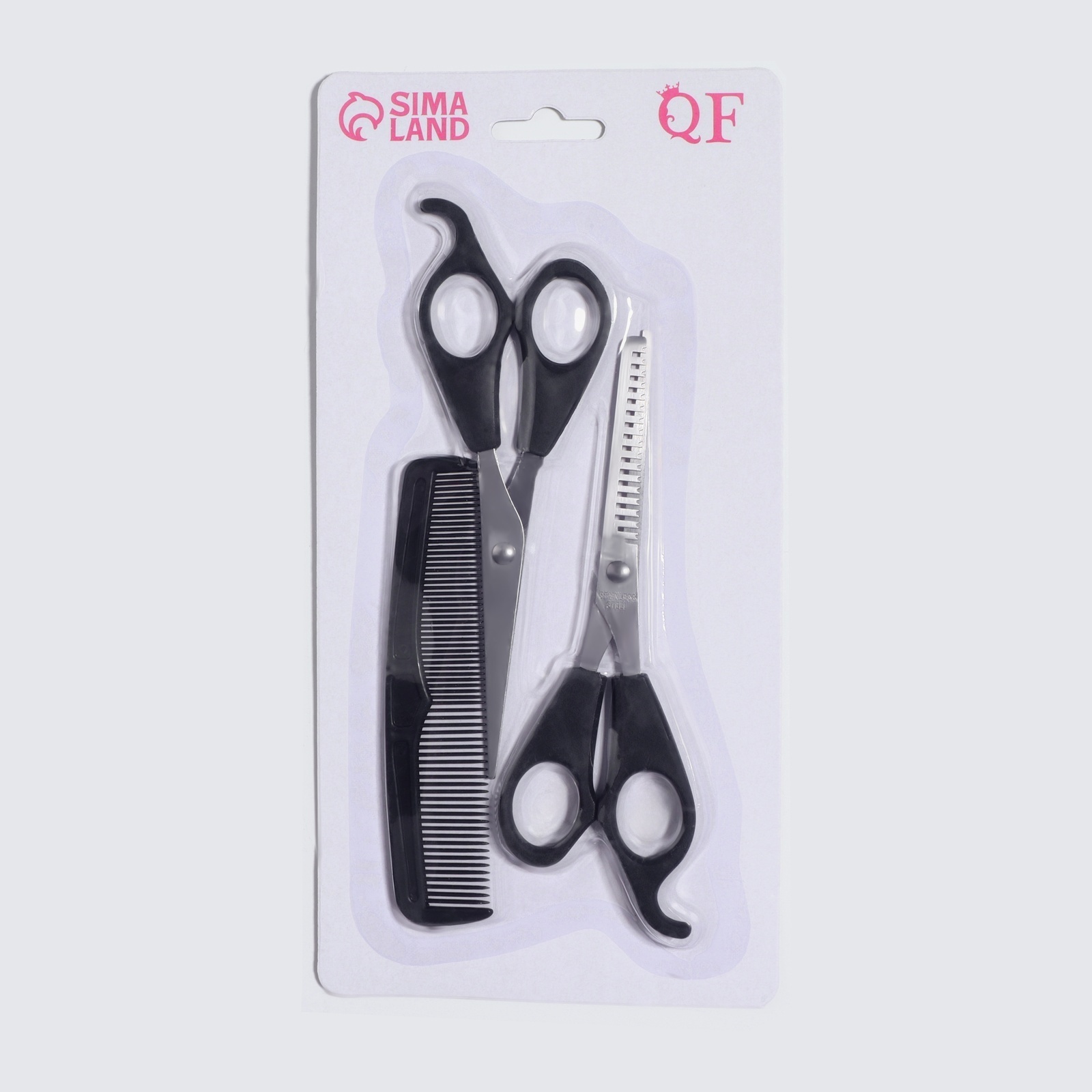 парикмахерские ножницы с упором; расчёска; филировочные ножницы. Набор:Да|Цвет:Чёрный|Форма:Прямоугольная|В наборе, шт.:3|Длина лезвия, см:15.5|Детские:Нет|Материал корпуса:Пластик|Вид упаковки:Блистер|Рисунок:Нет|Материал:Металл|Материал:Пластик|Покрытие:Без покрытия|Тип расчёски:Комбинированная|Зубчики расчёски:Частые|Назначение ножниц:Для стрижки|Назначение ножниц:Для филировки|Упор:Да|В подарочной упаковке:Нет|Страна:Китай