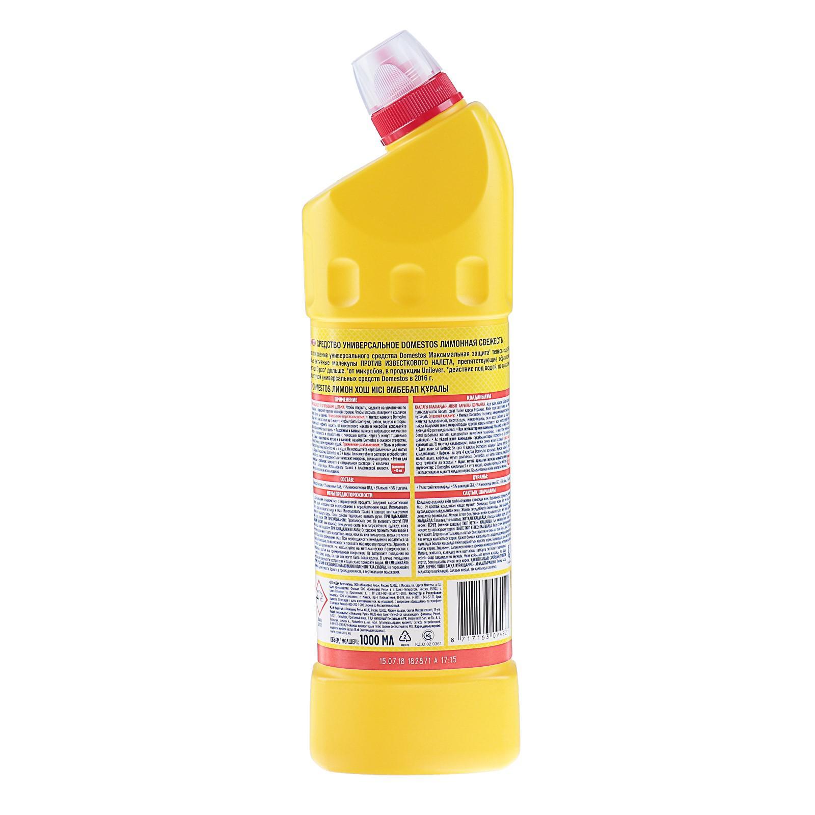 Чистящее средство domestos "лимонная свежесть", универсальное, 1 л. Универсальное средство для удаления загрязнений с различных поверхностей. Обладает дезинфицирующим и отбеливающим эффектом. Средство Domestos универсально и подойдет для уборки всего дома. В неразбавленном виде средство можно использовать для очищения и дезинфекции унитаза, ванны, раковины, стоков и сливов, а в разбавленном - для мытья множества поверхностей (пол, кафельные поверхности, плитка, рабочие поверхности на кухне, мусорные ведра) и даже для отбеливания белья и тканей. Универсальное средство Domestos подходит для септиков. Ознакомьтесь с инструкцией по применению для каждого вида поверхностей. Благодаря особой формуле с дезинфицирующим эффектом и чистящими компонентами, Domestos убивает все известные микробы, максимально отчищает грязь и устраняет неприятные запахи. Уникальная формула геля Domestos предотвращает появление известкового налета. Густая текстура геля Domestos обеспечивает гарантированное очищение и убивает бактерии, грибки, вирусы и споры. Изогнутый дозатор обеспечит удобство использования. Регулярно используйте Domestos для постоянной чистоты и белизны туалета и других поверхностей, а также для защиты семьи от микробов. Универсальное средство Domestos экономично и быстро обеспечивает длительное действие и защиту. Тысячи лабораторных тестов каждую неделю подтверждают, Domestos - непобедимый. Безжалостное уничтожение микробов обеспечит дезинфекцию и чистоту в доме. Вес, г/Объём, мл: 1000 Назначение: Универсальное Эффект: Дезинфицирующее Эффект: Очищение  развернуть описание ▼