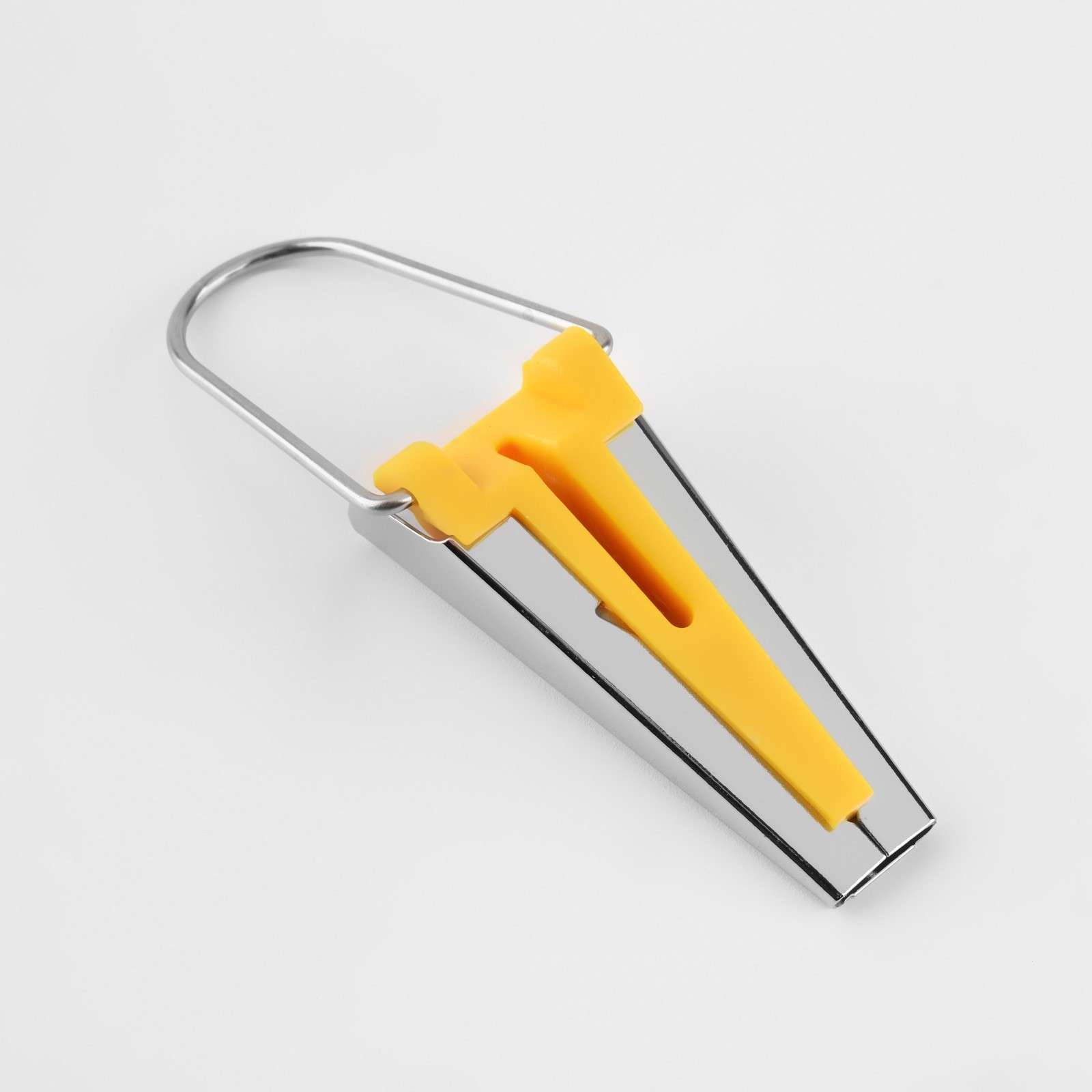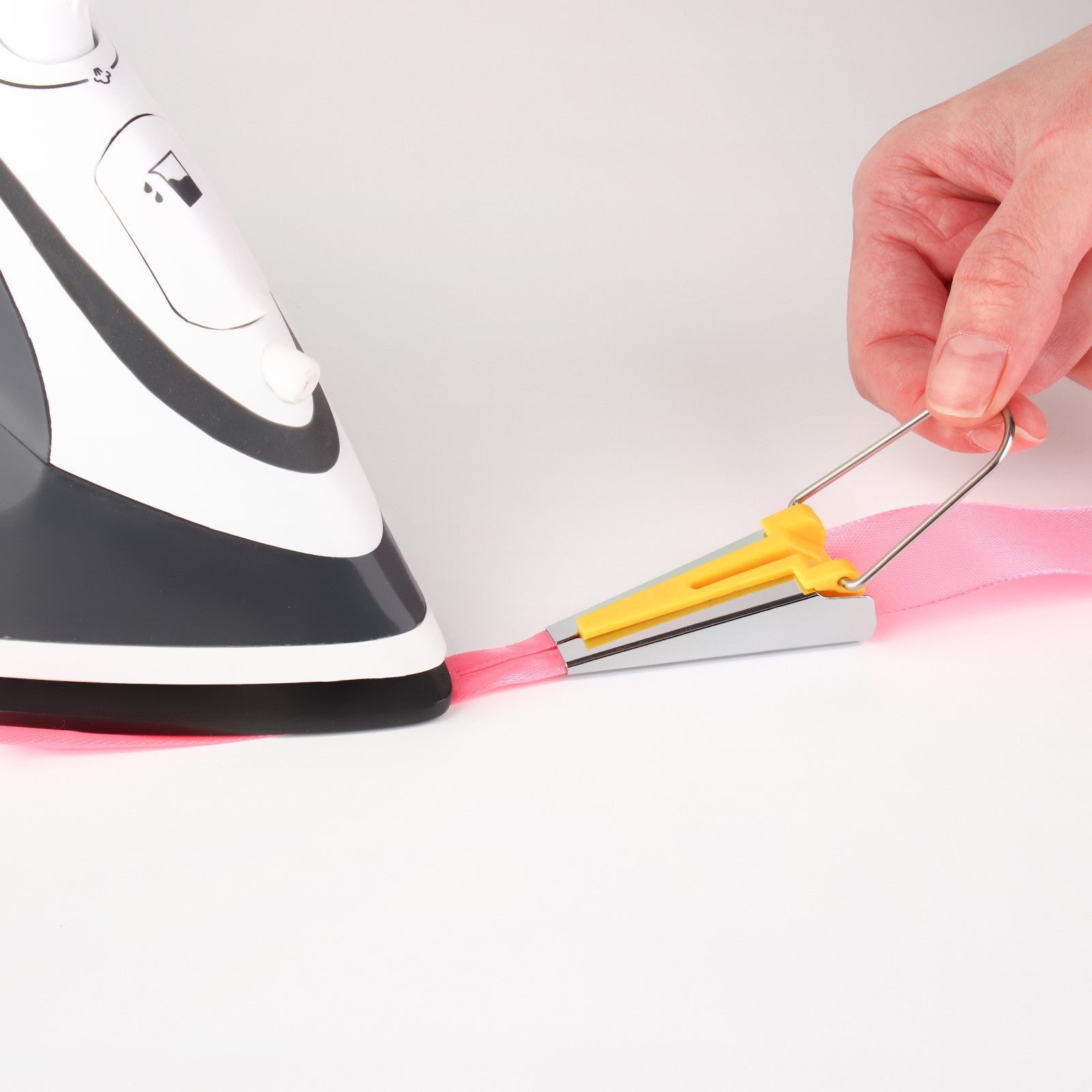 Устройство для складывания косой бейки, 12 мм, жёлтое. Косая бейка незаменима при окантовке низа изделий, горловины или проймы. Перед вами приспособление, которое поможет вам легко и быстро сделать косую бейку. Всего несколько секунд, и ваша лента готова. Останется только проутюжить складки. Для начала необходимо нарезать заготовки из ткани нужного размера под углом 45 градусов, если длины получившихся полосок не хватает — сшить их друг с другом и разгладить швы. Отправить заготовку в устройство, помогая иголочкой. Зафиксировать конец бейки, аккуратно протягивая полоску с другой стороны, проглаживать утюгом получившиеся припуски. Материал:Пластик|Материал:Металл|Страна:Китай  развернуть описание ▼