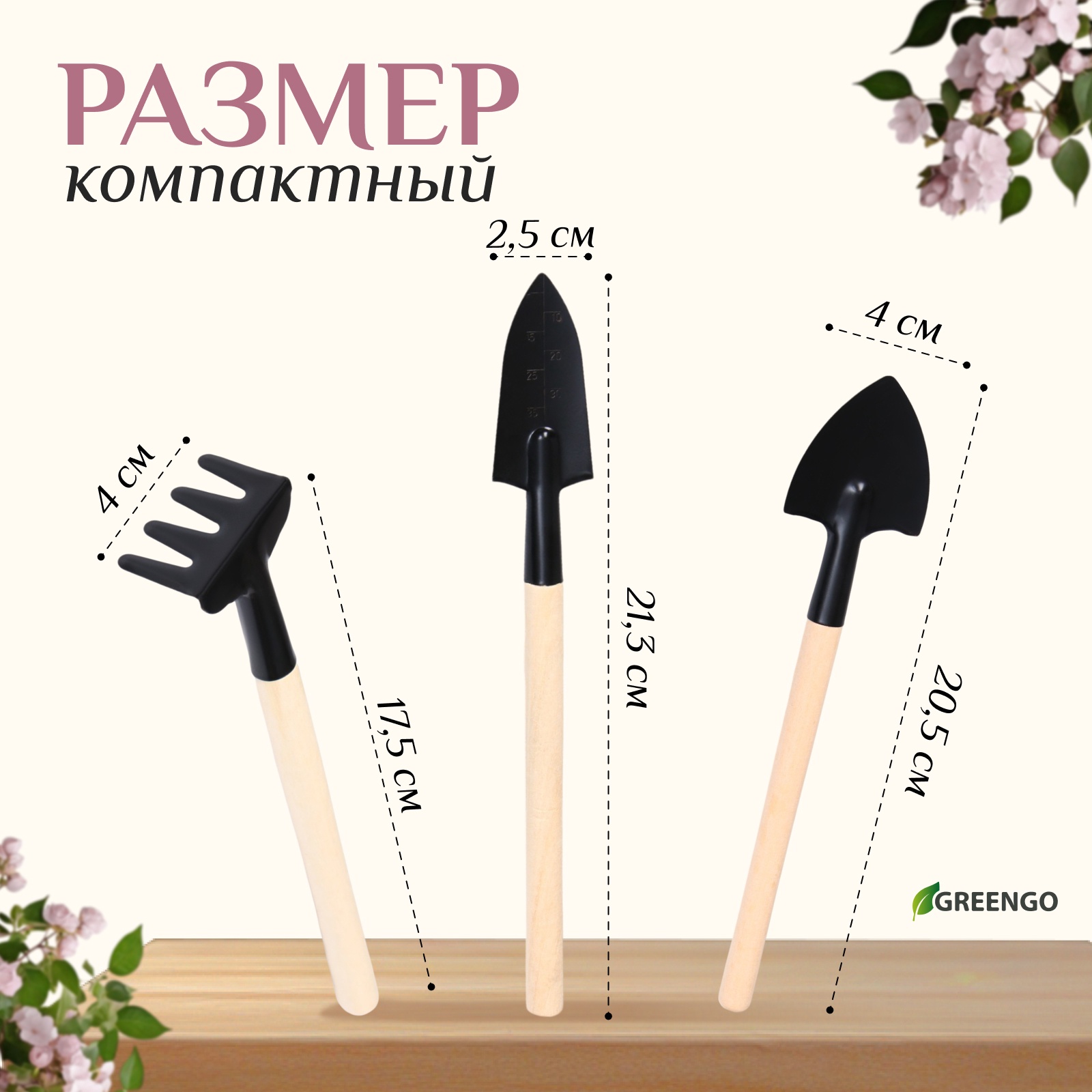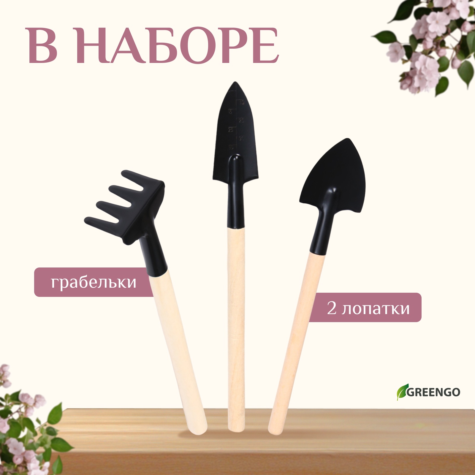 Набор садового инструмента для комнатных растений, 3 предмета: грабли, 2 лопатки, длина 24 см, деревянные ручки, Greengo