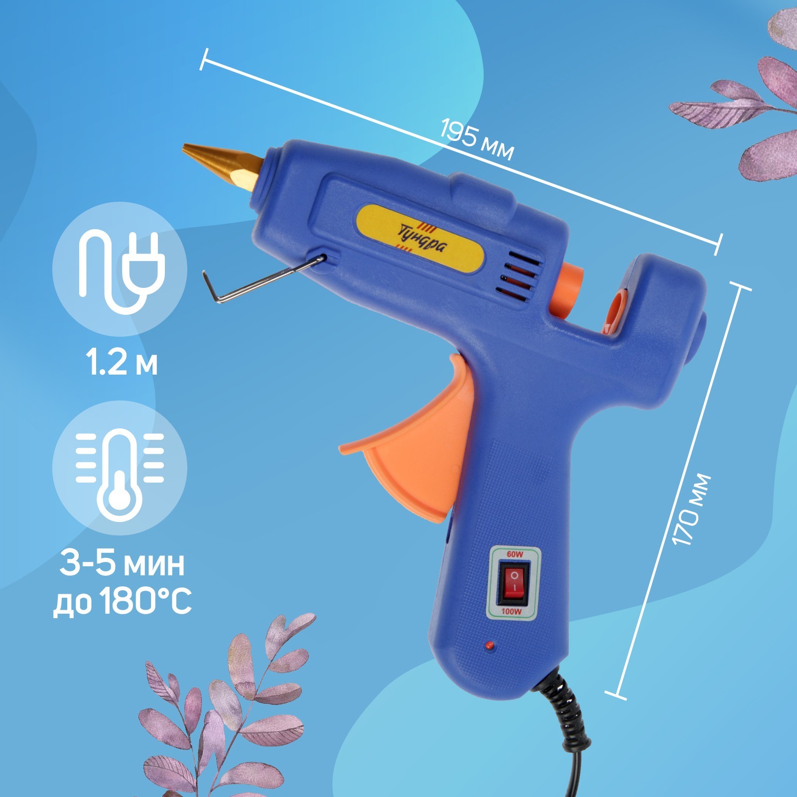 Клеевой пистолет тундра, переключатель мощности 60/100 вт, 220 в, антикапля, 11 мм