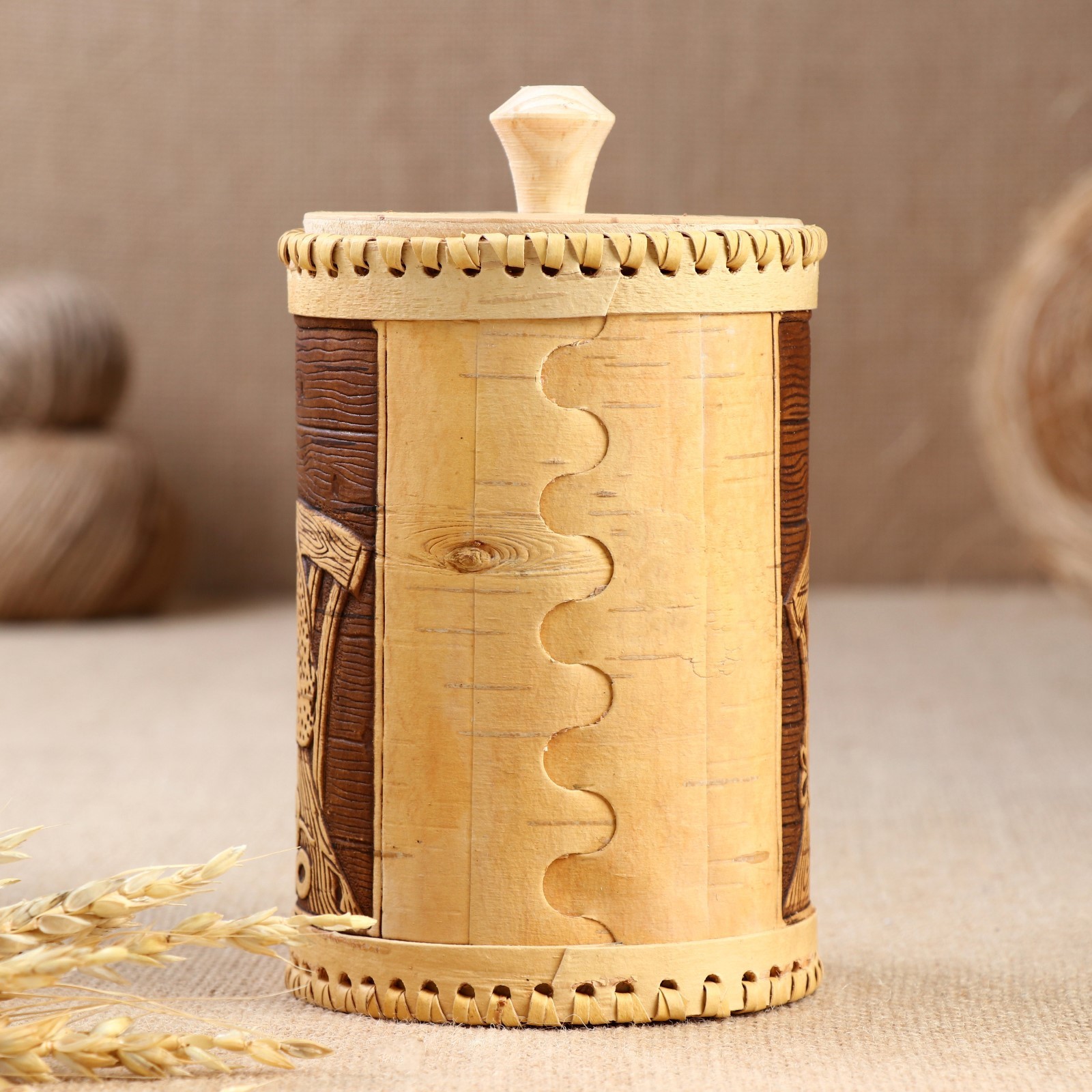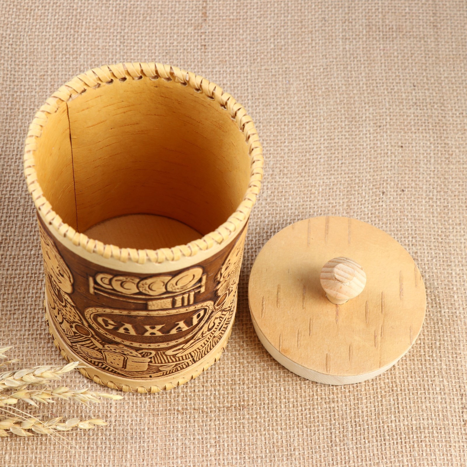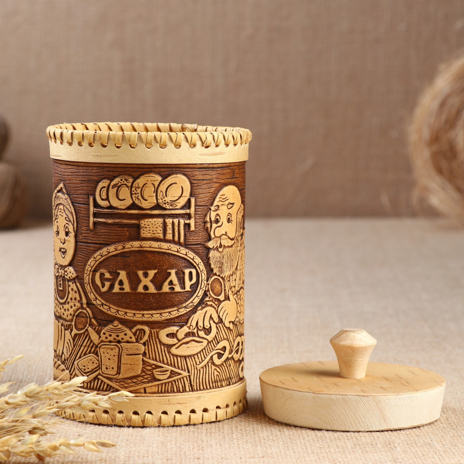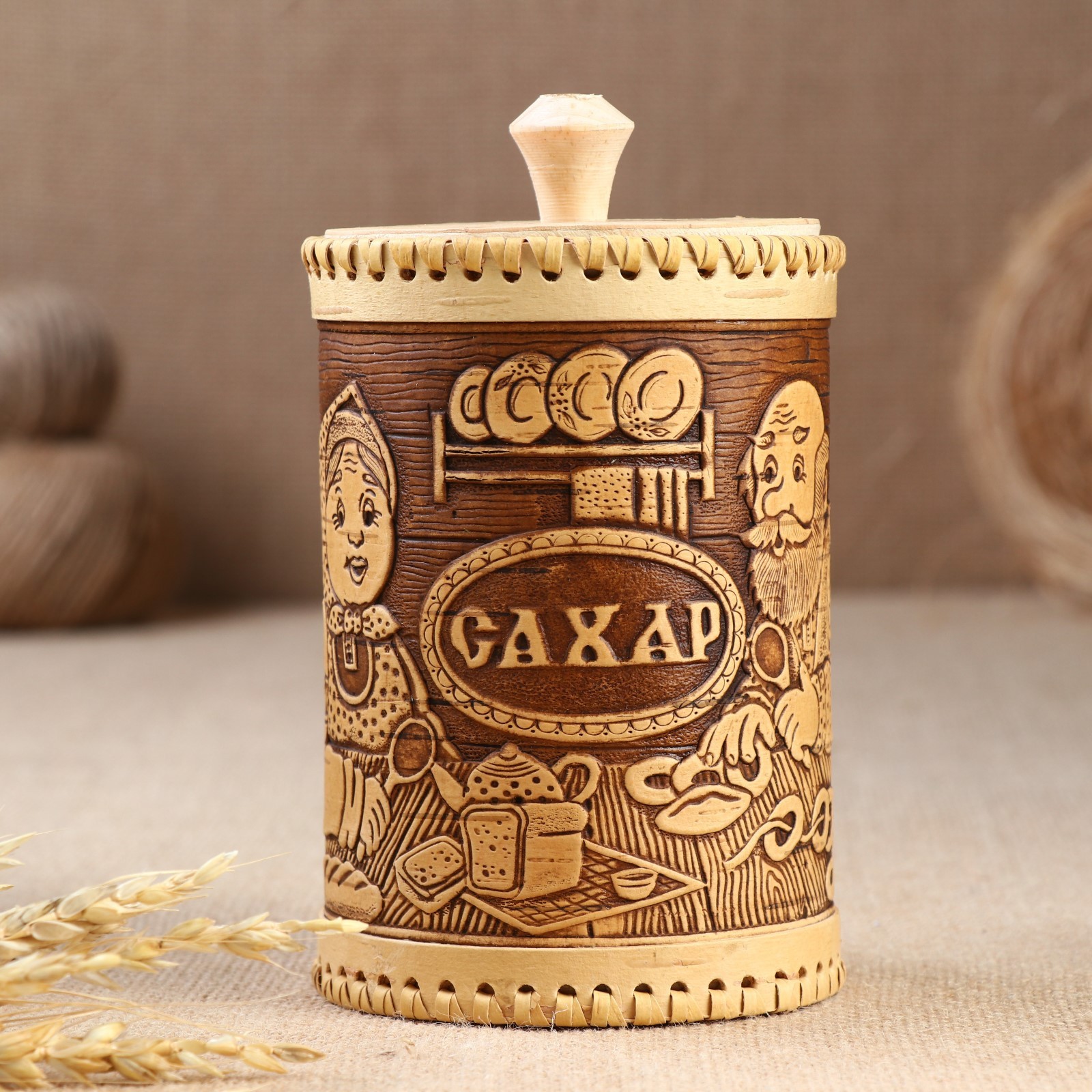 Туес «дедушка и бабушка», сахар,10х17,5 см, береста. Туес из бересты – практичный и лаконичный выбор для вашей кухни! Изделие выполнено из экологически чистого сырья, которое идеально подходит для хранения продуктов. Береста является природным антисептиком и прекрасно впитывает влагу. Продукты в такой посуде дольше сохраняют свою свежесть и вкусовые качества, в ней не заводятся насекомые и не размножаются бактерии. Изготовлено из натуральной коры берёзы вручную российскими мастерами. Цвет: Коричневый Цвет: Бежевый Форма: Цилиндрическая Объём, л: 1 Объём, мл: 1000 Оформление: С выжиганием Тематика: Люди Тематика: Кухня Крышка: Да Материал крышки: Дерево Вид дерева: Берёза Материал: Береста Из натурального дерева: Да Покрытие: Воск Герметичная крышка: Нет Тип нанесения рисунка: Тиснение Ручная работа: Да Объём: 1 л - 5 л Температурное ограничение: Нет Можно мыть в посудомоечной машине: Нет Текстура: С рельефом Назначение: Для специй Особенности: Без особенностей Форма: Круг, шар, цилиндр  развернуть описание ▼