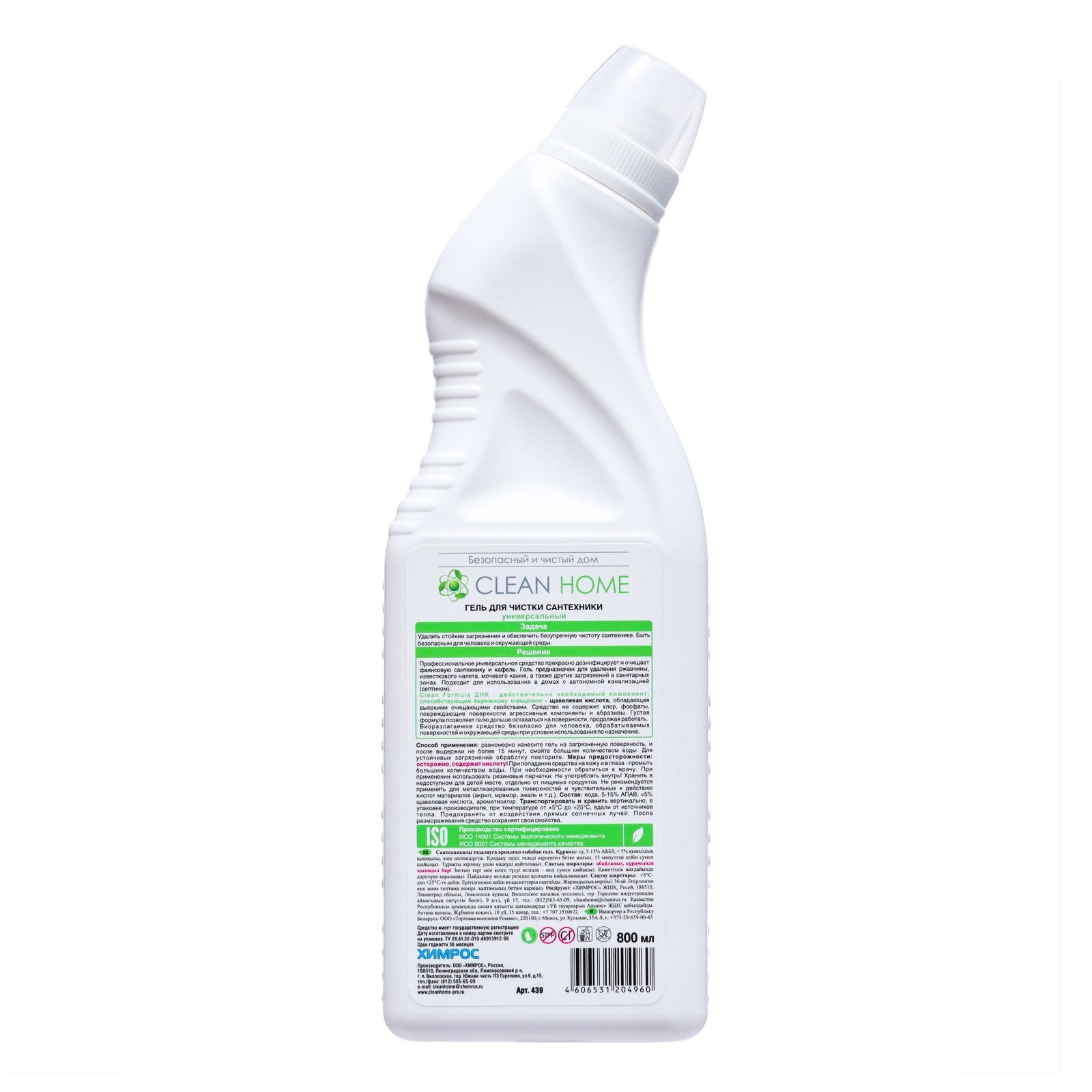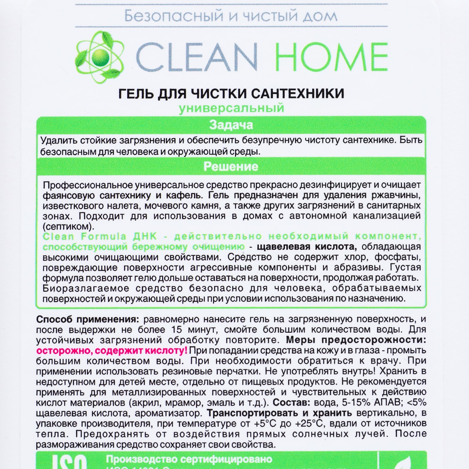 Гель для чистки сантехники clean home, 800 мл. Ванная и туалетная комнаты — места наибольшего скопления микробов. Гель для чистки сантехники Clean Home предназначен для удаления жиров, белков, минеральных масел, ржавчины, известкового налёта, мочевого и водного камня, а также других загрязнений в санитарных зонах. Густая формула позволяет ему дольше оставаться на стенках и продолжать при этом эффективно работать. Средство безопасно для человека, обрабатываемых поверхностей и окружающей среды при правильном применении, биоразлагаемо. parts count: 0 Вес, г/Объём, мл: 800 Назначение: Универсальное : 0 Эффект: Дезинфицирующее Эффект: Очищение  развернуть описание ▼