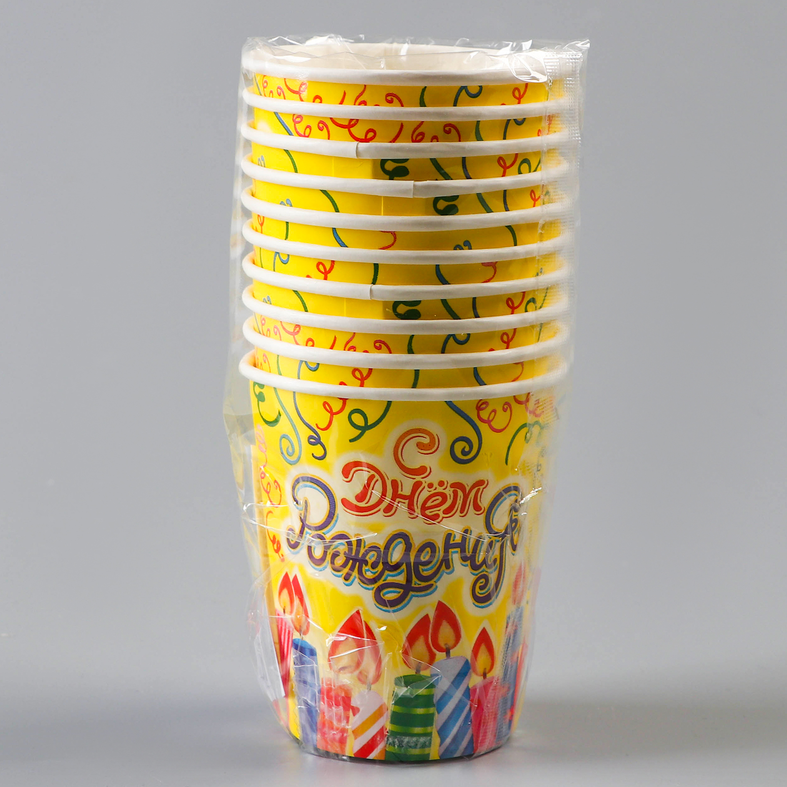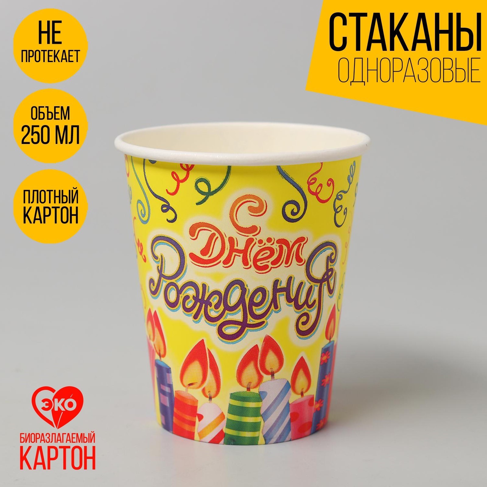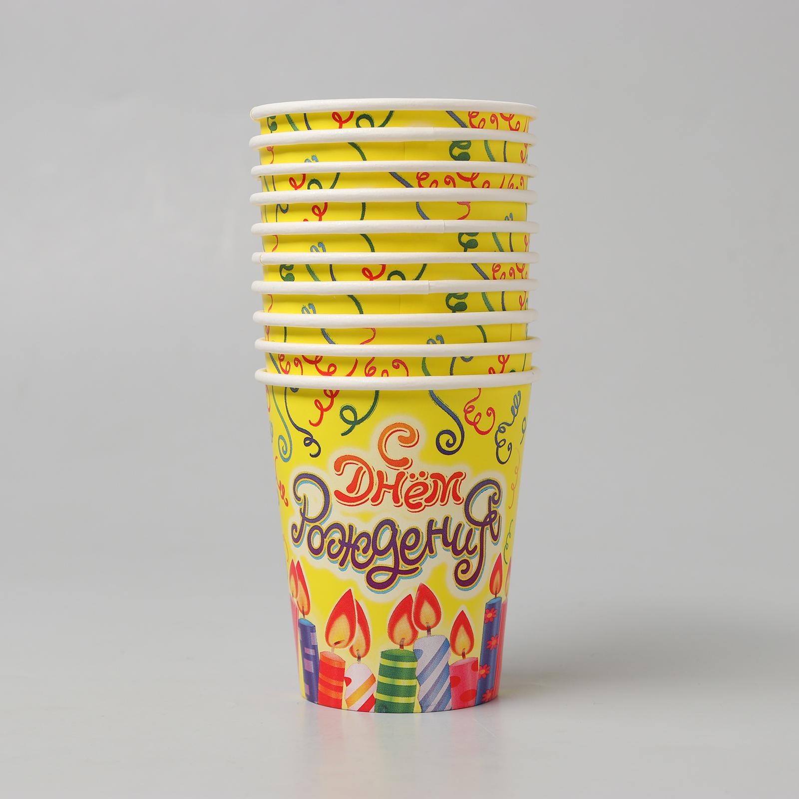 Стакан одноразовый бумажный "с днем рождения" свечи и серпантин (250 мл)