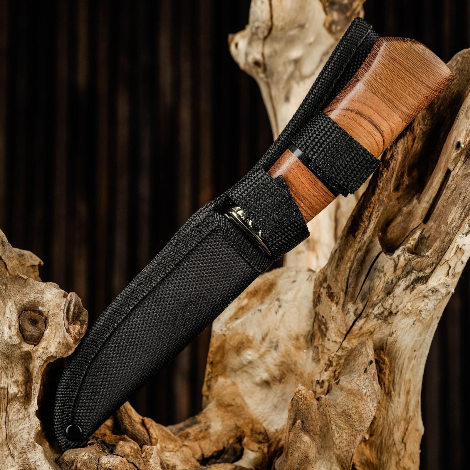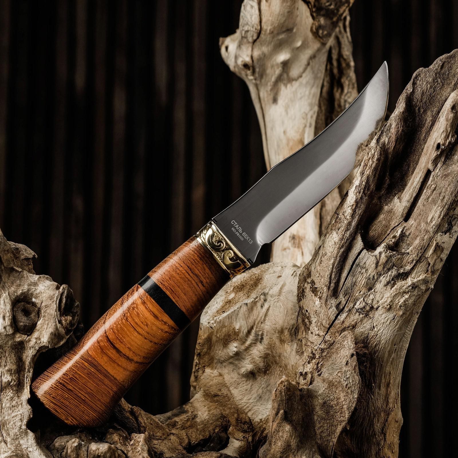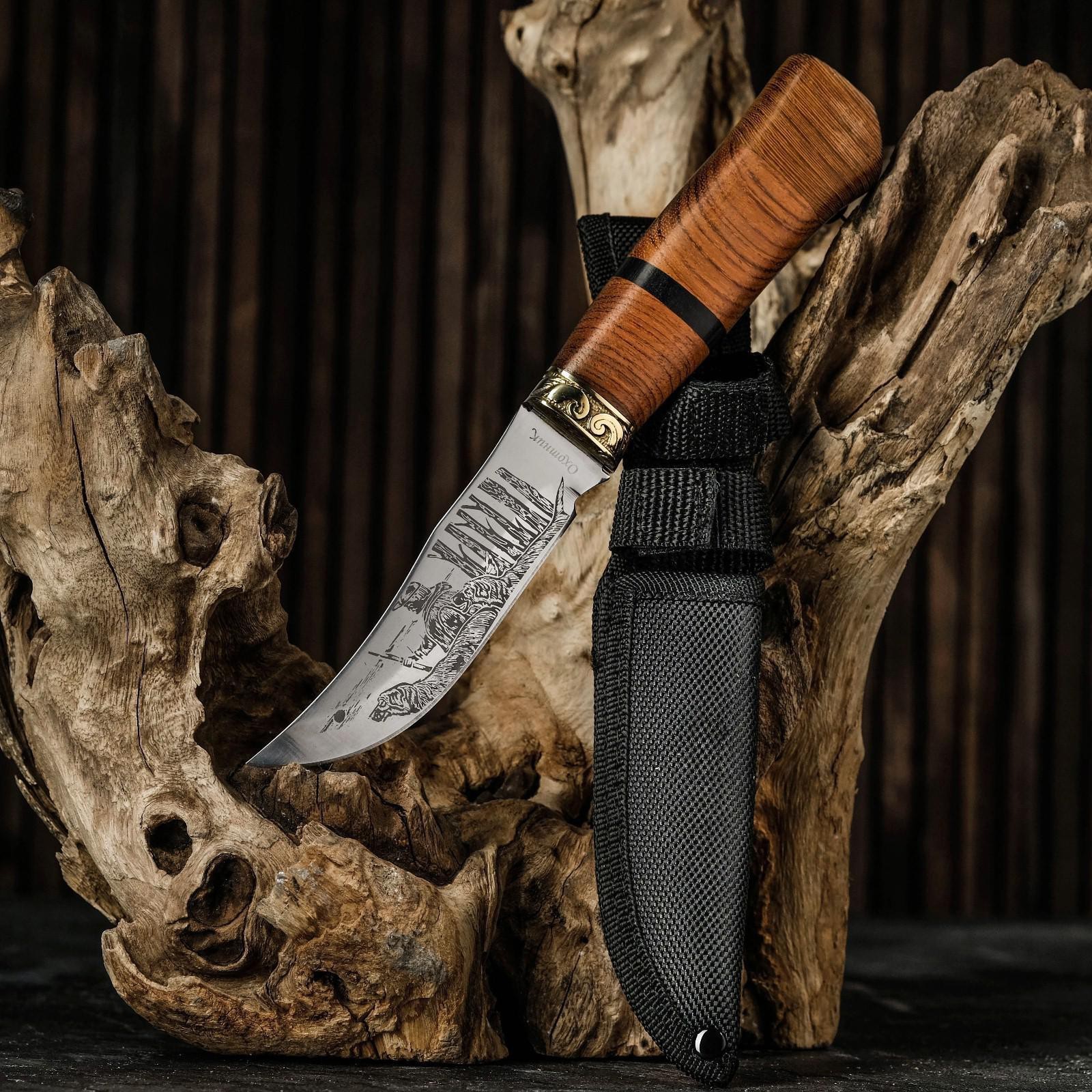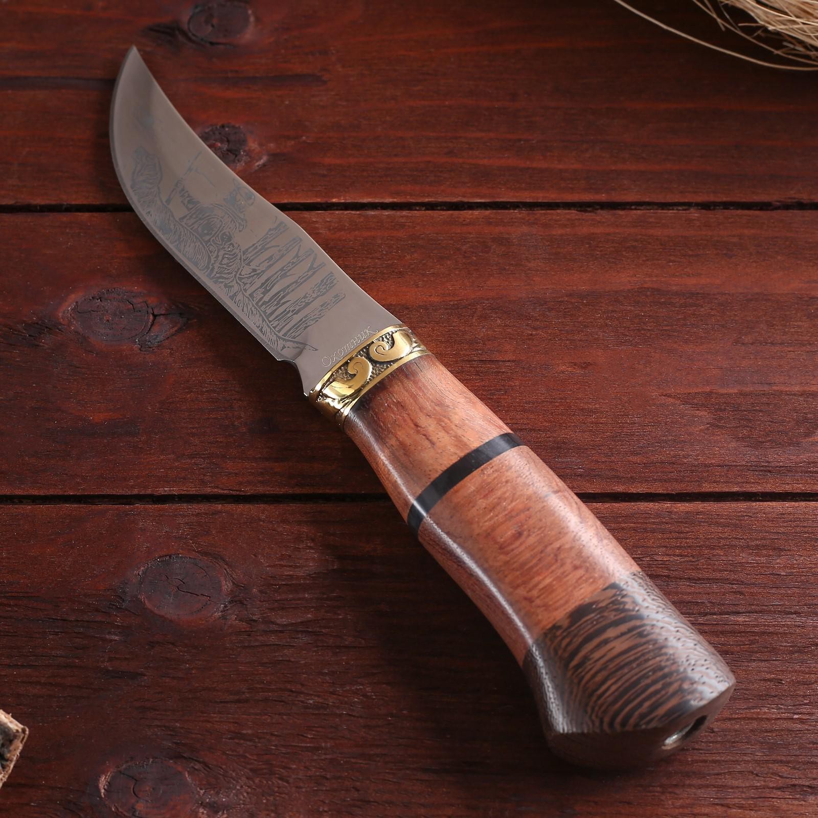 Нож охотничий "таежник" 23 см, клинок 112мм/2,8мм, дерево, с гравировкой. Длина лезвия, см: 11.1 Твёрдость лезвия, HRC: 54 Материал ручки: Дерево Сталь: 3CR13 Общая длина ножа, см: 23 Метательный нож: Нет  развернуть описание ▼