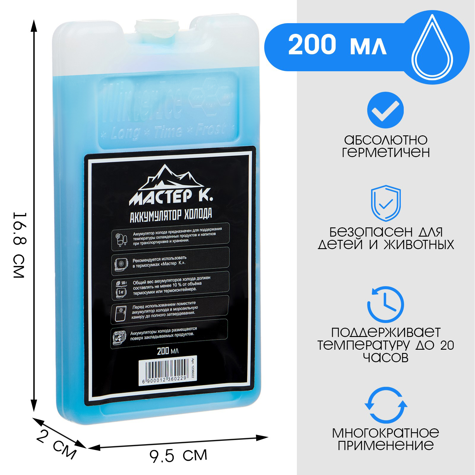 Аккумулятор холода - гелевый хладоэлемент для термосумки "мастер к.", до 20 ч, 200 мл. Путешествие, поход, туристическое приключение станут проще, если в дорогу взять портативный аккумулятор холода. Аккумулятор тепла/холода, он же хладоэлемент и холодоаккумулятор, предназначен для поддержания высокой или низкой температуры в контейнерах из вспененных материалов, сумках-холодильниках и термопакетах. Он равномерно распределяет холод или тепло внутри термосумки, не протекает, обеспечивает долговременное охлаждение продуктов. Термоаккумулятор также используется медицинскими работниками и спортсменами для охлаждения или прогревания отдельных участков тела при ушибах и гематомах, или для восстановления мышц после интенсивных тренировок. Этот компактный резервуар со специальным гелевым растровом (хладагентом) обладает высокой теплоемкостью. Криопакет актуален для хранения продуктов питания и напитков, когда предстоят продолжительные поездки или же отправка на пикник. А также, хранения лекарств, которые требуют пребывания в прохладной среде. Маленький охладитель прост в использовании: достаточно поместить его в холодильник или морозилку на 8-12 часов. После этого терморегулятор можно разместить в термосумке, контейнере, сумке-холодильнике, термопакете или аптечке. Количество элементов, необходимых для охлаждения, зависит от объемов аксессуара. На каждые 10 литров необходимо использовать 300-500 мл охладителя. Располагать рекомендуем на разных сторонах сумки, а для более эффективного охлаждения, аккумуляторы следует размещать между продуктами. Для отдыха на природе, путешествий на автомобиле, рыбалки, охоты, рюкзака – аккумулятор холода способен пригодиться в самых разных ситуациях. Для дачи, садового домика, где нет полноценного холодильника, он станет незаменимым решением. В таких условиях его можно использовать как автомобильный холодильник. Длина, см: 20 Ширина, см: 10 Объём, л: 0.2 Время сохранения тепла/холода, ч: 20 Объём, мл: 200 Вид: Аккумулятор температуры Вид: Твёрдый  развернуть описание ▼