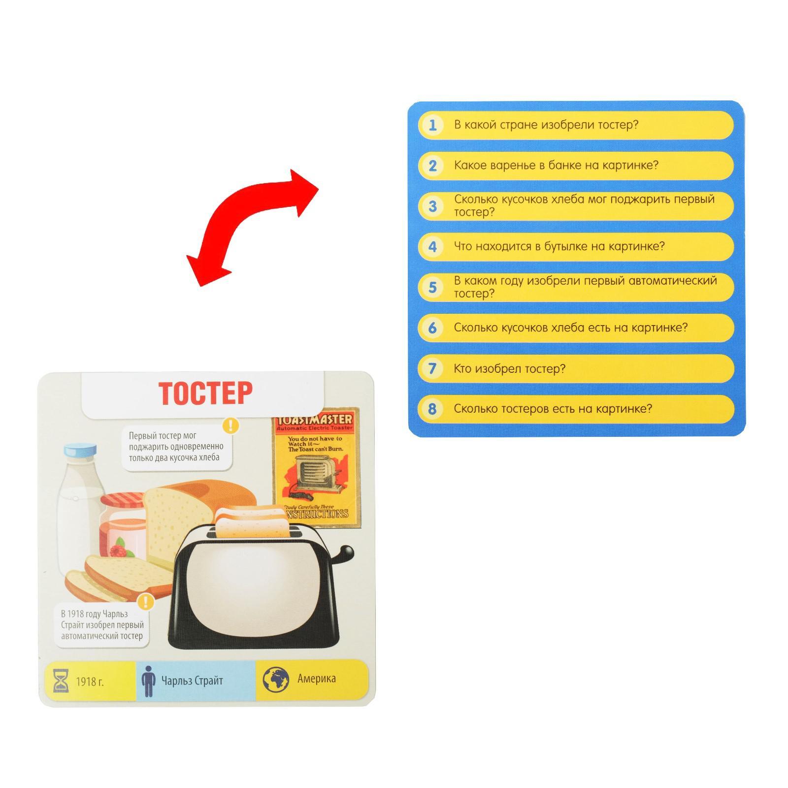 В наборе вы найдёте 50 карточек. На каждой из них нарисовано изобретение, а также указана краткая информация о нём: дата появления и некоторые интересные факты . Изучив карточку в течение 15 секунд, киньте кубик, а цифра вам укажет на номер задания. Все вопросы находятся на обороте карточек и относятся не только к цифрам и фактам, но ещё и к самому изображению. Тот игрок, кому удалось верно ответить на вопрос, забирает карточку себе, а побеждает самый внимательный участник, набравший больше всех карт!