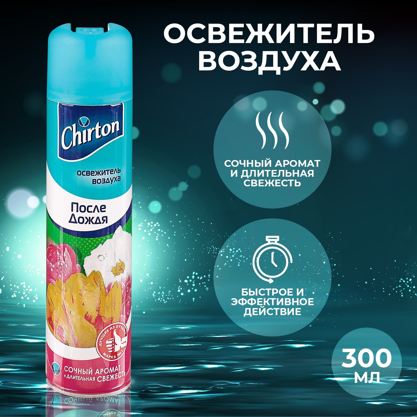 Освежитель воздуха chirton "после дождя", 300 мл. Освежитель предназначен для устранения неприятных запахов и ароматизации воздуха в жилых и нежилых помещениях. Действует быстро и эффективно. Имеет приятный и стойкий аромат, который наполняет дом свежестью и уютом. Способ применения: хорошо встряхнуть баллон, нажать на клапан и в течение нескольких секунд распылить освежитель в воздух, направив струю аэрозоля вверх и разные стороны. Баллон не переворачивать. Попадание аэрозоля на стены и на предметы интерьера не допускать! Меры предосторожности: использовать только по назначению. Осторожно. Воспламеняющийся аэрозоль. Не распылять вблизи открытого огня или других источников воспламенения. При распылении не курить! Беречь от источников воспламенения, нагревания, искр и открытого огня. Беречь от солнечных лучей, избегать нагревания не выше + 50 С. Баллон под давлением. Не нарушать целостность упаковки и не сжигать, даже после использования. Раздражитель! Не допускать попадания в глаза. При попадании в глаза немедленно промыть их большим количеством воды и обратиться за медицинской помощью. Избегать попадания на кожу. Не вдыхать! Не глотать! Беречь от детей! Хранить в сухом месте, вне доступа детей, отдельно от пищевых продуктов. Состав: вода 30%, пропан бутановая смесь 30%, сорбитан олиат 5%, пропиленгликоль 5%, бензонат натрия 5%, нитрит натрия 5%, парфюмерная композиция 5%, бензилсалицилат, гераниол, бутилфенил метилпропионал, д-лимонен, линалоол. parts count: 0 Объём, мл: 300 Аромат: Цветы Форма выпуска: Аэрозоль Принцип работы: Ручной Вид распыления: Влажное : 0 Тип: Освежитель воздуха  развернуть описание ▼