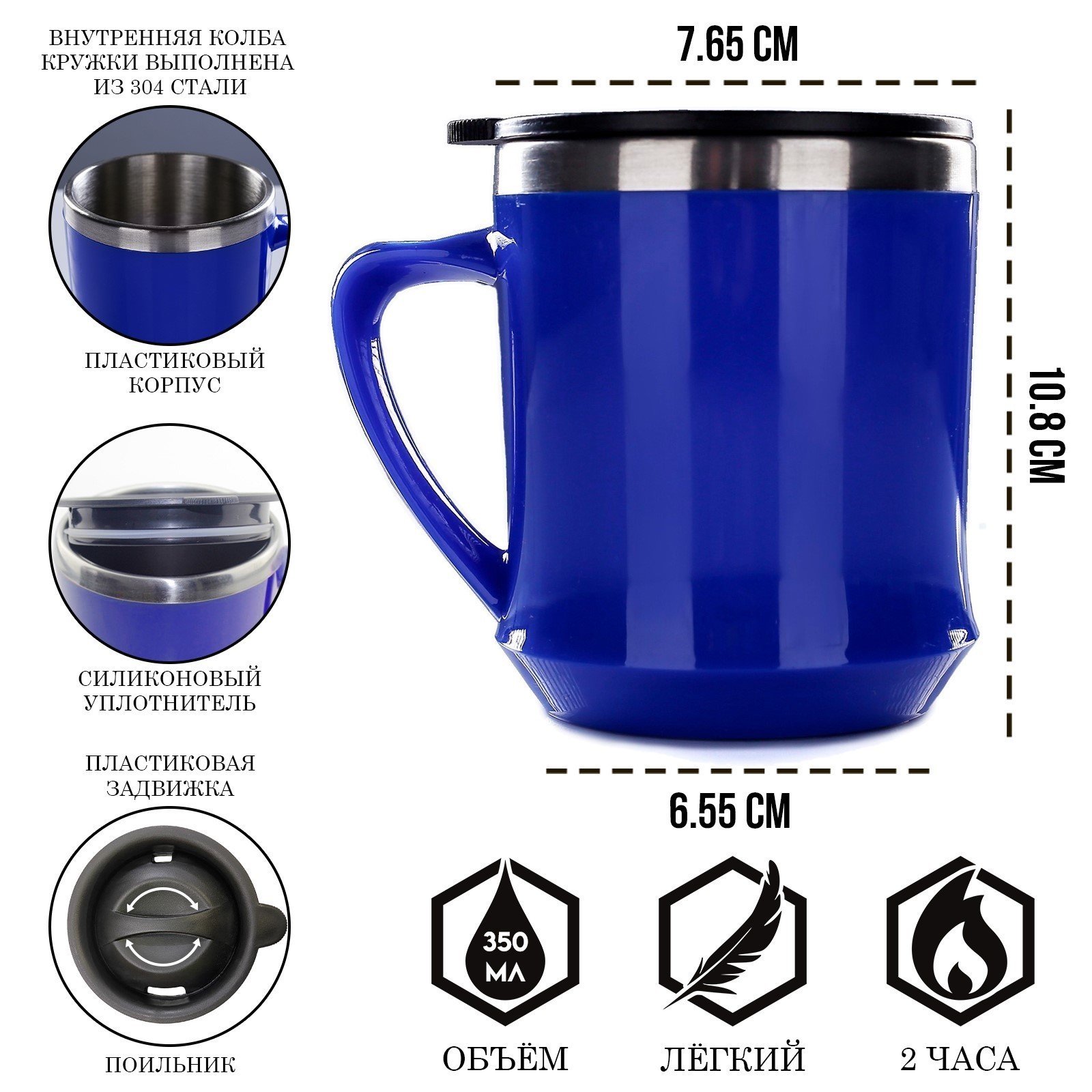 Термокружка, 350 мл, lifestyle, сохраняет тепло 2 ч, 9 х 10.8 см, синяя. Стильная и яркая термокружка "Мастер К" для кофе и чая, подарит вам тепло и уют. Двухслойная конструкция кружки из пластика (не содержит бисфенол) снаружи и 304 нержавеющей стали внутри. Внутренняя колба из нержавеющей стали не впитывает запахи, не влияет на вкус напитка и легко моется. Термокружка "Мастер К" 350 мл (0. 35 л) это яркое решение для любителей чая, кофе, травяных, ягодных и фруктовых заварок. Она позволяет не только согреться горячим кофе, чаем, матчей, какао, но и идеально подходит для прохладных напитков: чай со льдом, смузи или айс-кофе, которые вы можете взять с собой куда угодно. Стильный внешний вид термо стакана делает его классным подарком на новый год, другу, подруге, брату, сестре, девушке, папе, маме, мужу, жене, бабушке и дедушке на день рождения, 23 февраля, 8 марта, 14 февраля. Термокружка "Мастер К" выполнена на основе двухслойной конструкции из пластика снаружи и нержавеющей стали внутри, при горячих напитках кружка не будет нагреваться и вам будет комфортно держать ее в руке. Вставная крышка оснащена силиконовым уплотнителем, небольшим отверстием (поильник), которое оснащено пластиковой задвижкой от случайного выплёскивания жидкости. При желании Вы можете снять крышку и использовать ее без нее. Классическая форма стакана обеспечит удобство использования, а авторский дизайн подчеркнёт индивидуальность обладателя. Характеристики теплоизоляции: При температуре окружающей среды +20 °С. Начальная температура — 95 °С (через 1 час — 65 °С, через 2 часа — 45 °С) Цвет: Синий Время сохранения тепла/холода, ч: 2 Объём, мл: 350 Крышка: Да Материал: Пластик Материал: Металл Наличие дополнительной ёмкости: Нет Особенности: Под нанесение  развернуть описание ▼
