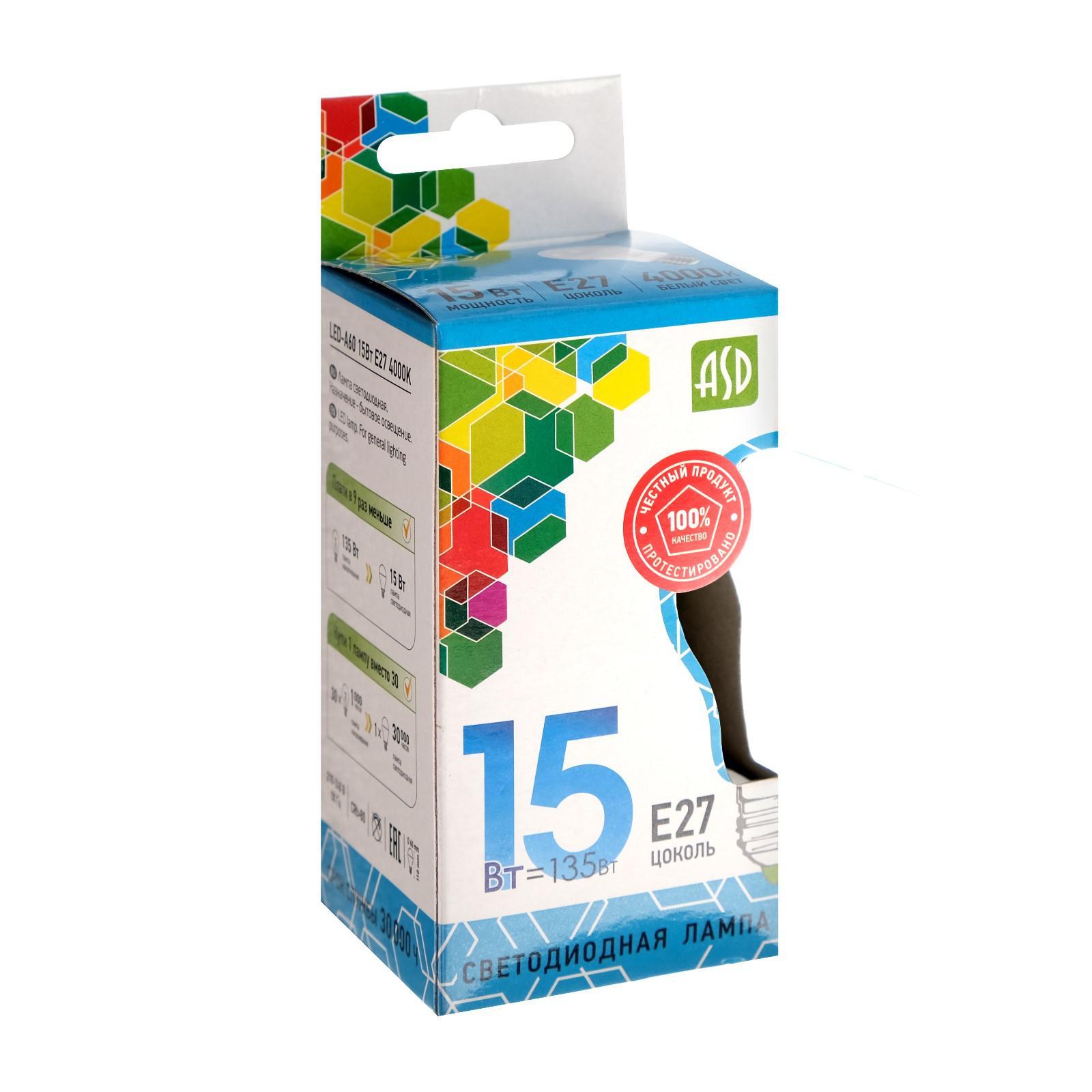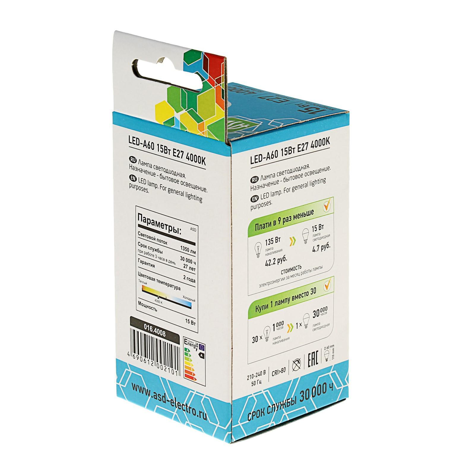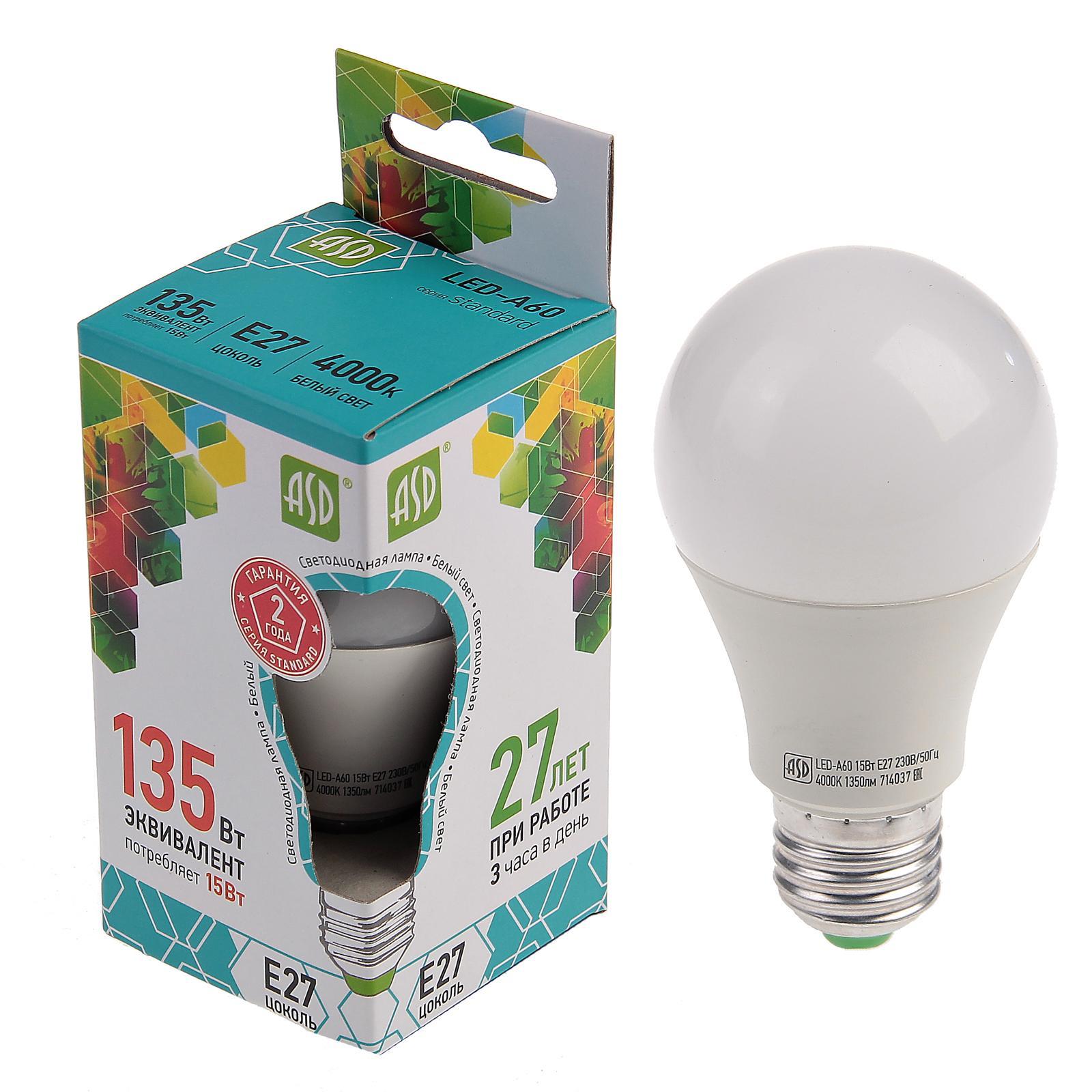 Лампа светодиодная asd led-a60-standard, е27, 15 вт, 230 в, 4000 к, 1350 лм. Цвет свечения: Белый Вид лампы: Светодиодная Цоколь: E27 Мощность, Вт: 15 parts count: 0 Гарантийный срок, мес.: 12 Напряжение, В: 220 Световой поток, лм: 1350 Цветовая температура: 4000К Форма лампы: Груша Индекс цветопередачи: RA > 80 Диммируемая: Нет Класс энергоэффективности: A+  развернуть описание ▼