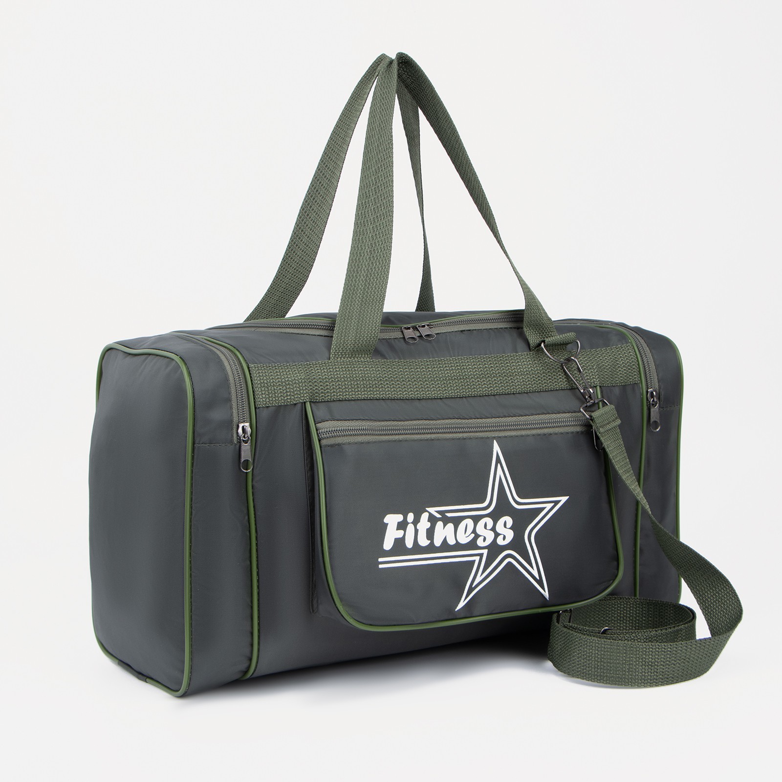 Сумка спортивная мужская на молнии, 3 наружных кармана, длинный ремень, средний размер, цвет зелёный
