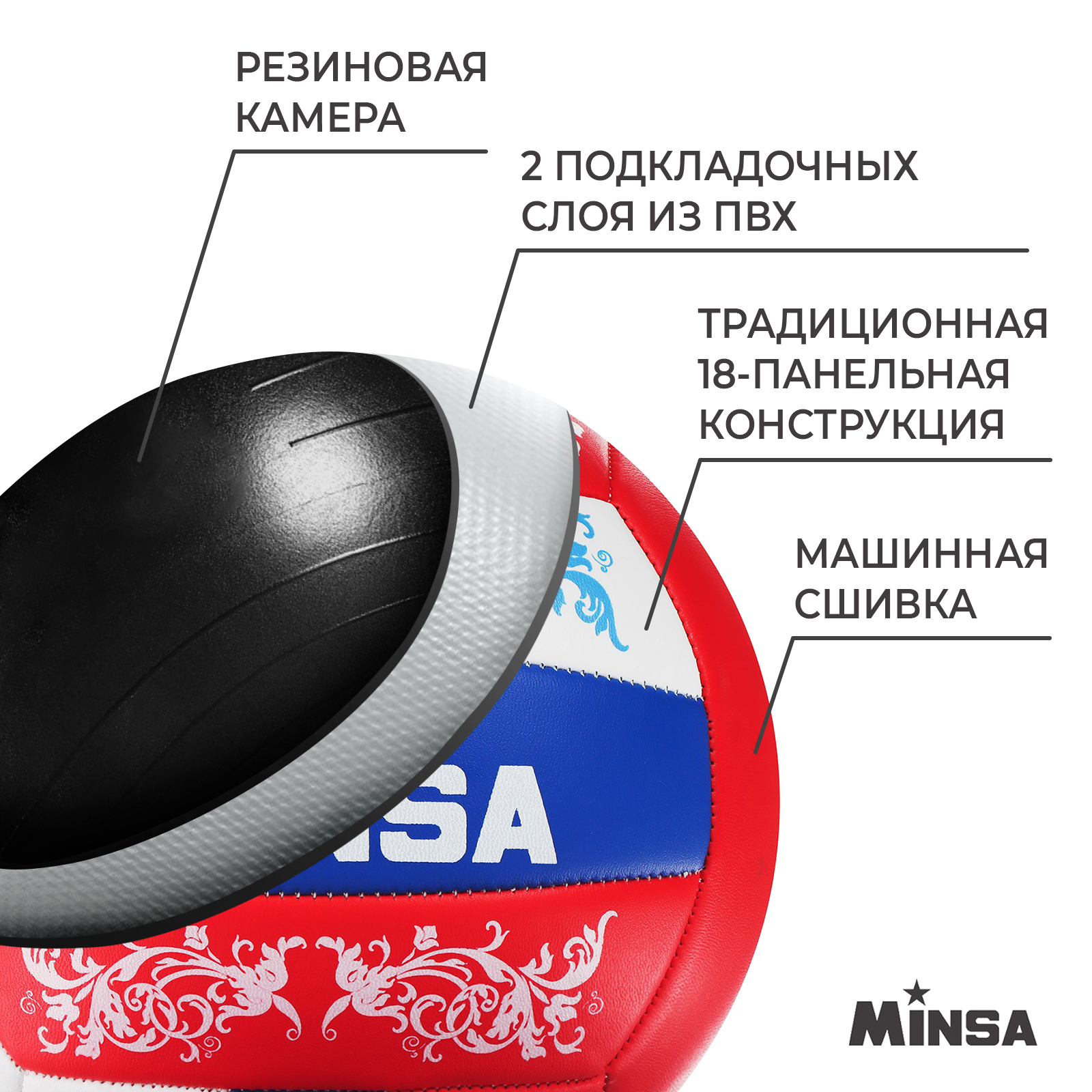 Волейбольный мяч minsa, машинная сшивка, 18 панелей, р. 5, pvc. Волейбольный мяч предназначен для игры на различных типах площадок, в зале и на песке. Данная модель подходит для любителей и начинающих игроков. Характеристики Материал покрышки: ПВХМатериал камеры: резинаКоличество панелей: 18Тип соединения: машинная сшивкаРазмер мяча: 5Количество подкладочных слоёв: 2Уровень: любительский Цвет: Разноцветный Количество подкладочных слоёв: 2 Размер мяча: 5 Количество панелей: 18 Диаметр, см (+/- 7 мм): 21 Вес, г (+/- 15 г): 265 Материал: ПВХ Тип соединения панелей: Машинная сшивка Уровень спорта: Любительский Материал камеры: Резина  развернуть описание ▼