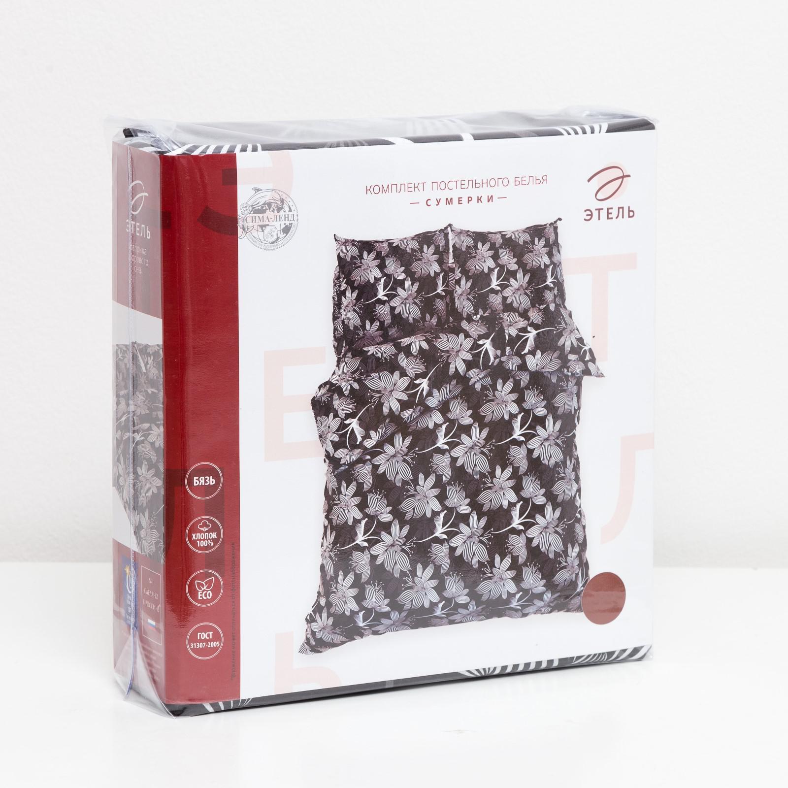 Постельное бельё евро «этель. сумерки», бязь. Постельное бельё «Этель: бязь» освежит интерьер любой спальни, внесёт в него новые краски и создаст в комнате неповторимый комфорт и атмосферу уюта. Чем хороша бязьx Комплекты из этой ткани — выбор практичных людей. Данный материал обладает массой положительных качеств. Он: приятный на ощупь;подходит даже для людей с чувствительной кожей;отлично пропускает воздух и впитывает влагу, поддерживая комфортный микроклимат в постели на протяжении всей ночи;неприхотлив в уходе;не даёт усадки после стирки.Особенности постельного белья Постельное бельё соответствует стандартам ГОСТ 31307-2005 и имеет европейский сертификат качества Oeko-Tex.09.HRU.73228.Изделия изготовлены из 100 % натурального экологически чистого хлопка.Плотность ткани составляет 125 г/м .Для нанесения рисунков использовались качественные европейские красители. Именно поэтому цвета надолго останутся яркими и насыщенными, а аллергия и раздражения пройдут мимо.Простыня без поперечного шва!Все внутренние швы дополнительно обработаны оверлоком, чтобы избежать естественного осыпания края.Вход в пододеяльник и наволочки оформлен клапаном, простыня без резинки.Комплектация: Пододеяльник, 200 217 см — 1 шт.; простыня 220 240 см — 1 шт.; наволочка, 70 70 см — 2 шт. Рекомендации по уходу за изделиями: стирка при температуре не выше 40 °C без использования отбеливающих средств. Цвет:Чёрный|Размер наволочки, см:70 х 70|Ткань:Бязь|Плотность, г/м :125|Размер:Евро|На резинке:Нет|Тематика:Цветочно-растительная|Вид упаковки:PVC-пакет|Декоративные элементы:Без элементов|Рекомендации по уходу:Бережный режим глажки|Рекомендации по уходу:Не отбеливать|Рекомендации по уходу:Барабанная сушка при низкой температуре|Рекомендации по уходу:Деликатная стирка при 40 °С|Состав ткани:Хлопок|Количество наволочек:2|Режим стирки:При 40 градусах|Вид простыни:Стандартная|Отделка:Без отделки|Вид печати:Пигментная|Размер пододеяльника, см:200 х 217|Размер простыни, см:240 х 220|Простыня в комплекте:Да|Особенности простыни:Стандартная|Вид застёжки наволочки:Клапан|Вид застёжки пододеяльника:Без застёжки|Страна:Россия  развернуть описание ▼
