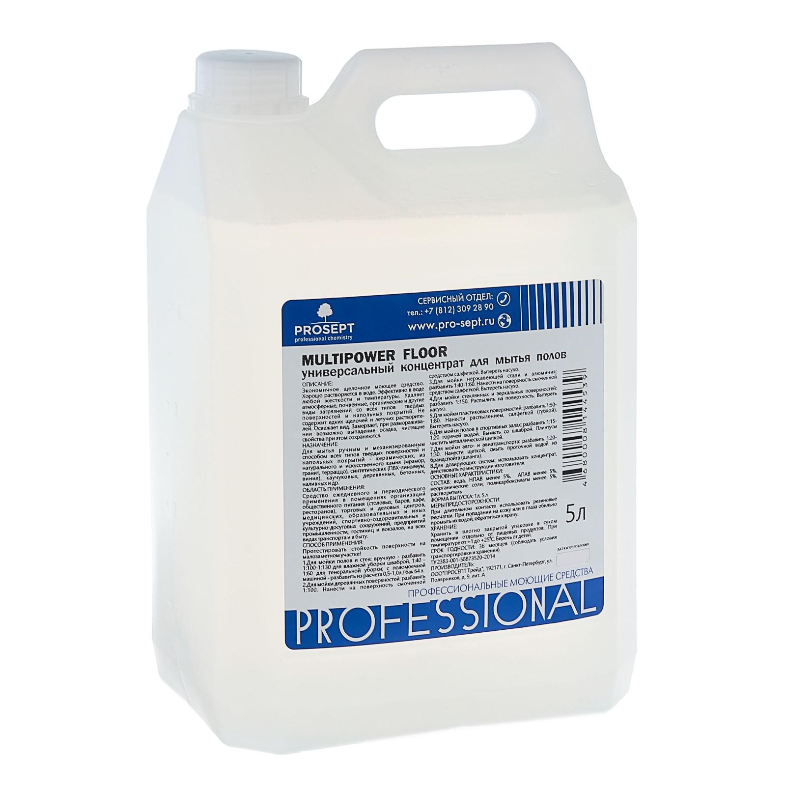 Универсальное средство для мытья полов multipower floor, 5 л. Универсальное средство для мытья полов предназначено для использования в помещениях общественного питания (столовых, ресторанах, кафе, барах), торговых и бизнес-центрах, медицинских, образовательных и других учреждениях, предприятиях промышленности, гостиницах и др. Удаляет различные загрязнения со всех типов напольных покрытий: линолеума, ламината, керамики, натурального и искусственного камня, ПВХ-плитки, винила, каучука, дерева и наливного пола. Значение pH (концентрат): 11, 0; Концентрат: 1:10 - 1:100. parts count: 0 Объём, л: 5 Вес, г/Объём, мл: 5000 Ароматизированные: Нет Особенности: Универсальное Содержание хлора: Нет  развернуть описание ▼