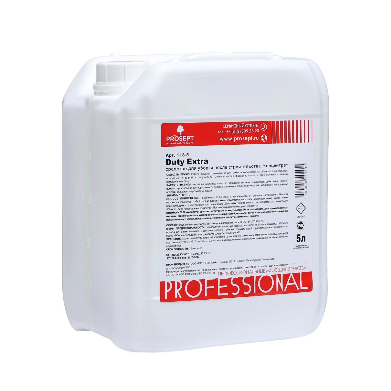 Средство для удаления строительных растворов duty extra. суперконцентрат, 5л. Средство для уборки после строительства Prosept – предназначено для очистки кирпичной кладки и швов, бетона, гранита и других поверхностей. Благодаря формуле усиленного действия средство удаляет цемент, строительные растворы, известь, солевые отложения, водный камень, клей, затирки для швов, ржавые подтеки, кальциево-карбонатные высолы. Обладает высоким очищающим действием. Преимущества: • формула усиленного действия; • для кислотостойких поверхностей; • удаляет затирку и строительные растворы; • против известковой пыли и цементных загрязнений. Способ применения: Очистка загрязнений слабой и средней степени: • Концентрат развести водой из расчёта 10-50 мл/л в зависимости от степени загрязнения. • Нанести на поверхность на 5-10 минут. Смыть водой. Очистка стойких загрязнений и остатков цемента: • Использовать концентрат, либо развести водой из расчета 200-500 мл/л. • При необходимости повторить обработку. Меры предосторожности: при работе с раствором использовать резиновые перчатки. Избегать попадания в глаза. Для приготовления раствора концентрат лить в воду. При попадании на кожу или в глаза обильно промыть водой. При необходимости обратиться к врачу. Не смешивать с другими средствами! Беречь от детей. Объём, л: 5 Вес, г/Объём, мл: 5000 Форма выпуска: Жидкость  развернуть описание ▼