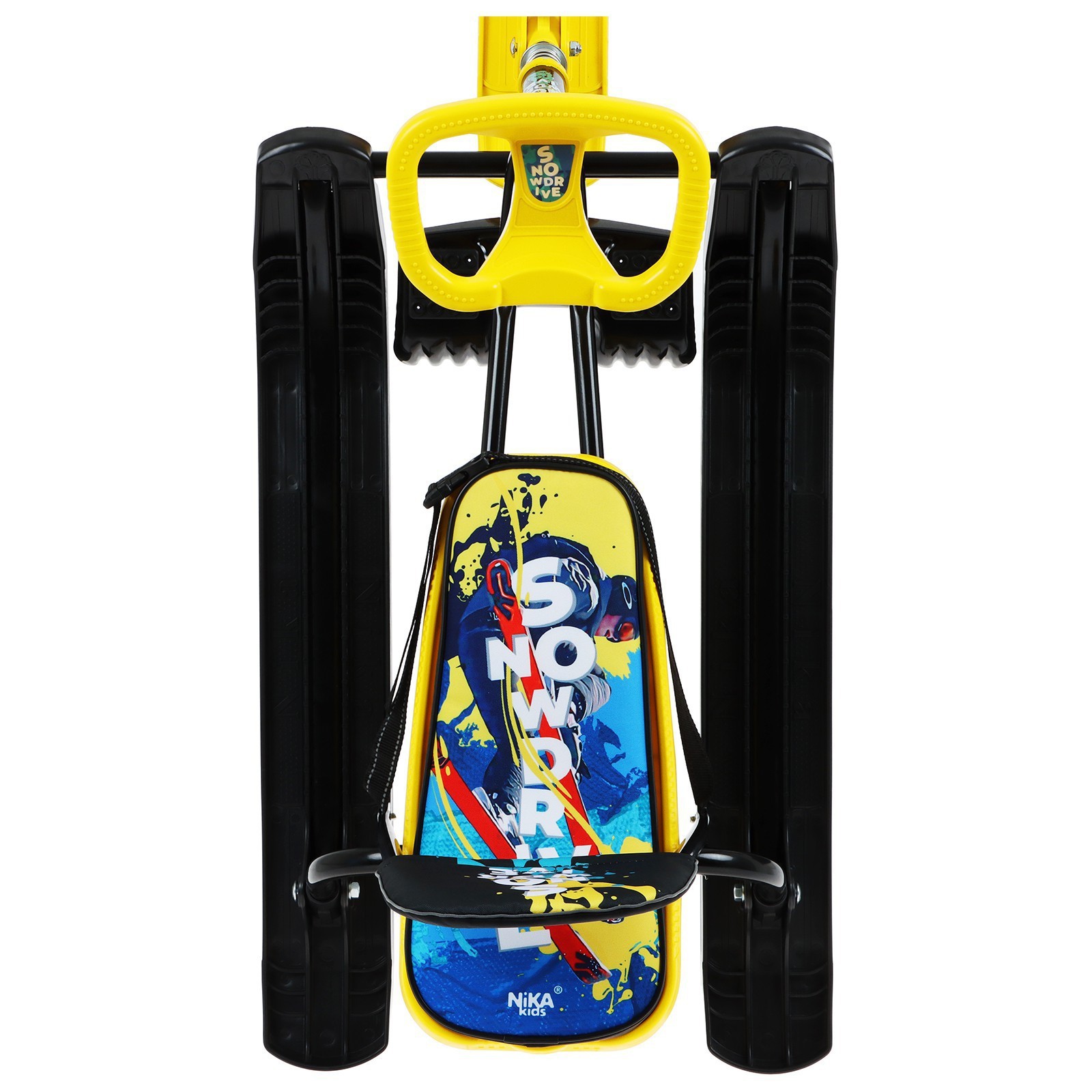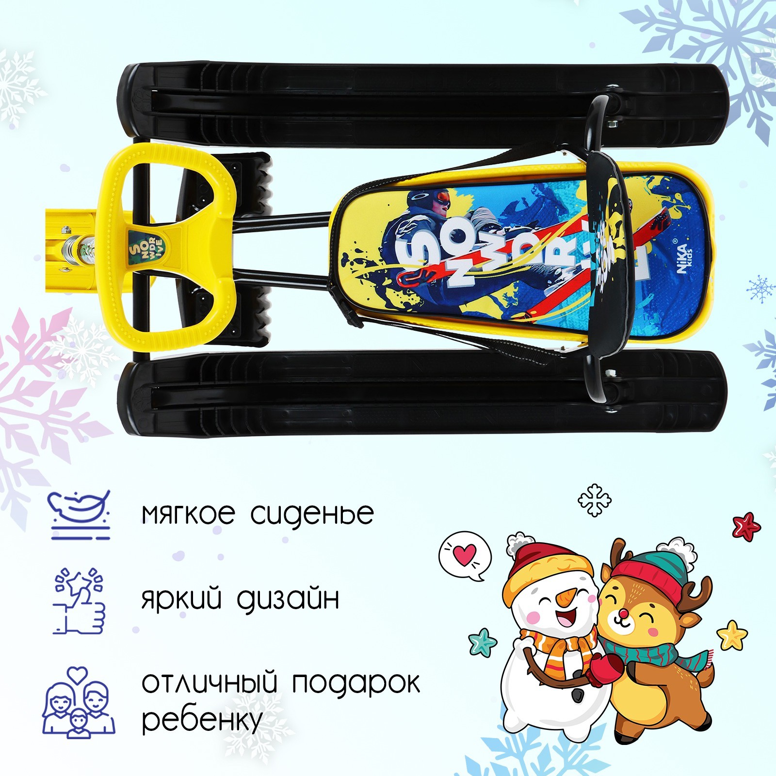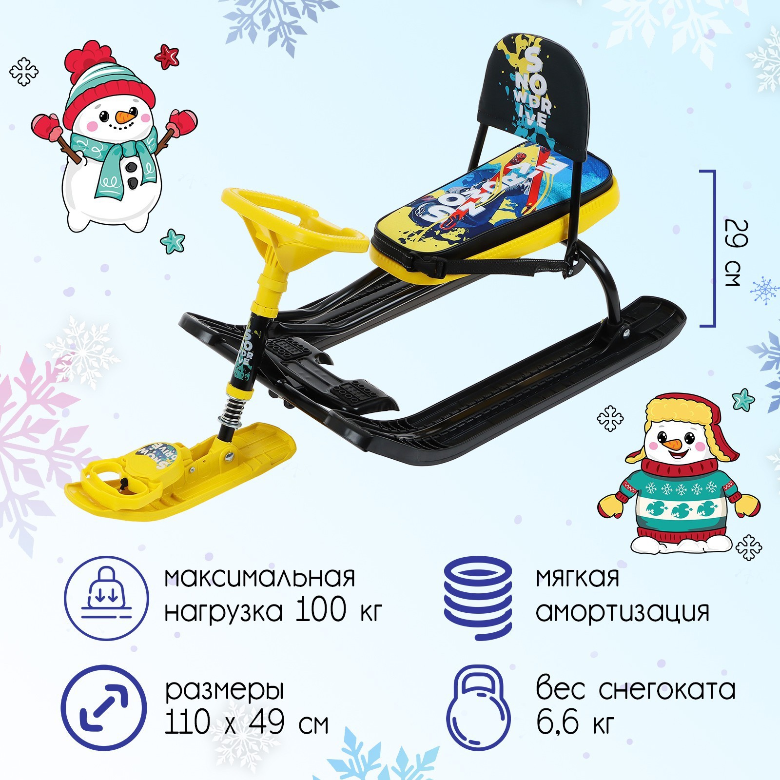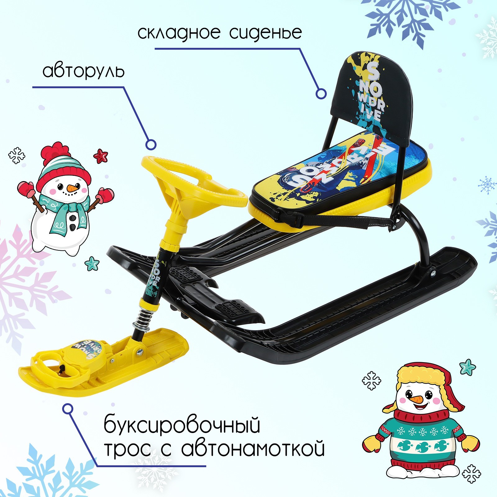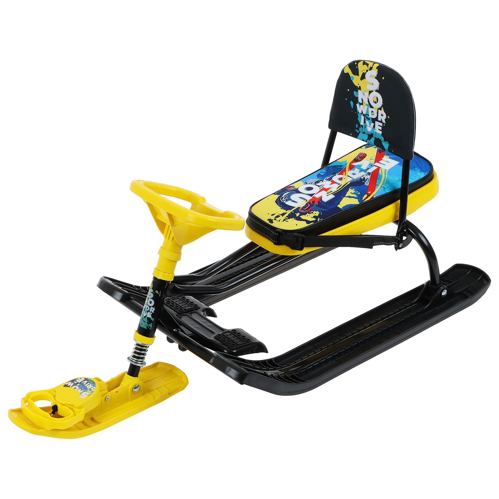 Снегокат «тимка спорт 4-1 зимний спорт», тс4-1/с, со спинкой и ремнём безопасности, цвет чёрный/жёлтый. Снегокат предназначен для перевозки детей по плотному снегу или льду, катанию с горок. Имеет сварную конструкцию из стальных труб и пластиковых элементов. Оснащён мягким сиденьем, обтянутым искусственной кожей с рисунком, складной спинкой и двухточечным ремнём безопасности. Оборудован буксировочным тросом с автоматической намоткой и системой амортизации, которая обеспечивает комфортную поездку по крутым горкам и неровным поверхностям. Усиленный тормоз эффективен на обледенелой поверхности. Характеристики АвторульБуксировочный тросШирина сиденья: 20 смДлина сиденья: 44, 5 смВысота по руль: 45 смВысота по сиденью: 29 смМаксимальная нагрузка: 100 кгМасса: 6, 6 кг Цвет: Жёлтый Возраст: От 3 лет Высота до сиденья, см: 29 Maксимальная нагрузка, кг: 100 Ручка для родителей: Нет Ремень безопасности: Да Наличие спинки: Да Тип руля: Авторуль Буксировочный трос: Автоматическая намотка Размер сиденья, см: 20 х 45 Ремень безопасности: 2-точечный (поясной) Регулировка посадочных мест: Нет Амортизатор: Да  развернуть описание ▼
