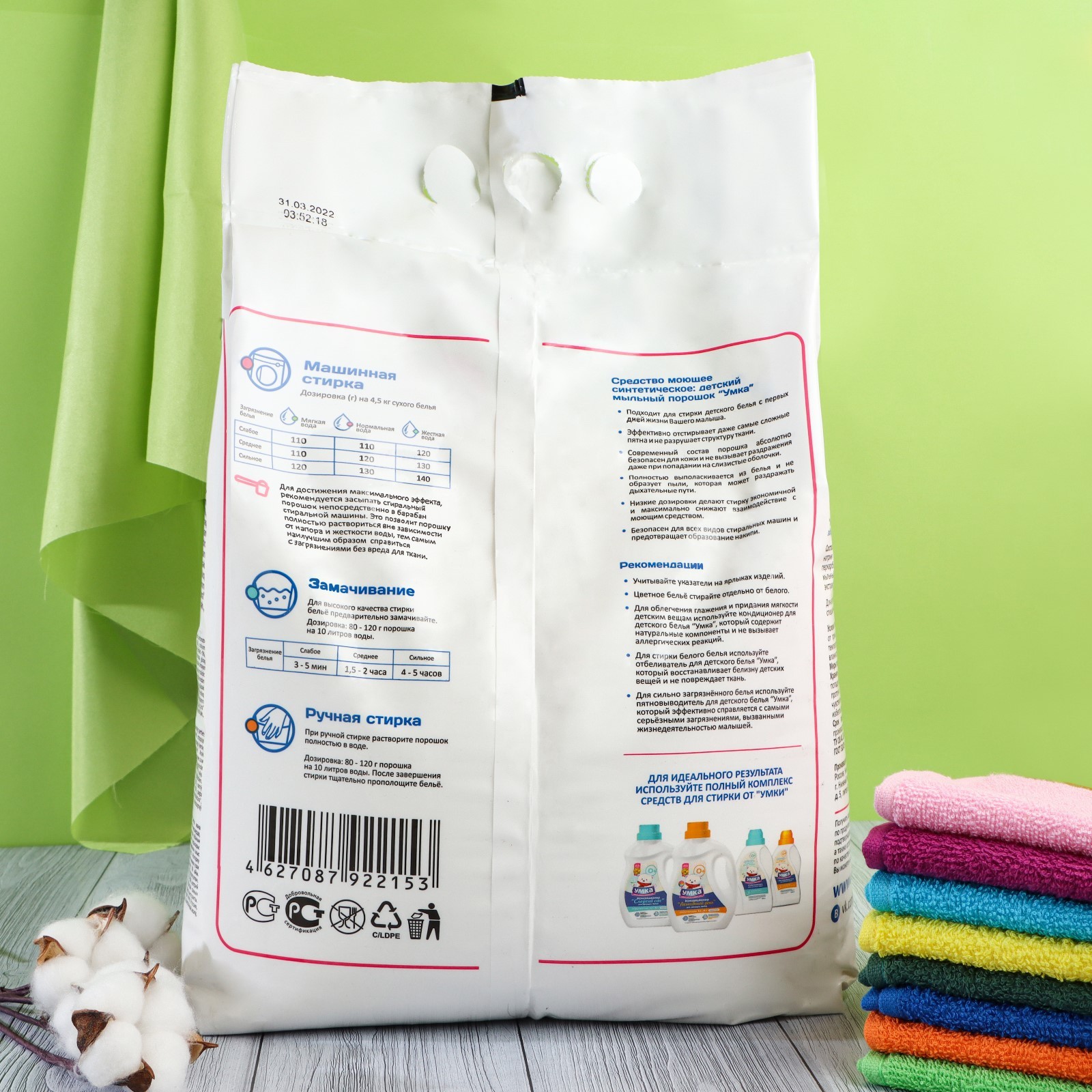 Стиральный детский порошок «Умка» разработан на основе натурального мыла, подходит для стирки детского белья с первых дней жизни.