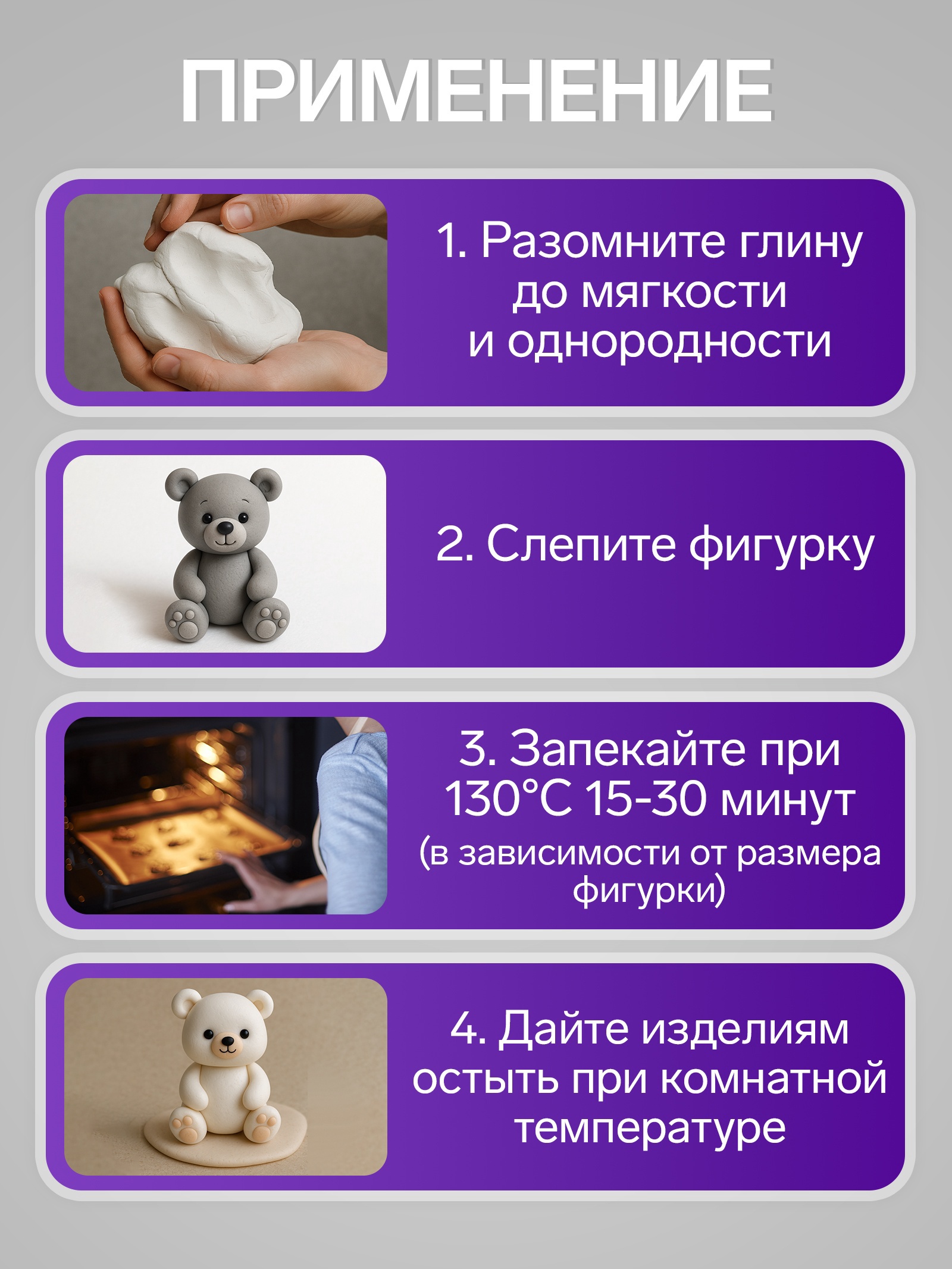 Полимерная глина calligrata 50 г, фиолетовая. ПОЛИМЕРНАЯ ГЛИНА – современный пластичный материал для лепки, который с каждым годом становится всё популярнее. Это запекаемая полимерная глина, изделия из которой подвергаются термической обработке, после чего становятся твёрдыми, прочными и влагостойкими. Идеально подходит для лепки небольших изделий (украшений, скульптурок, кукол) и для моделирования.Глина обладает отличными пластичными свойствами, хорошо размягчается и лепится, легко смешивается между собой, благодаря чему можно создать огромное количество поделок любых цветов и оттенков.Блок поделен на сегменты, что позволяет легче разделять глину на порции.В домашних условиях готовая поделка выпекается в духовом шкафу.Отвердевшие изделия могут быть раскрашены акриловыми красками, покрыты лаком, склеены друг с другом или с другими материалами.Набор:Нет|Количество цветов:1|Цвет:Фиолетовый|Европодвес:Нет|Вес, г:50|Особенности изделия:Запекаемое|Вид упаковки:Пакет|Материал:Пластик|Температурное ограничение транспортировки:Нет|Страна:Китай  развернуть описание ▼