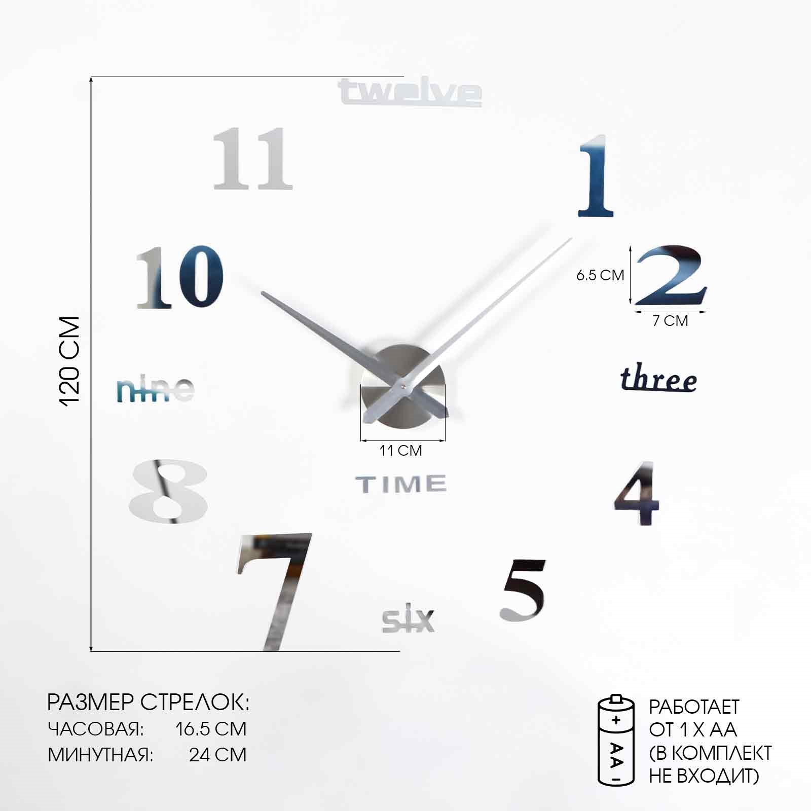 Часы настенные интерьерные большие, 3d «клермонт», плавный ход, наклейка, d-120 см. Оригинальные большие 3D часы-наклейка DIY диаметром от 80 см до 120 см серебряного цвета. Клеевой слой позволяет разместить часы на различные поверхности: окрашенные, деревянные, пластиковые, керамические или металлические, а также любые виды обоев. В комплекте к часам идет шаблон для разметки. С его помощью вы сами выбираете желаемый диаметр часов и делаете отметки на стене, куда будут клеиться элементы. Характеристики Длина минутной стрелки - 39 см. Длина часовой стрелки - 31.5 см. Ход часов – дискретный. Центральная часть с механизмом выполнена из металла, диаметр 12 см. Стрелки выполнены из сплава алюминия. Материал цифр и индексов: акрил + EVA (вспененный полистирол), что придаёт им объемный 3D эффект. В комплекте есть подробная инструкция по монтажу и креплению часов на стену с иллюстрациями. Для работы необходима 1 АА батарейка (нет в комплекте). Цвет:Серебристый|Ширина, см:120|Высота, см:120|Тематика:Интерьер|Тип индикации:Арабские цифры|Тип механизма:Кварцевый|Материал:Акрил|Материал:Металл|3D:Да|Ход стрелок:Плавный|Бесшумные:Да|Страна:Китай  развернуть описание ▼