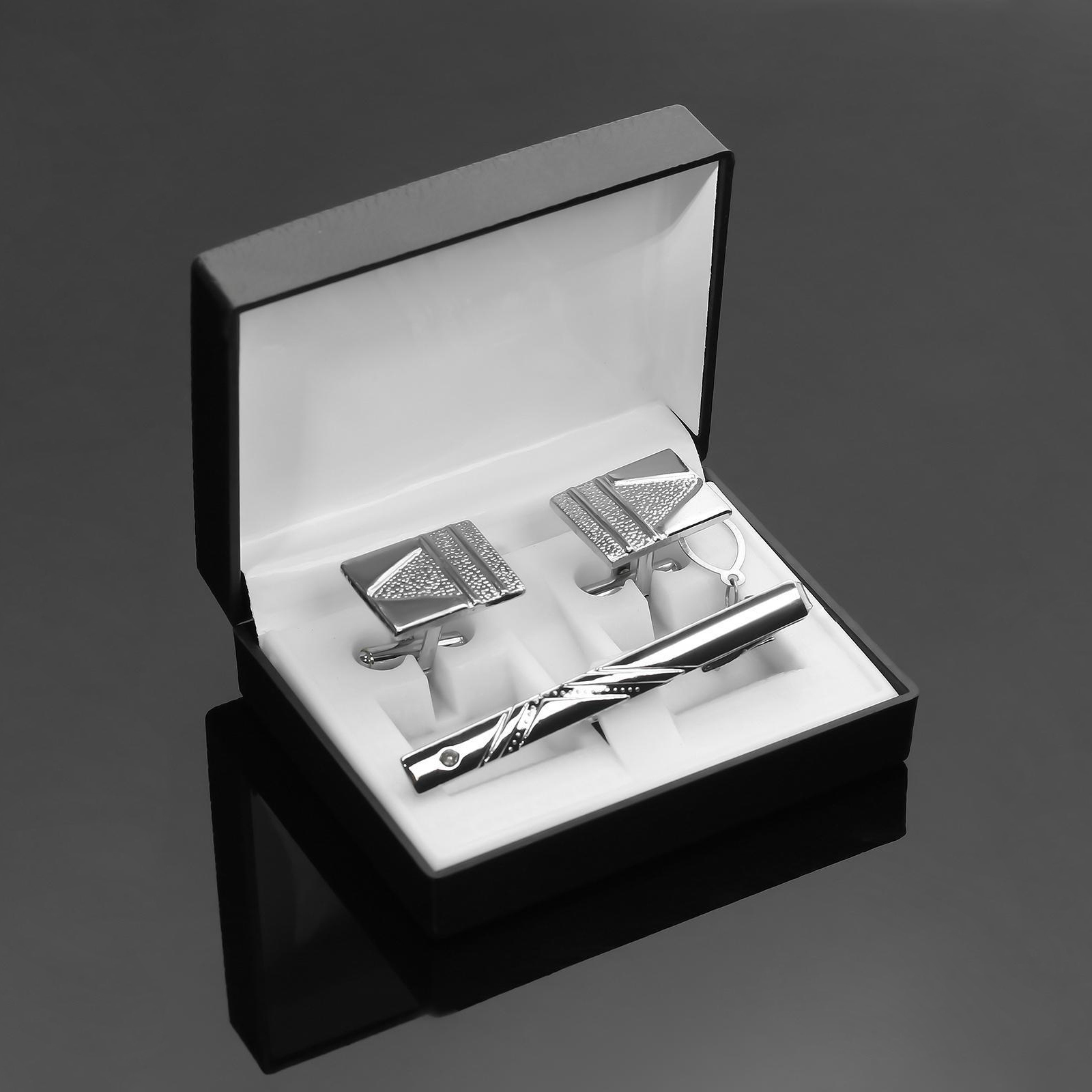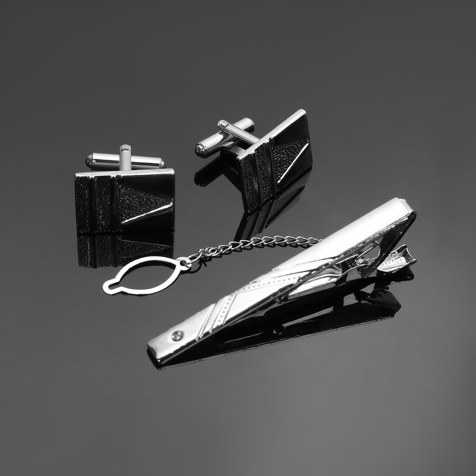 Набор мужской медный «запонки + зажим для галстука» резьба, цвет серебро