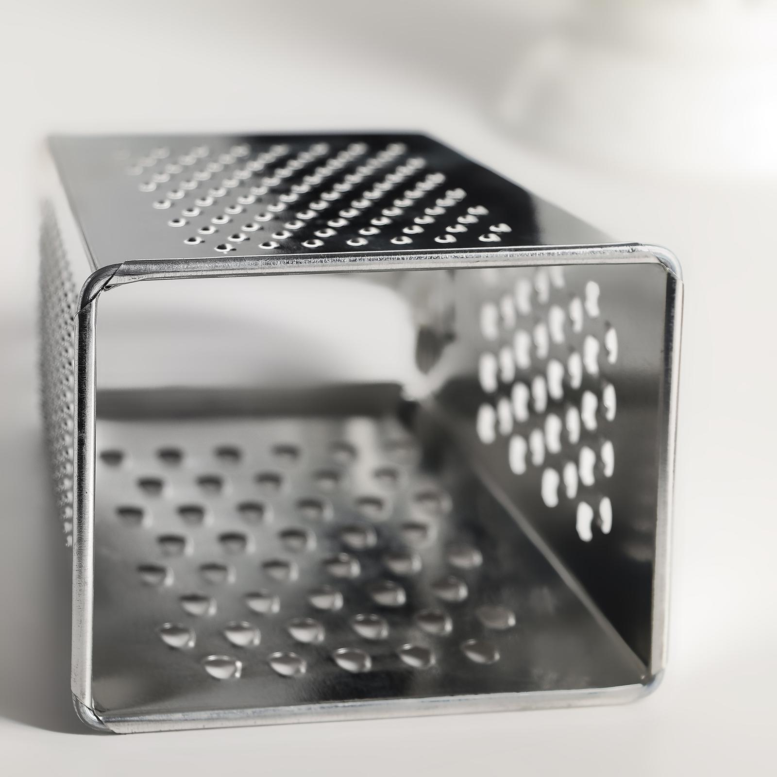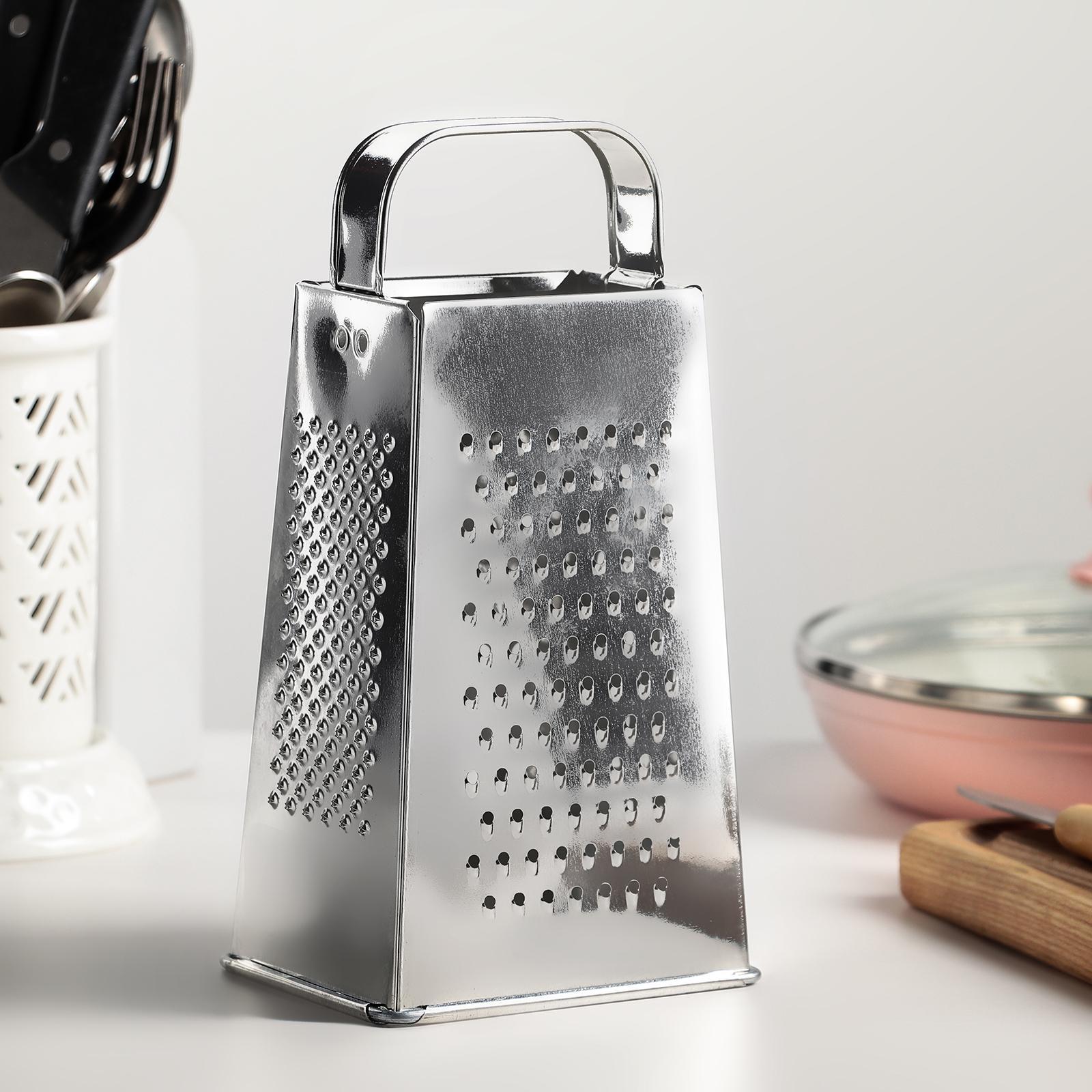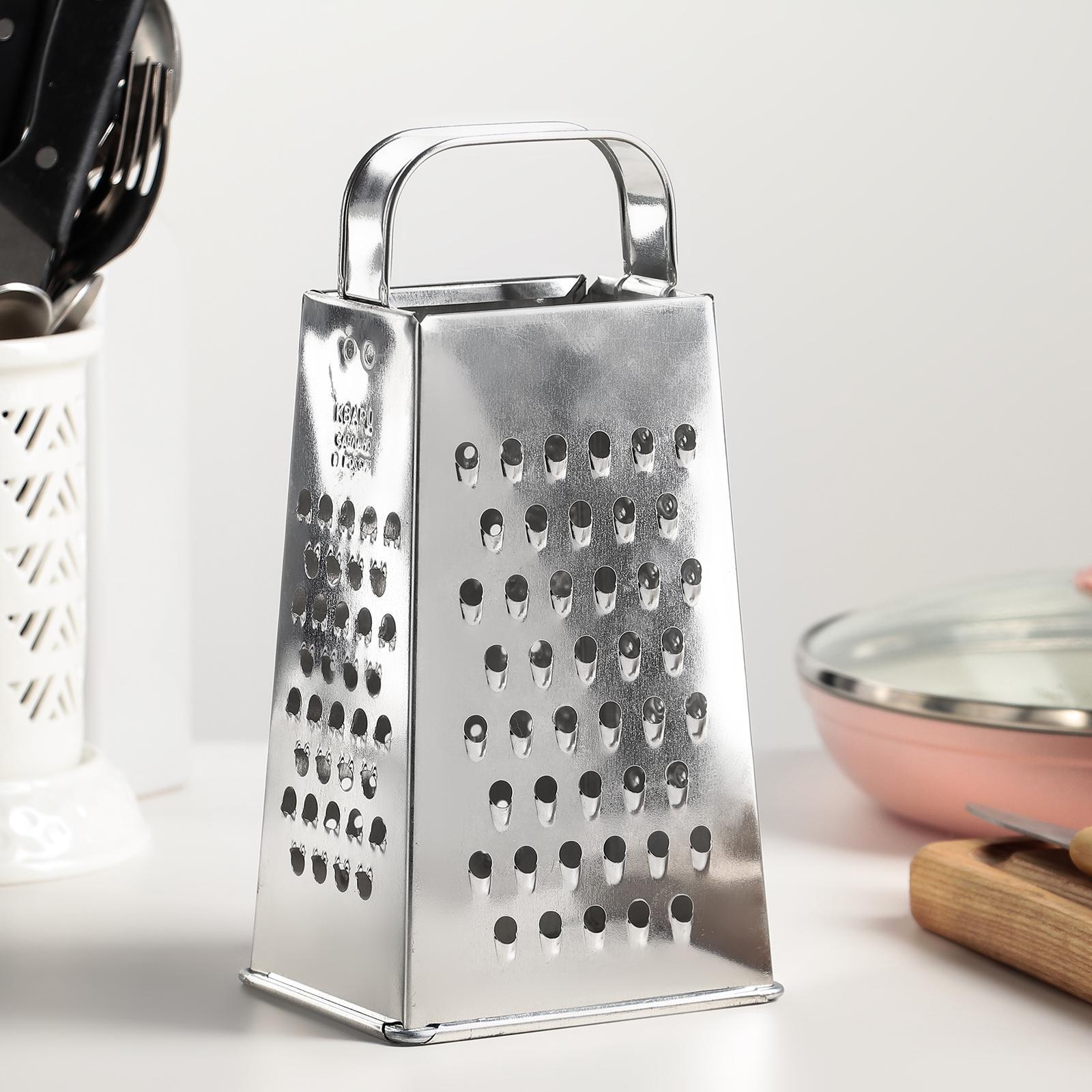 Тёрка «универсал» 4 грани, 11x8,5x22 см. Тёрка- необходимый кухонный помощник в каждом доме! Это многофункциональный и долговечный инструмент. Многие хозяйки даже не догадываются о том, сколько всего можно приготовить, если использовать все рабочие поверхности тёрки. Крупные отверстия предназначены для овощей, сыра, яиц, шоколада и масла. По секрету, кондитеры, чтобы ускорить процесс приготовления, натирают масло на крупной тёрке. Мелкие отверстия предназначены для украшения стружкой или для измельченной нарезки. С колючей стороной тёрки нужно быть осторожным, чтобы не нанести травму. Она предназначения для измельчения чеснока, острого перца, орехов, сухарей, имбиря. А также поможет снять цедру с цитрусовых. Продолговатые отверстия предназначены для нарезки овощных и фруктовых слайсов. С помощью неё можно приготовить рататуй, домашние картофельные чипсы, луковые кольца, запеканку из кабачков и многое другое. parts count: 0 Число граней: 4 tnved: 8205510090 Материал ручки: Сталь Материал: Жесть Контейнер: Нет Противоскользящее основание: Нет  развернуть описание ▼