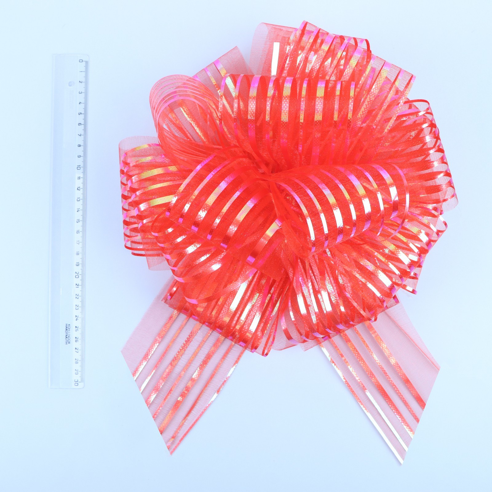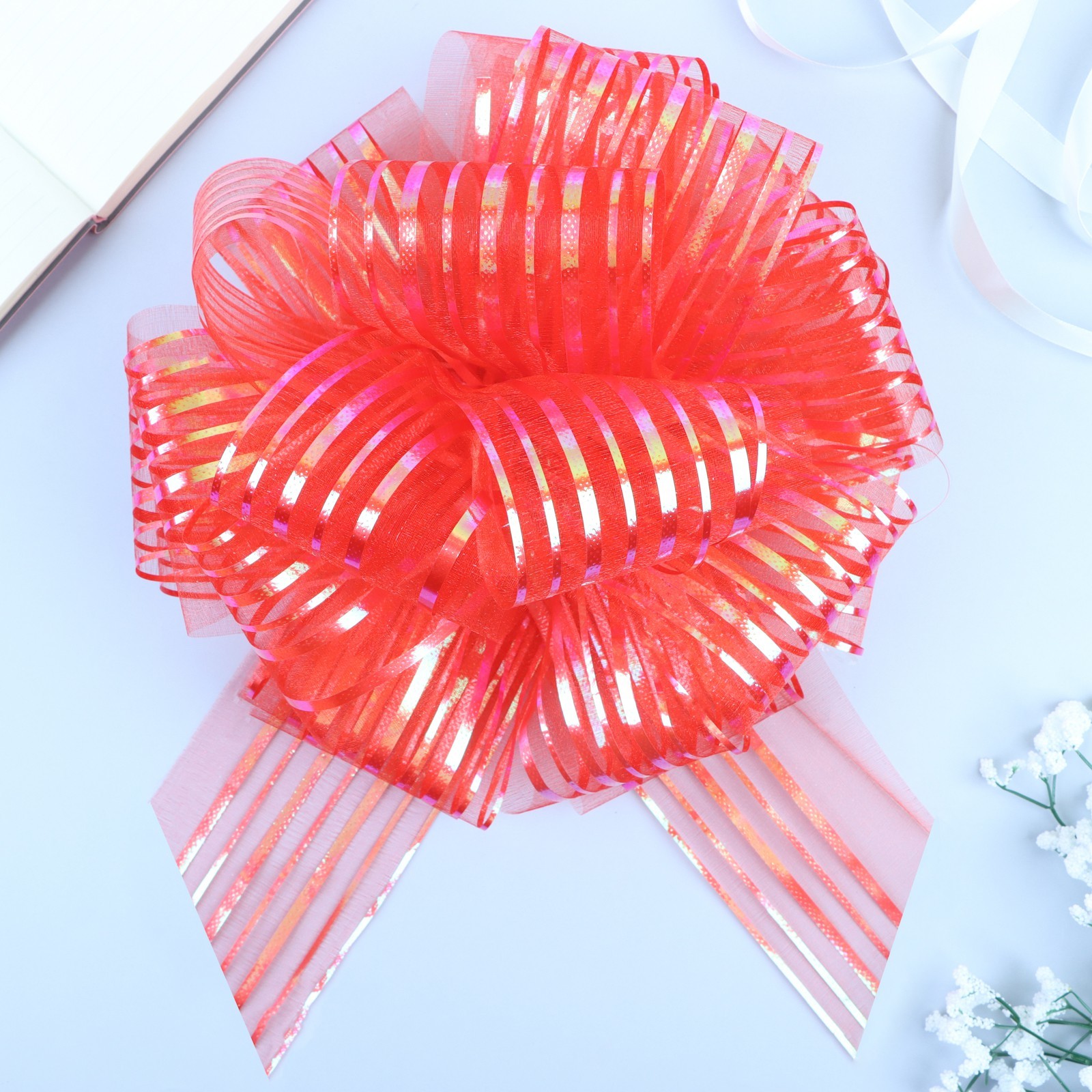 Подарочный бант - шар №10 «полоски», красный, для упаковки подарков. Каждый подарок должен быть уникальным и выделяться из массы других своей оригинальностью. Большой выбор бантов даёт возможность мастерить подарок на любой случай жизни. Такое украшение всегда актуально, вне зависимости от того, кому предназначен сюрприз — мужчине или женщине, ребёнку или людям преклонного возраста. Самое распространённое применение — упаковка всевозможных коробок от самых маленьких до достаточно больших размеров. Кроме того, банты можно использовать как декоративное украшение интерьера. . Набор:Нет|Особенности цвета:Перламутровый|Цвет:Красный|Диаметр, см:24|Ширина ленты, см:10|Тематика:Линии|Тематика праздника:Юбилей|Тематика праздника:День рождения|Тематика праздника:Универсальная тематика|Материал:Органза|Вид банта:Шар|Страна:Китай  развернуть описание ▼