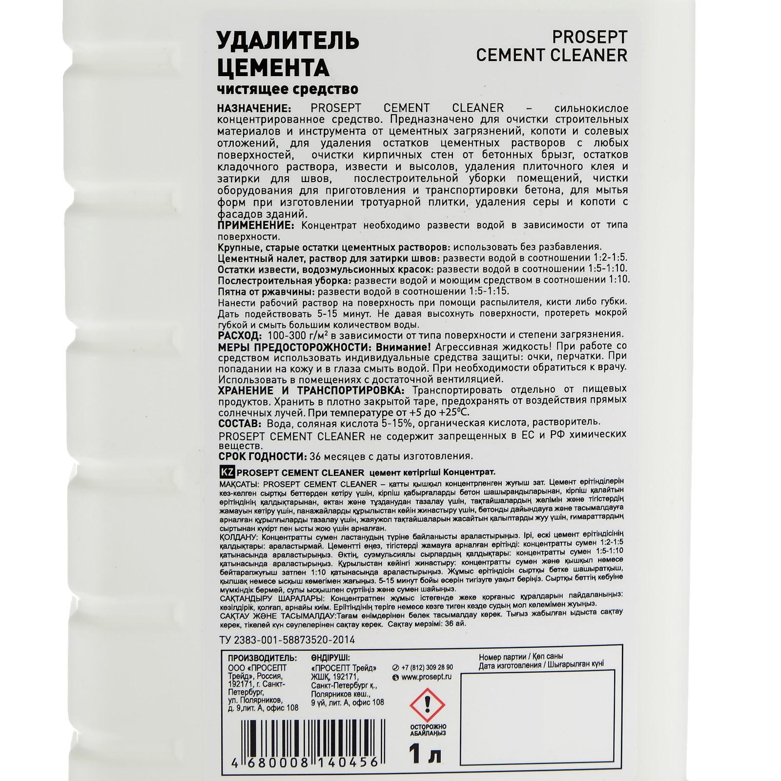 Prosept cement cleaner - удалитель цемента 1:2, 1л. Удалитель цемента Prosept – сильнокислое концентрированное моющее средство, которое эффективно очищает строительный материал и инструменты от цементных загрязнений, копоти и солевых отложений. Преимущества: • удаляет остатки цемента с любых поверхностей; • очищает стены от бетонных брызг, извести и высолов; • удаляет остатки плиточного клея и затирки для швов; • можно использовать для мытья форм при изготовлении тротуарной плитки; • подходит для устранения серы и копоти с фасадов зданий. Способ применения: Концентрат необходимо развести водой в зависимости от типа поверхности. Крупные старые остатки цементных расворов: использовать без разбавления. Цементный налёт, раствор для затирки швов: развести водой в соотношении 1:2-1:5. Остатки извести, водоэмульсионных красок: развести водой в соотношении 1:5-1:10. Послестроительная уборка: развести водой и моющим средством в соотношении 1:10. Пятна от ржавчины: развести водой в соотношении 1:5-1:15. • Нанести рабочий раствор на поврехность при помощи распылителя, кисти или губки. • Дать подействовать 5-15 минут. • Не давая высохнуть поверхности, протереть мокрой губкой и смыть большим количеством воды. Меры предосторожности: Внимание! Агрессивная жидкость! При работе со средством использовать индивидуальные средства защиты: очки, перчатки. При попадании на кожу и в глаза смыть водой. При необходимости обратиться к врачу. Использовать в помещениях с достаточной вентиляцией. Беречь от детей! Объём, л: 1 Вес, г/Объём, мл: 1000 Форма выпуска: Жидкость  развернуть описание ▼
