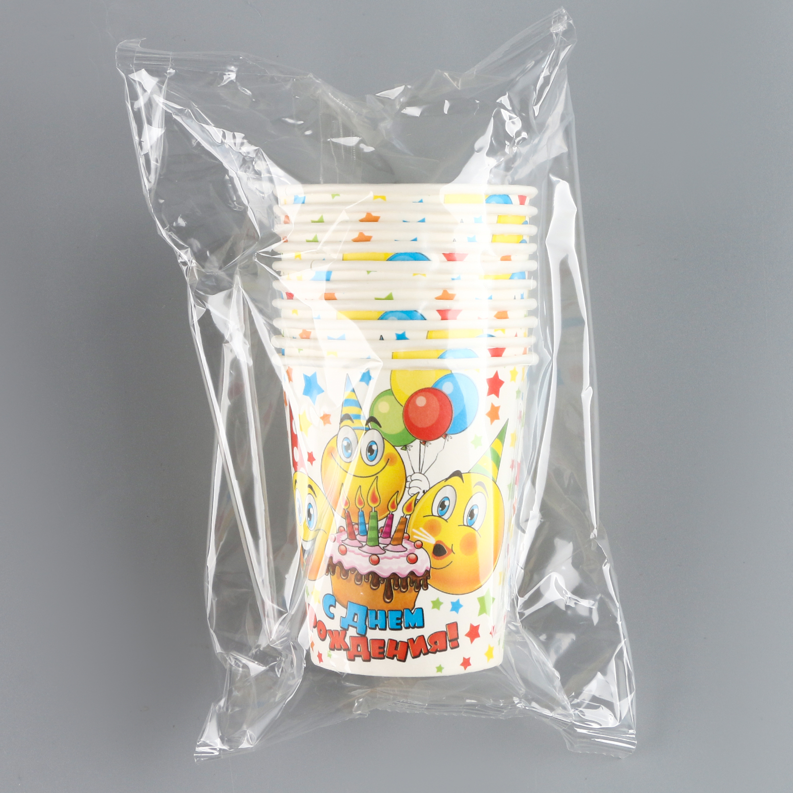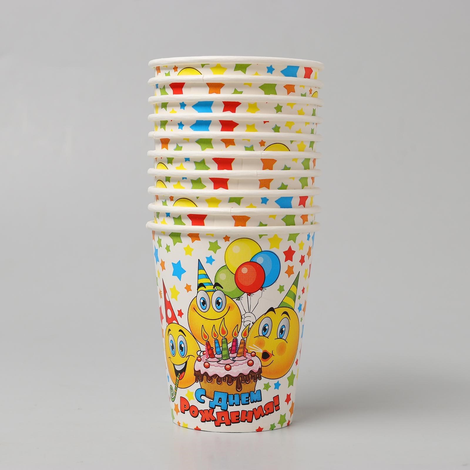 Стакан одноразовый бумажный "с днем рождения" смайлы, тортик (250 мл)