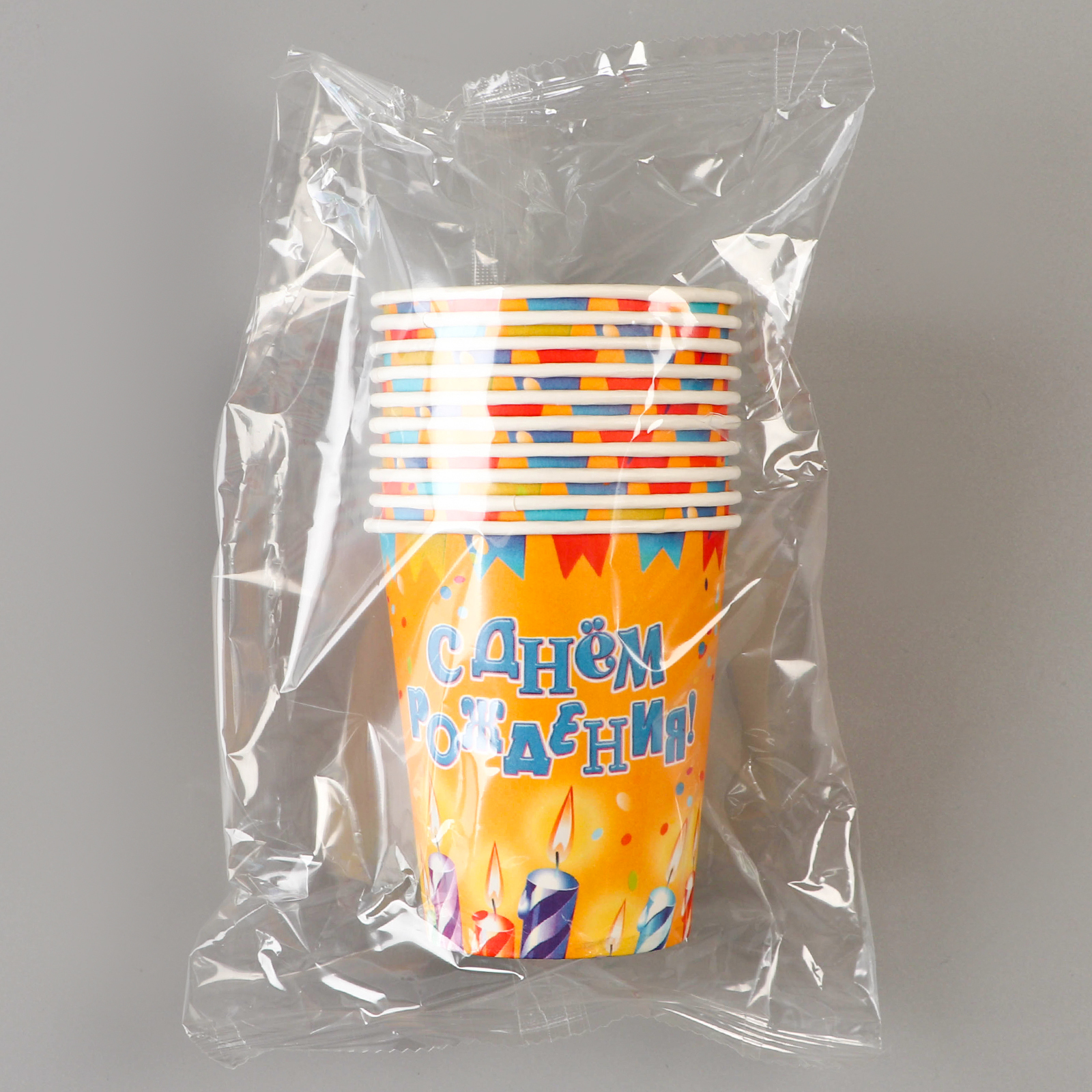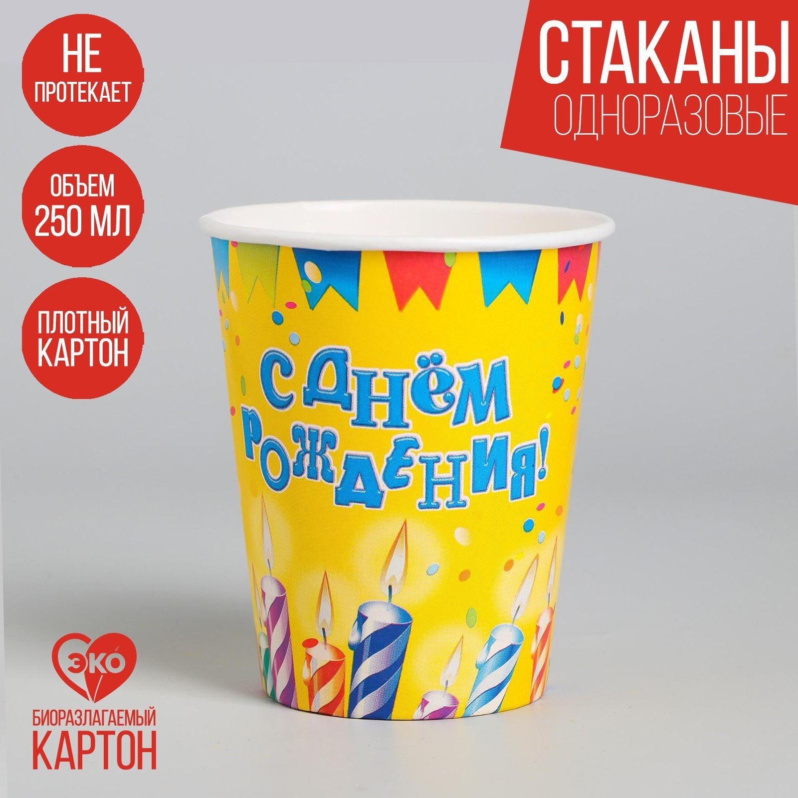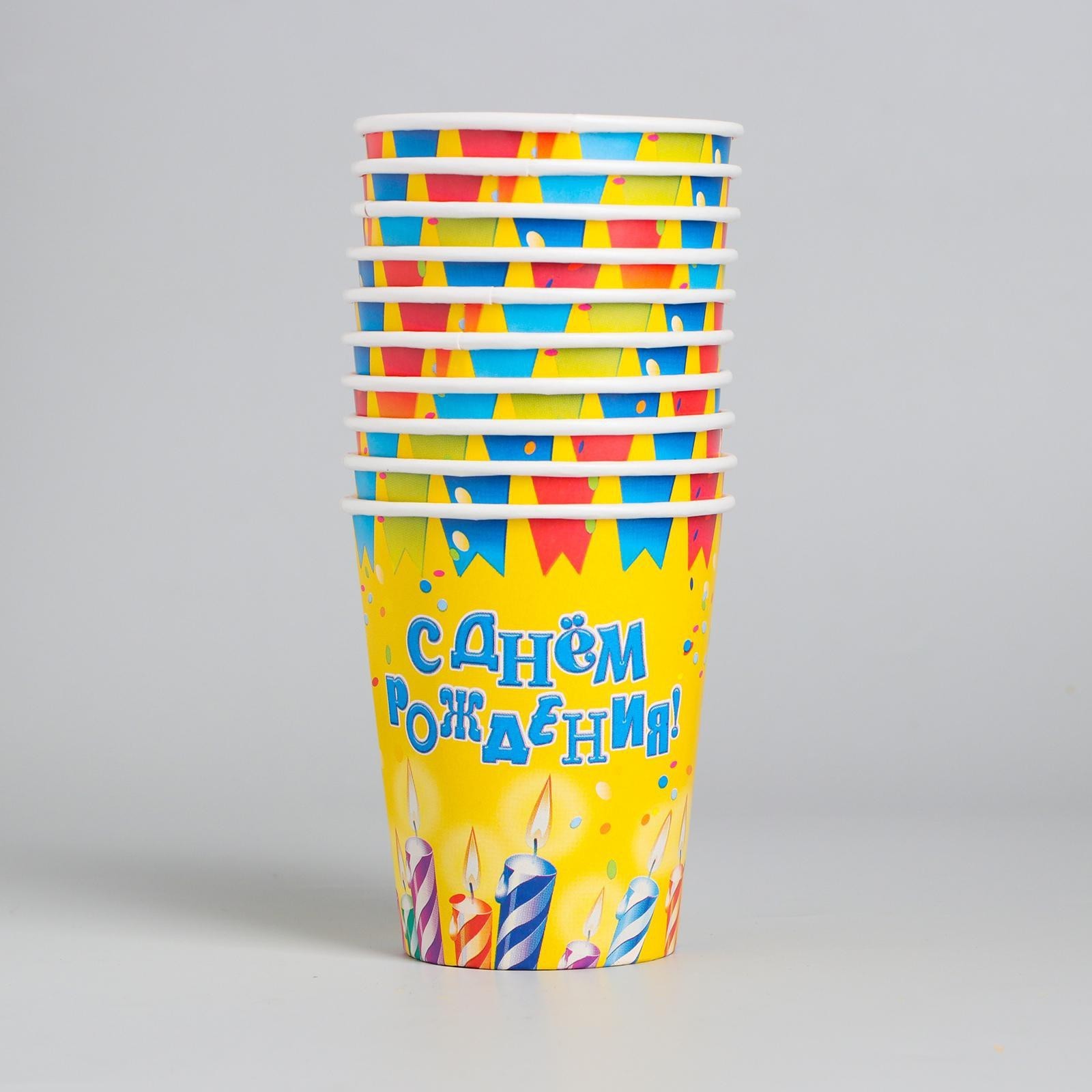 Стакан одноразовый бумажный "с днем рождения"свечи и гирлянды 250 мл