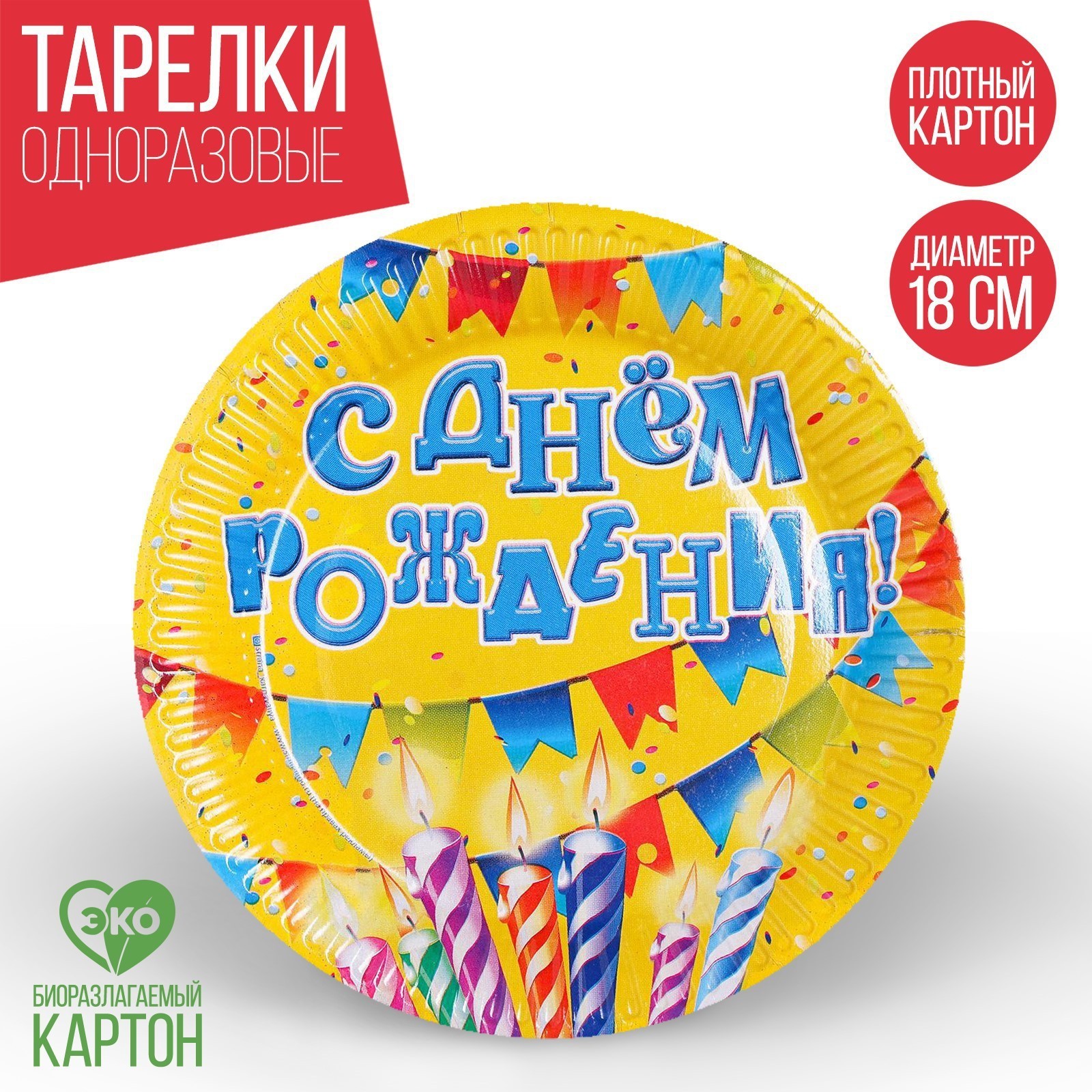 Тарелка одноразовая бумажная "с днем рождения" свечи и гирлянда (18 см)