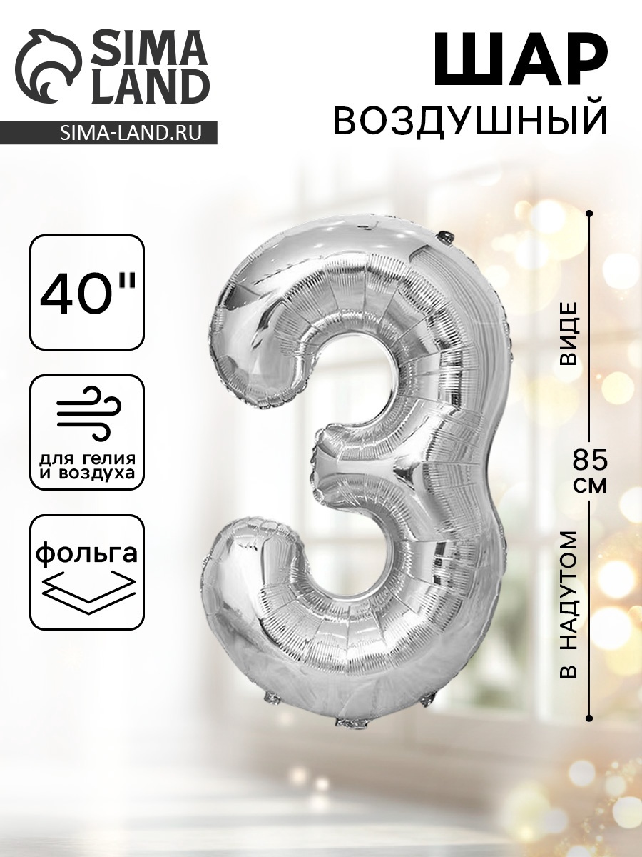 Воздушный шар фольгированный 40 «цифра 3». Если шар, то обязательно круглыйx Вовсе нет! Яркий и лёгкий воздушный шар фольгированный 40 «Цифра 3» создаст атмосферу праздника и станет выразительным дополнением к подарку. Огромная цифра поразит своими размерами, особенно маленьких детишек. Великолепный серебристый цвет придаст сказочный вид любому событию. У шарика есть специальные отверстия: два сверху и два снизу. Если надули его гелием, то проденьте верёвочку через нижние дырочки, и он всегда будет стремиться ввысь. А цифру, наполненную воздухом, подвесьте за верхние ушки. К тому же у такого шарика есть обратный клапан (не требует запайки), а значит, вы можете наслаждаться им сразу после надувания. Набор:Нет|Цвет:Серебристый|Диаметр, дюйм:40|Рисунок:Нет|Тематика праздника:Универсальная тематика|Материал:Фольга|Тематика рисунка:Без рисунка|Вид шара:Цифра|Наличие клапана:Да|Цифра:3|Надувка шара:Воздухом|Надувка шара:Гелием|Индивидуальная упаковка:Да|Язык надписи:Без надписи|Оттенок:Металл|Страна:Китай  развернуть описание ▼
