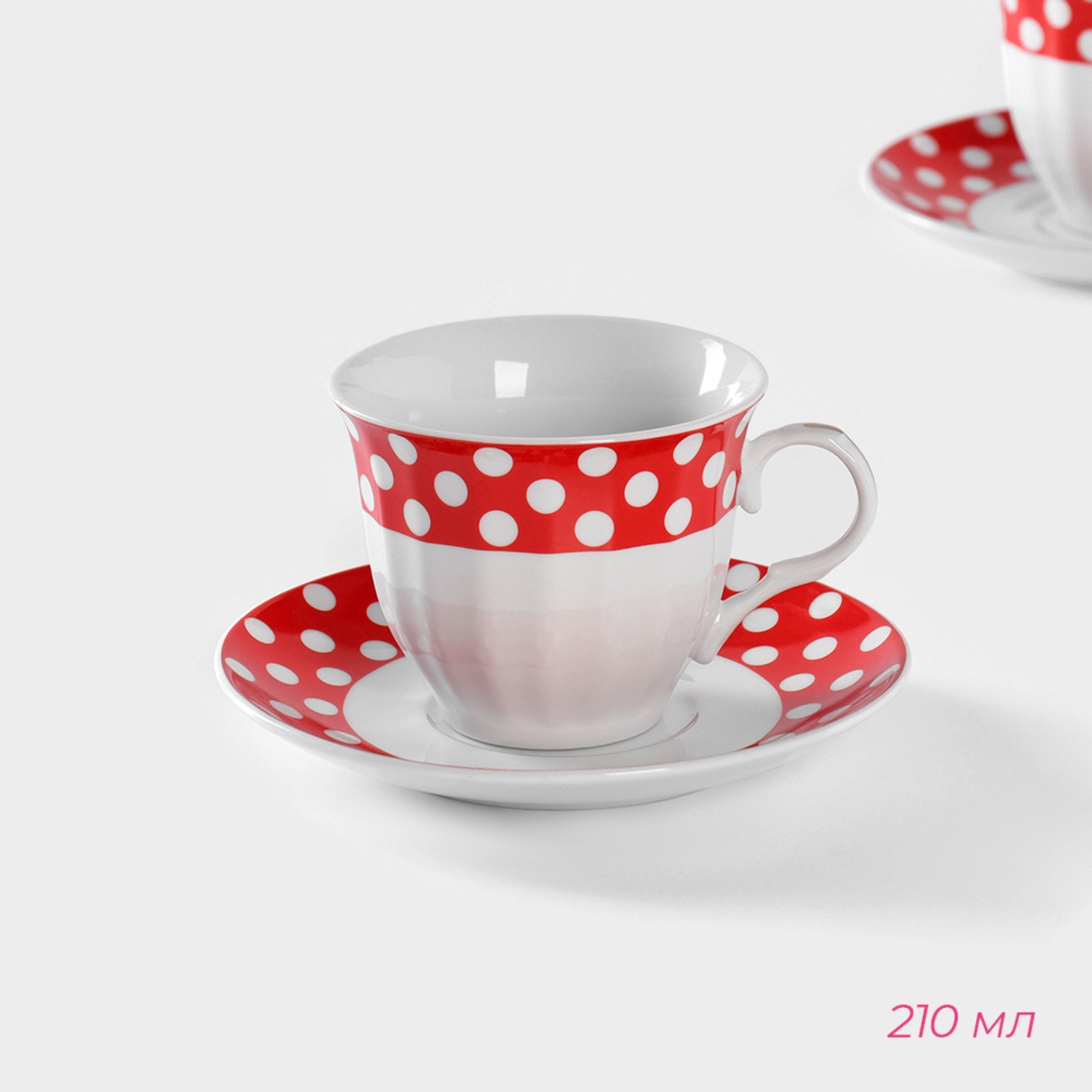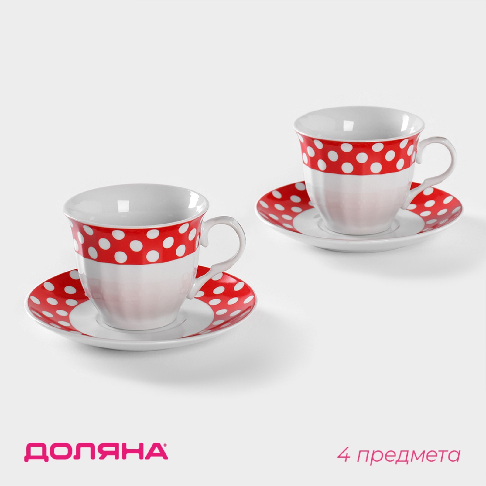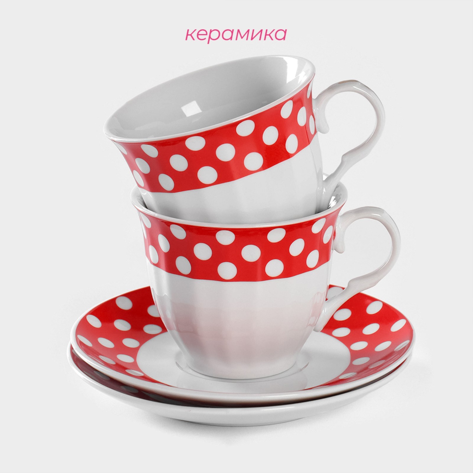 Сервиз чайный керамический доляна «горох», 4 предмета: 2 чашки 210 мл, 2 блюдца D=14 см, цвет красный