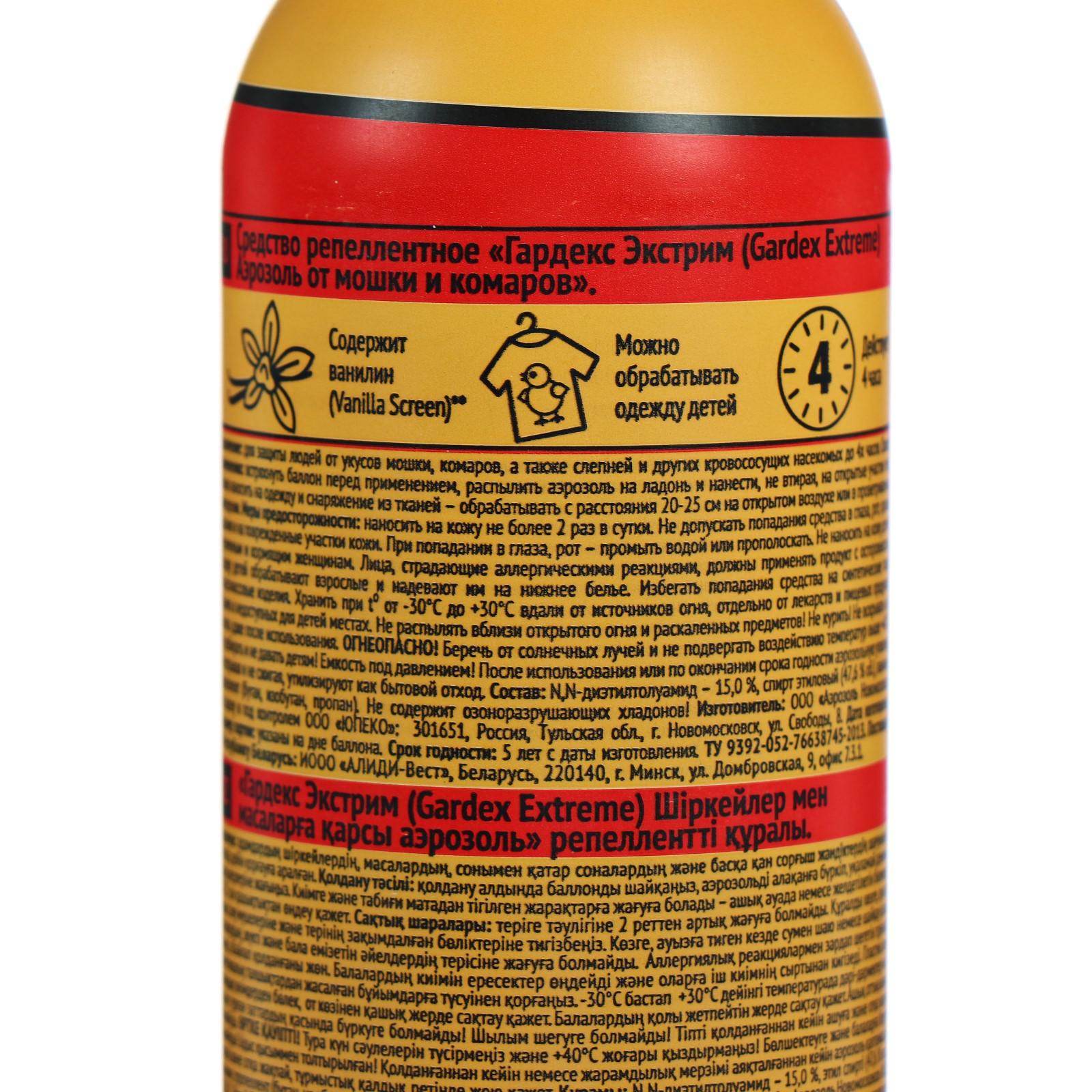 Аэрозоль репеллентный от комаров и мошек "gardex extreme", 2 в 1, 100 мл. Аэрозоль репеллентный "Gardeх Eхtreme", 2 в 1, от комаров и мошек, 100 млАэрозоль от торговой марки Gardeх обеспечит надёжную защиту от укусов мошек, комаров, слепней, мокрецов и москитов. Распыляйте средство на открытые участки кожи, одежду и снаряжение из натуральных тканей. Состав: диэтилтолуамид, спирт этиловый, ванилин, бутан, изобутан, пропан. Особенности препарата:* содержит ванилин — эффективное вещество против мошек;* действует в течение 15 дней. Вид средства: Аэрозоль Назначение: От комаров Тип средства: Репеллент  развернуть описание ▼
