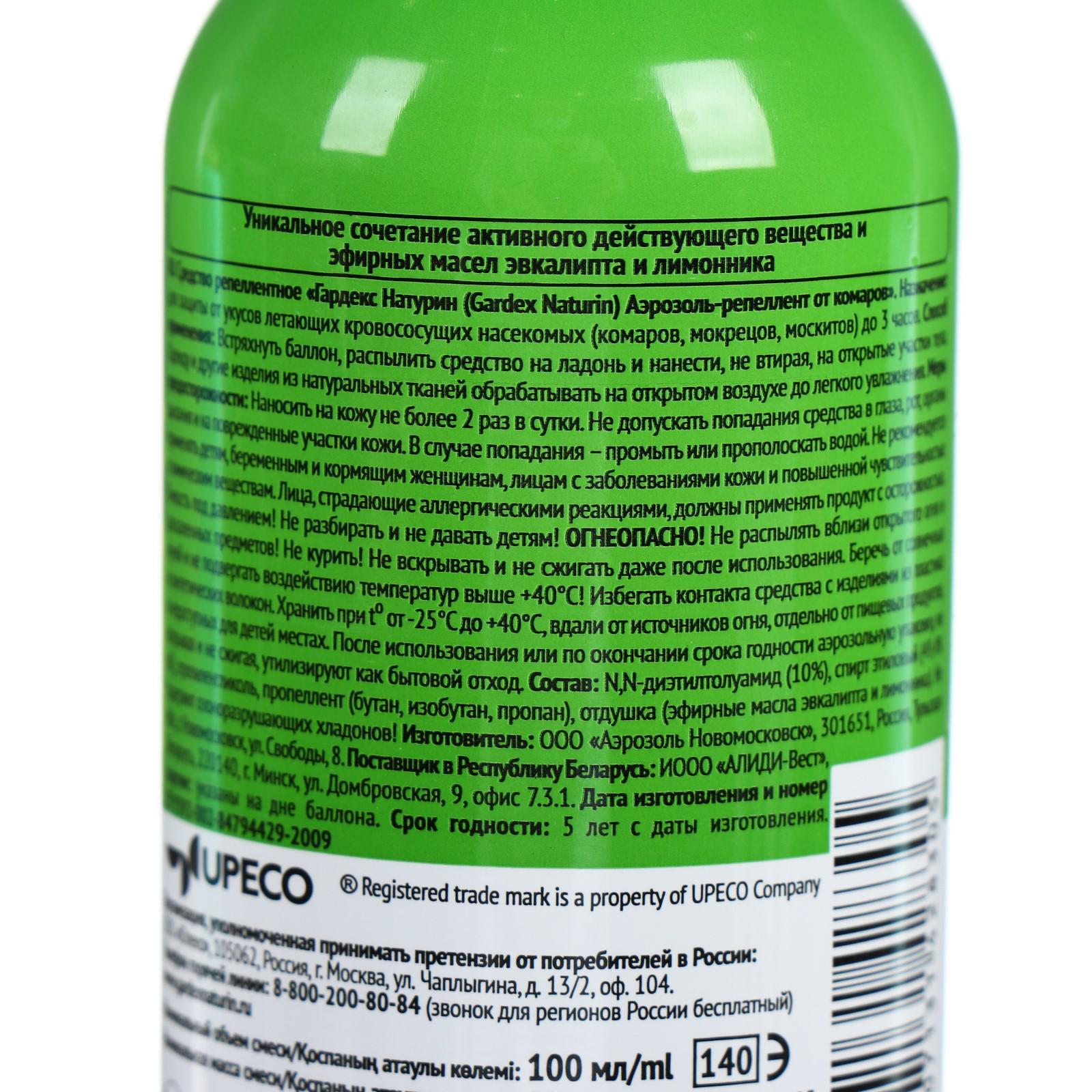 Аэрозоль-репеллент от комаров gardex naturin, 100 мл. СоставN, N-диэтилтолуамид - 10%, спирт этиловый, бутан, изобутан, пропан, отдушка (эфирные масла эвкалипта и лимонника)Способ использованияВстряхнуть баллон, распылить средство на ладонь и нанести, не втирая, на открытые участки тела. Одежду и другие изделия из натуральных тканей обрабатывать на открытом воздухе до легкого увлажнения. ОписаниеЗащищает от укусов комаров, мокрецов и москитов. Время защиты – до 3 часов при нанесении на кожу, 3 суток – при нанесении на одежду. Возможно повторное нанесение, но не чаще 2 раз в сутки или после стирки. Содержит эфирные масла репеллентных растений: лимонника и эвкалипта. Вид средства: Аэрозоль Назначение: От комаров Тип средства: Репеллент  развернуть описание ▼