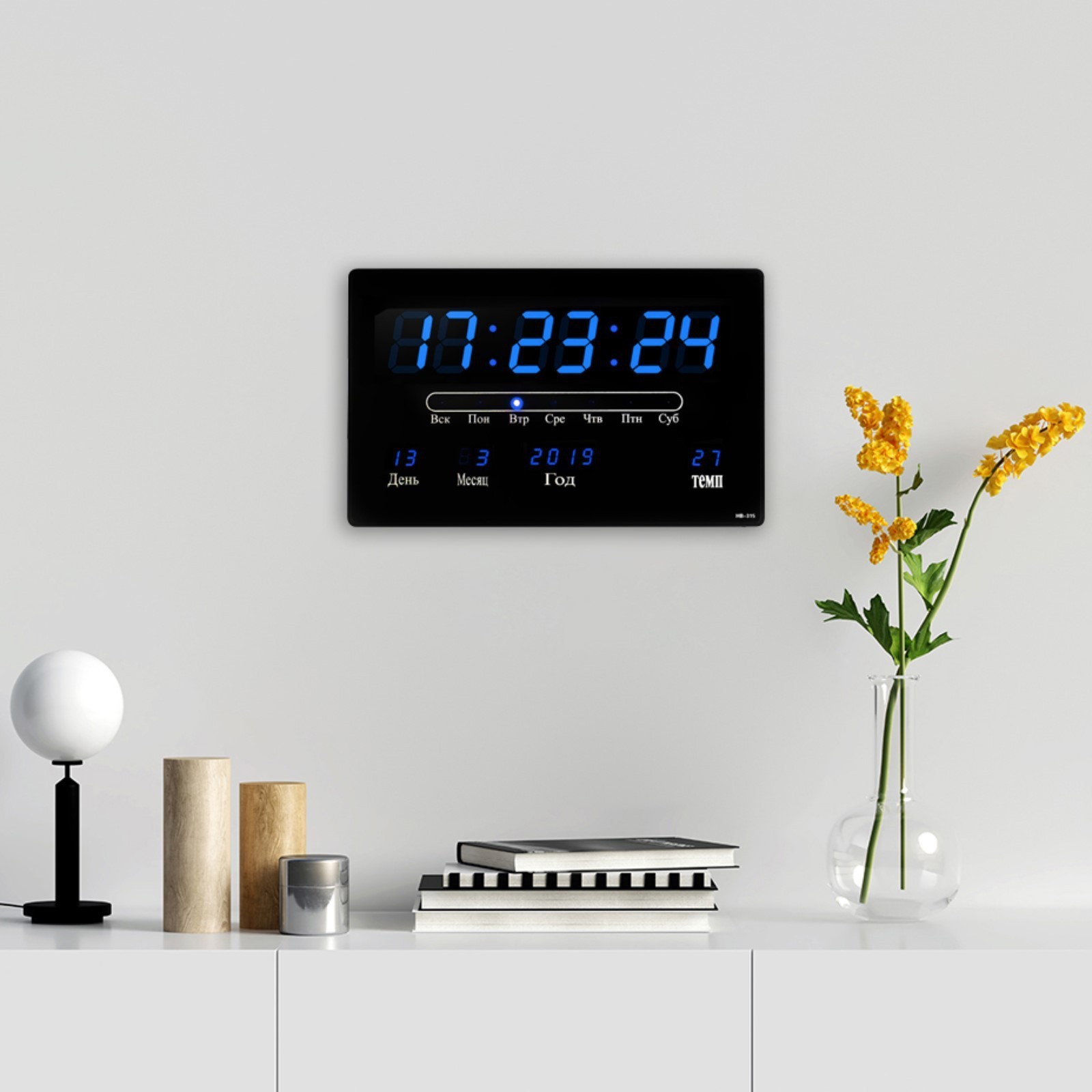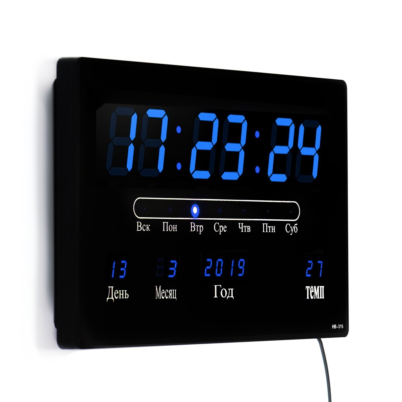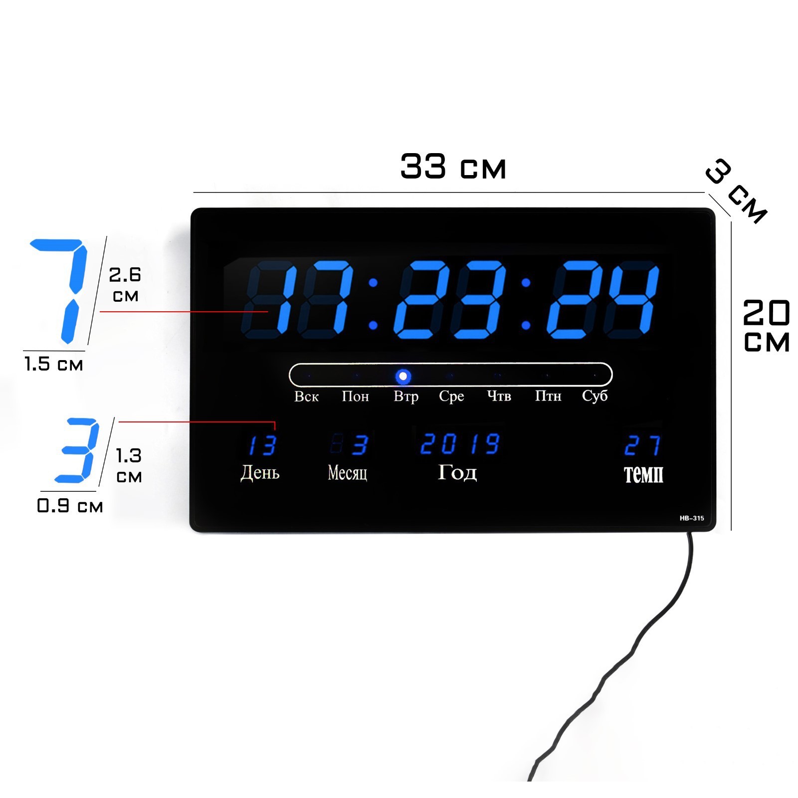Часы электронные настенные, будильник, календарь, термометр, 20 х 3 х 33 см, синяя индикация, черные. Имеют функции календаря, термометра и будильника12-24 часовой форматМатериал: пластик, стеклоРазмеры: 20 х 3 х 33 смДлина шнура 180 см.Тип питания:От сети 220 В|Тип питания:От USB|Цвет:Чёрный|Форма:Прямоугольная|Размер, см:33 х 20|Ширина, см:33|Высота, см:20|Материал:Пластик|Материал:Стекло|Вид установки:Настенный (навесной)|Подсветка:Да|Цвет корпуса:Чёрный|Цвет индикации:Синий|Особенности:С термометром|Особенности:С календарём|Особенности:С будильником|Страна:Китай  развернуть описание ▼