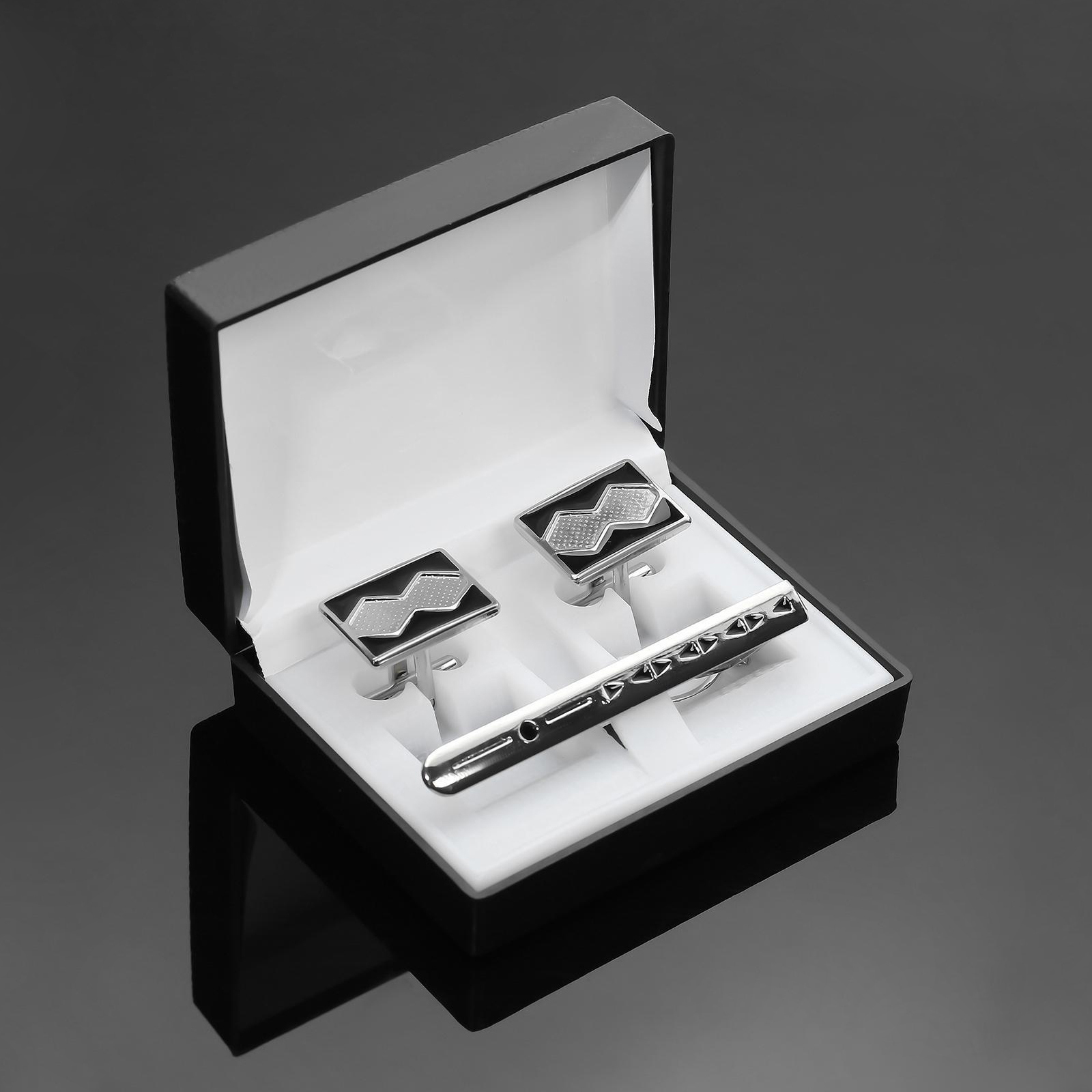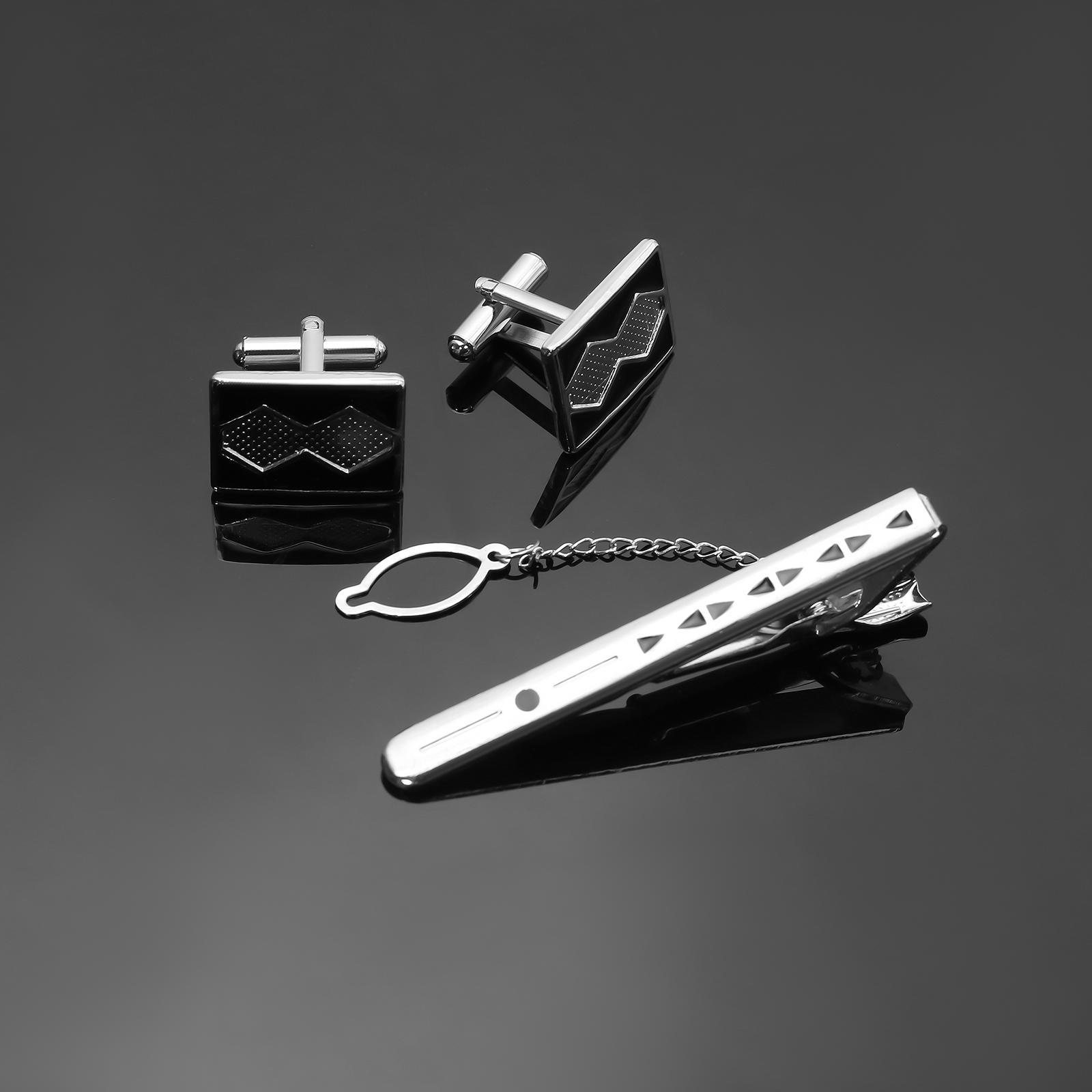 Набор мужской медный «запонки + зажим для галстука» прямоугольник с ромбами, чёрный в серебре