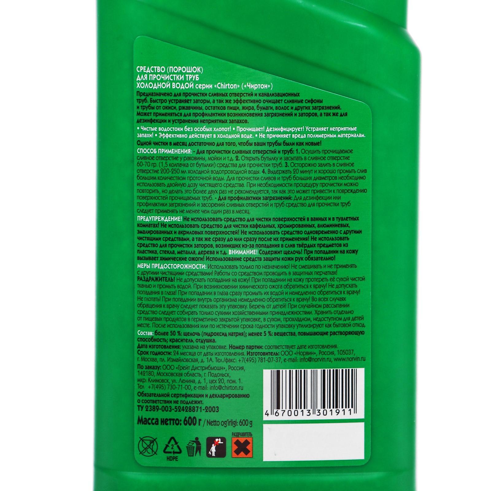 Средство для прочистки труб холодной водой в гранулах Chirton, в пластиковой бутылке, 600 г