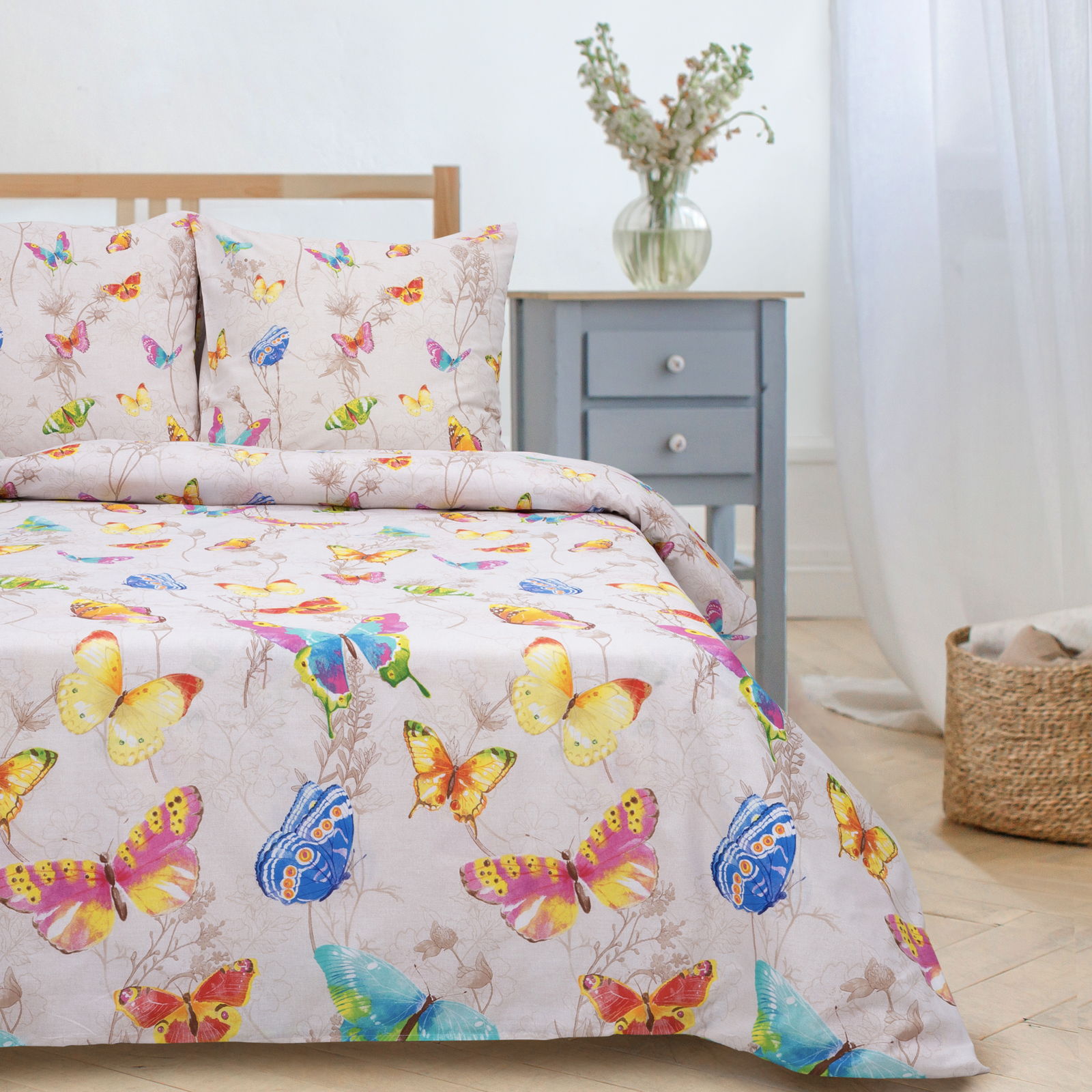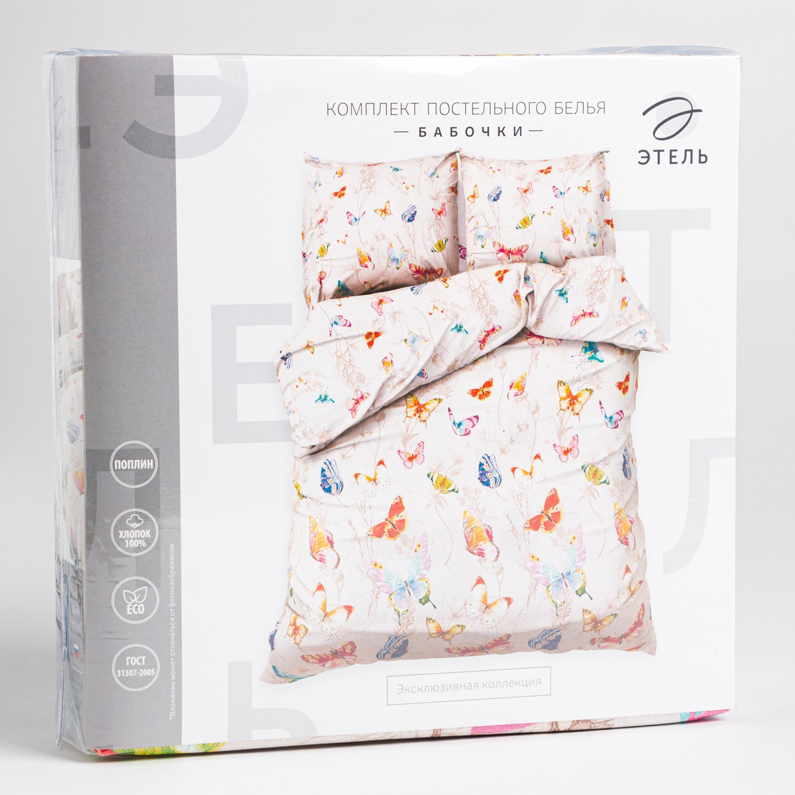 Постельное бельё 1.5-спальное «этель. бабочки», поплин. Постельное бельё «Этель: поплин» создано специально для тех, кто привык окружать себя комфортом и стремится внести в свою жизнь как можно больше ярких красок. Чем хорош поплинx Данный материал — удивительно мягкая, тонкая и одновременно очень прочная ткань. Он отличается благородным матовым блеском, который достигается за счёт особой технологии производства: в качестве основы выступают тончайшие хлопковые нити, а горизонтальные берутся в два раза толще. Постельное бельё из поплина отлично поддаётся окрашиванию, а потому сохраняет насыщенность цвета долгое время. Кроме того, оно хорошо пропускает воздух, легко стирается и разглаживается. Особенности постельного белья Изделия изготовлены из 100 % натурального экологически чистого хлопка. Плотность ткани составляет 125 г/м .Для нанесения рисунков использовались качественные европейские красители, а потому аллергия и раздражения пройдут мимо. Простыня без поперечного шва! Все внутренние швы дополнительно обработаны оверлоком, чтобы избежать естественного осыпания края. В комплекте: Наволочки с клапанами — 2 шт. Пододеяльник — 1 шт. Простыня — 1 шт. Рекомендации по уходу за изделиями: стирка при температуре не выше 40 °C без использования отбеливающих средств. Цвет:Бежевый|Размер наволочки, см:70 х 70|Ткань:Поплин|Плотность, г/м :125|Размер:1.5-спальное|На молнии:Нет|На резинке:Нет|Тематика:Цветочно-растительная|Вид упаковки:PVC-пакет|Тематика праздника:8 Марта|Декоративные элементы:Без элементов|Рекомендации по уходу:Стирка при 40 °С|Рекомендации по уходу:Не отбеливать|Рекомендации по уходу:Бережный режим глажки|Состав ткани:Хлопок|Количество наволочек:2|Режим стирки:При 40 градусах|Вид простыни:Стандартная|Отделка:Без отделки|Размер пододеяльника, см:143 х 215|Размер простыни, см:150 х 214|Простыня в комплекте:Да|Особенности простыни:Стандартная|Вид застёжки наволочки:Клапан|Вид застёжки пододеяльника:Без застёжки|Страна:Россия  развернуть описание ▼