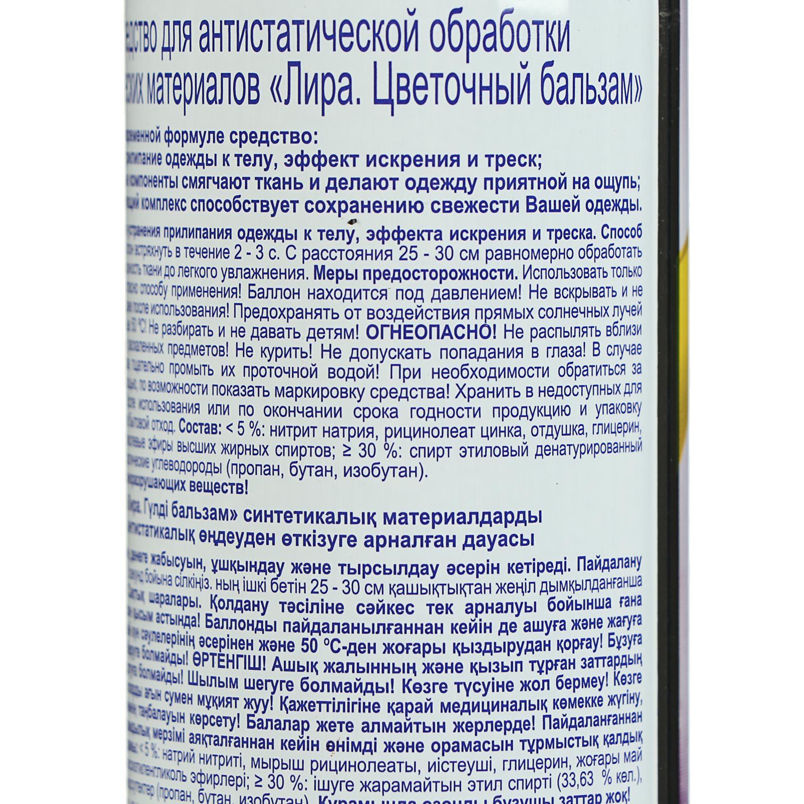 Антистатик лира «цветочный бальзам», 200 мл. Антистатик Лира представляет собой средство, созданное для борьбы с статическим электричеством на поверхности различных материалов. Этот антистатик помогает предотвратить неприятные электростатические разряды, которые могут возникать при носке одежды или использовании текстильных изделий. Благодаря своей формуле, антистатик Лира обеспечивает эффективную защиту от статического электричества, делая поверхности гладкими и приятными на ощупь.