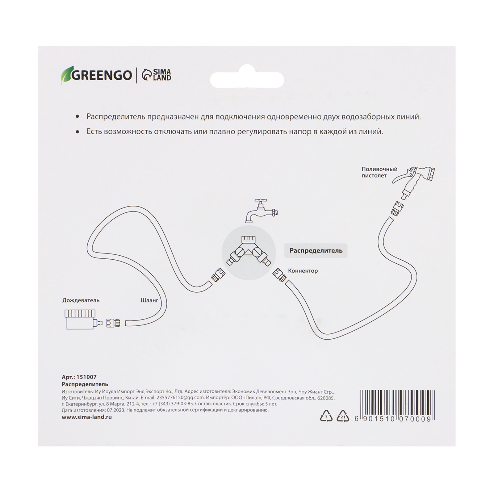 Распределитель 2-канальный, внутренняя резьба 3/4, быстросъёмное соединение, пластик, Greengo