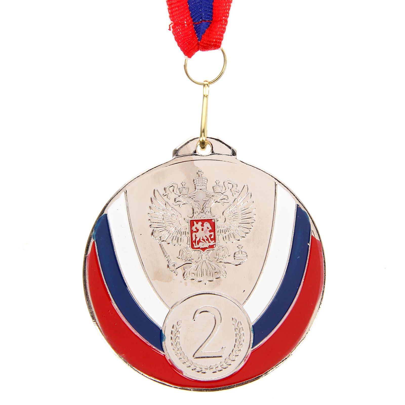Медаль призовая 050, d= 4,5 см. 2 место, триколор. цвет серебро. с лентой. Медаль — знак отличия, которым награждают самых достойных. Она вручается лишь тем, кто проявил настойчивость и волю к победе. Каждое достижение — это важное событие, которое должно остаться в памяти на долгие годы. Любое спортивное состязание, профессиональное или среди любителей, любое корпоративное мероприятие — отличный повод для того, чтобы отметить лучших из лучших. Цвет: Серебристый Для кого: Унисекс Диаметр, мм: 70 Вид упаковки: Пакет Адресат: Без адресата Материал: Металл Вид спорта: Универсальный Наличие символики РФ: Да Наличие ленты: Да Призовое место: 2 место  развернуть описание ▼
